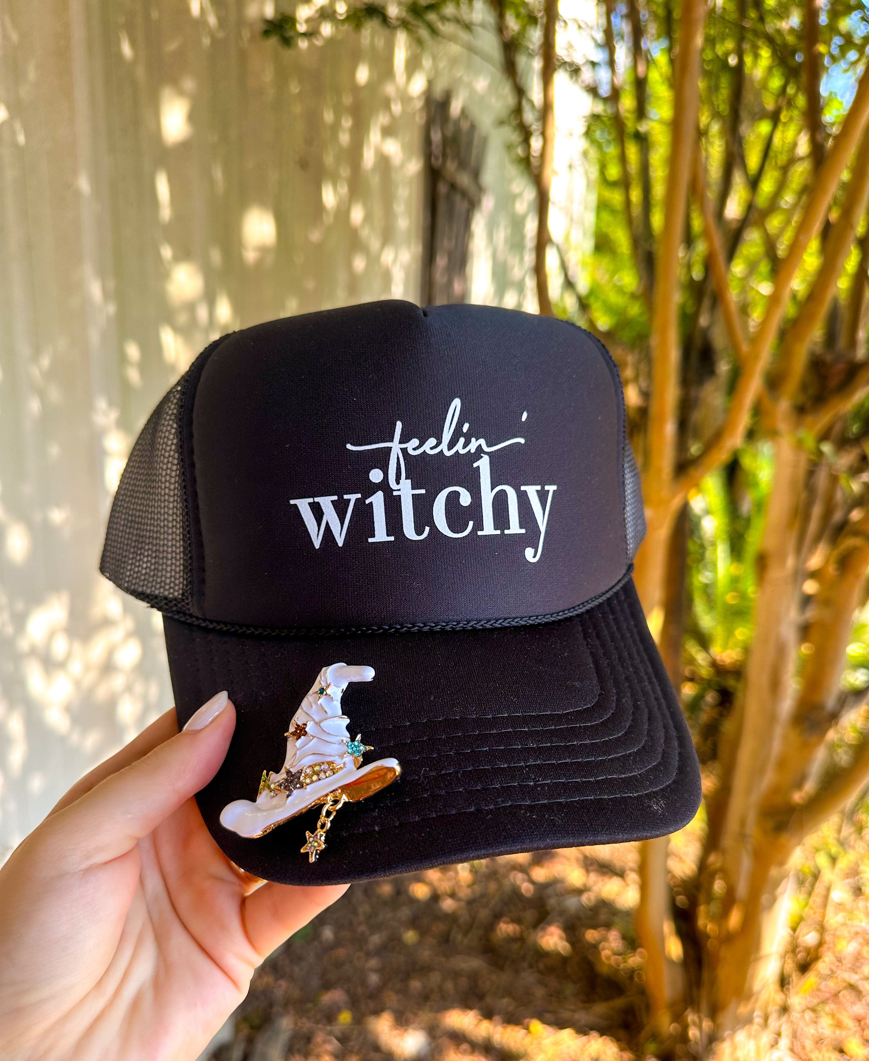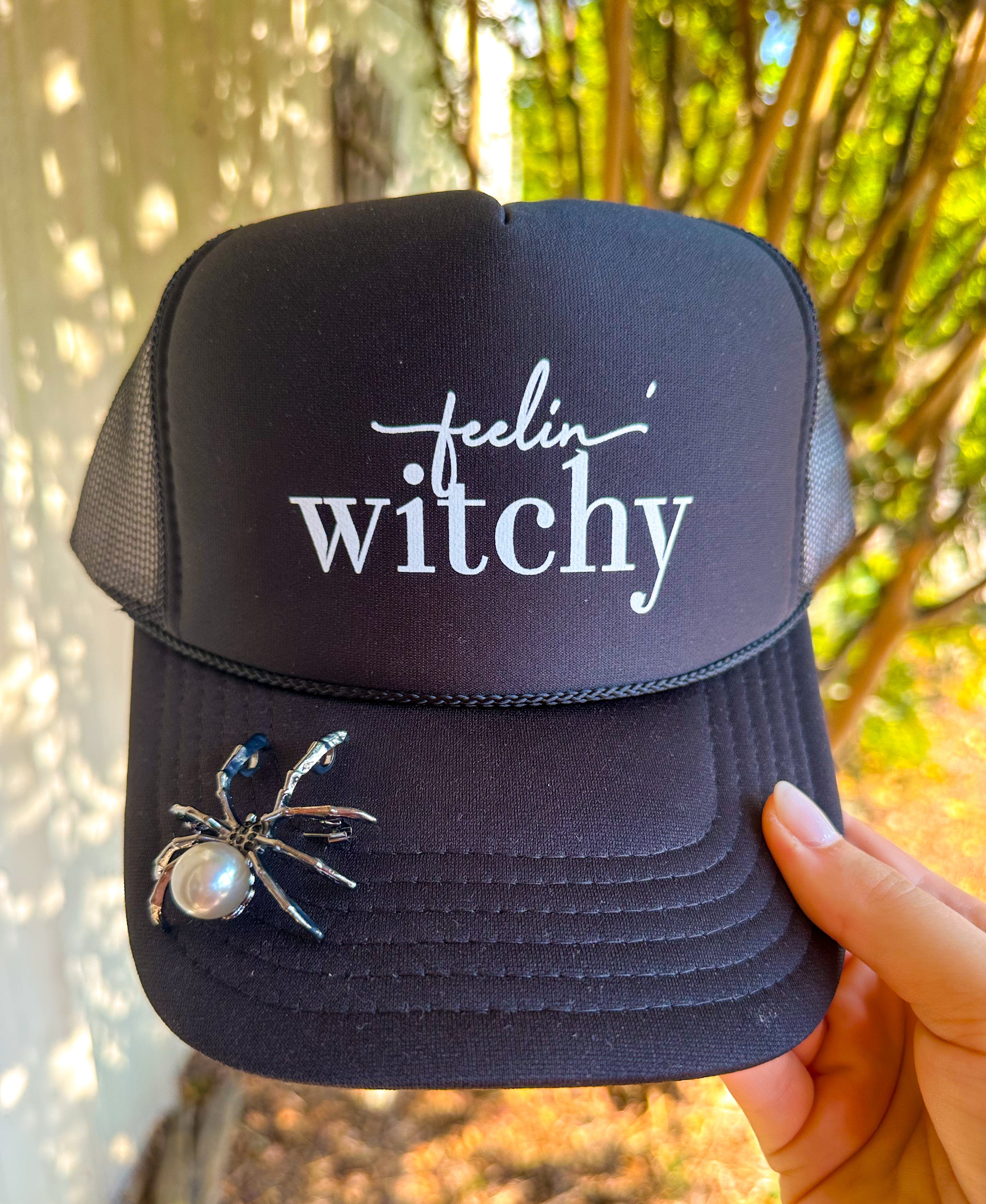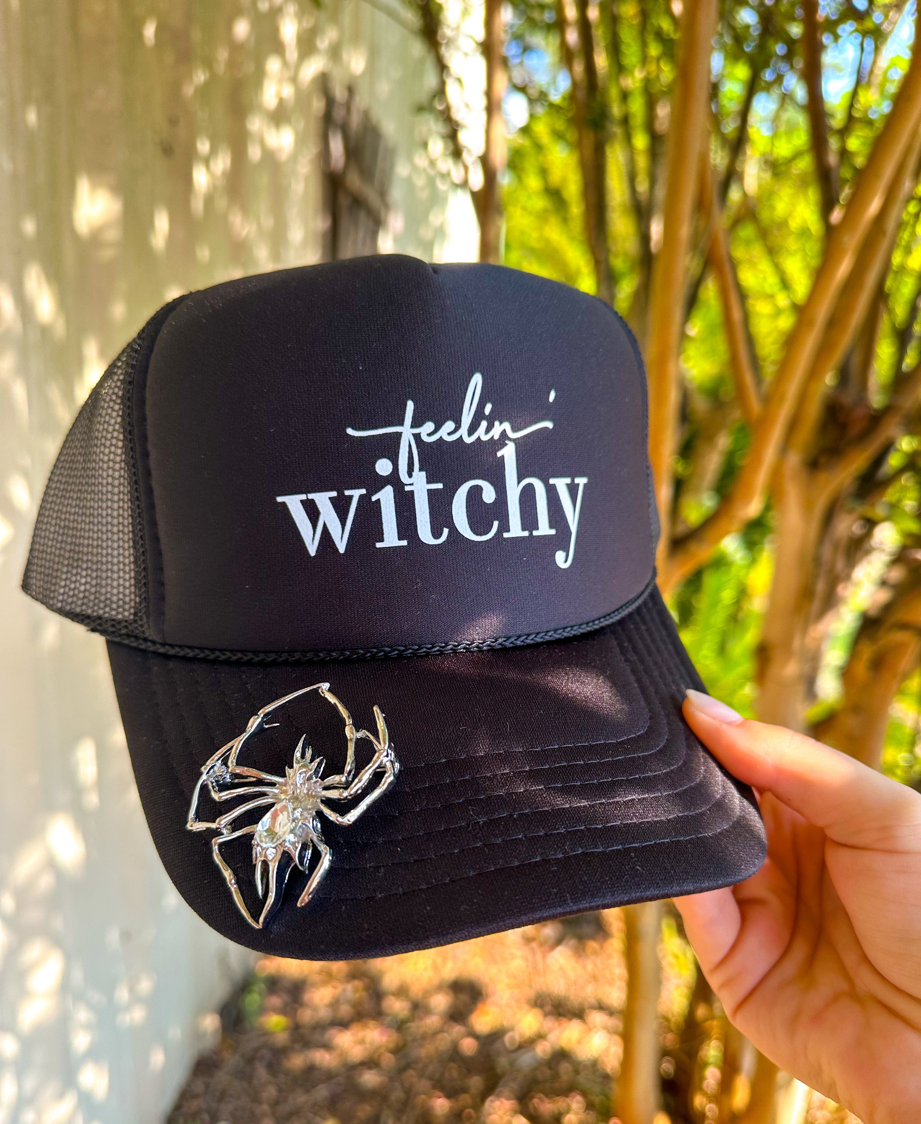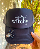 Get into the Halloween spirit with the Feelin Witchy Black Trucker hat, featuring a cute spider pin accessory that adds just the right amount of spooky charm. This playful hat is perfect for anyone ready to show off their magical side with a fun, festive flair!