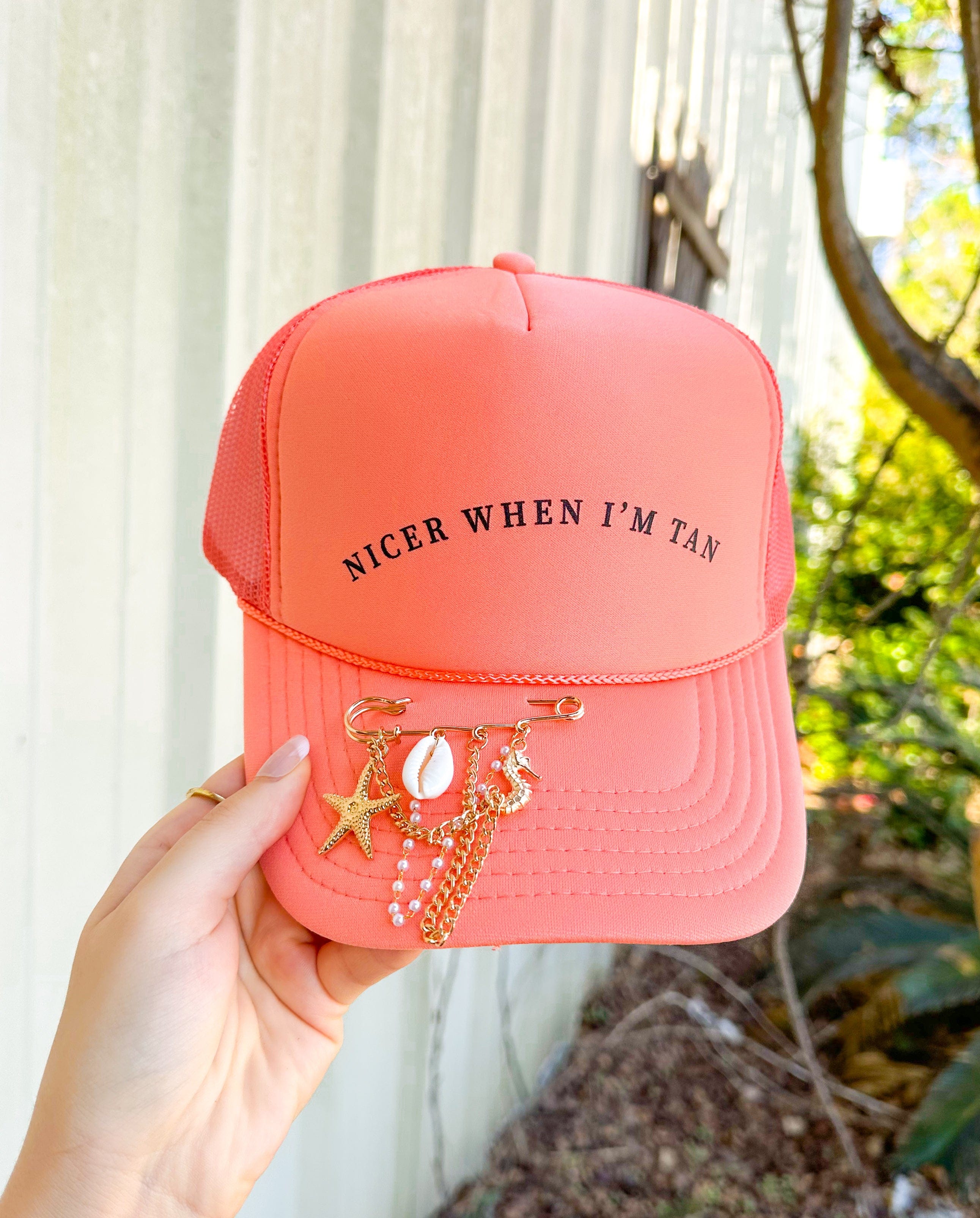 Nicer When I’m Tan Coral Trucker With Charm Pin