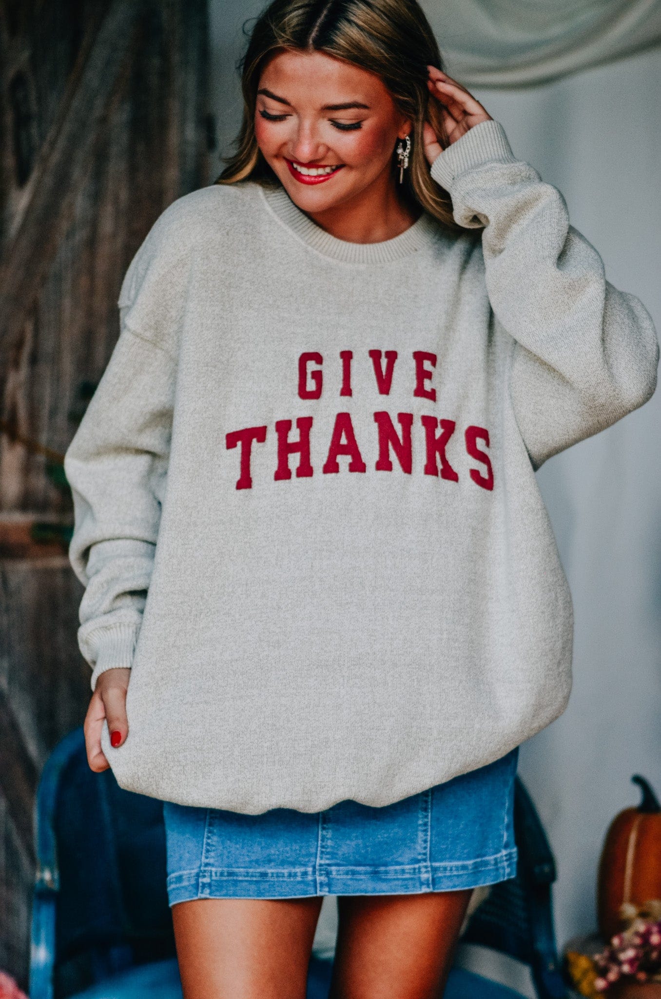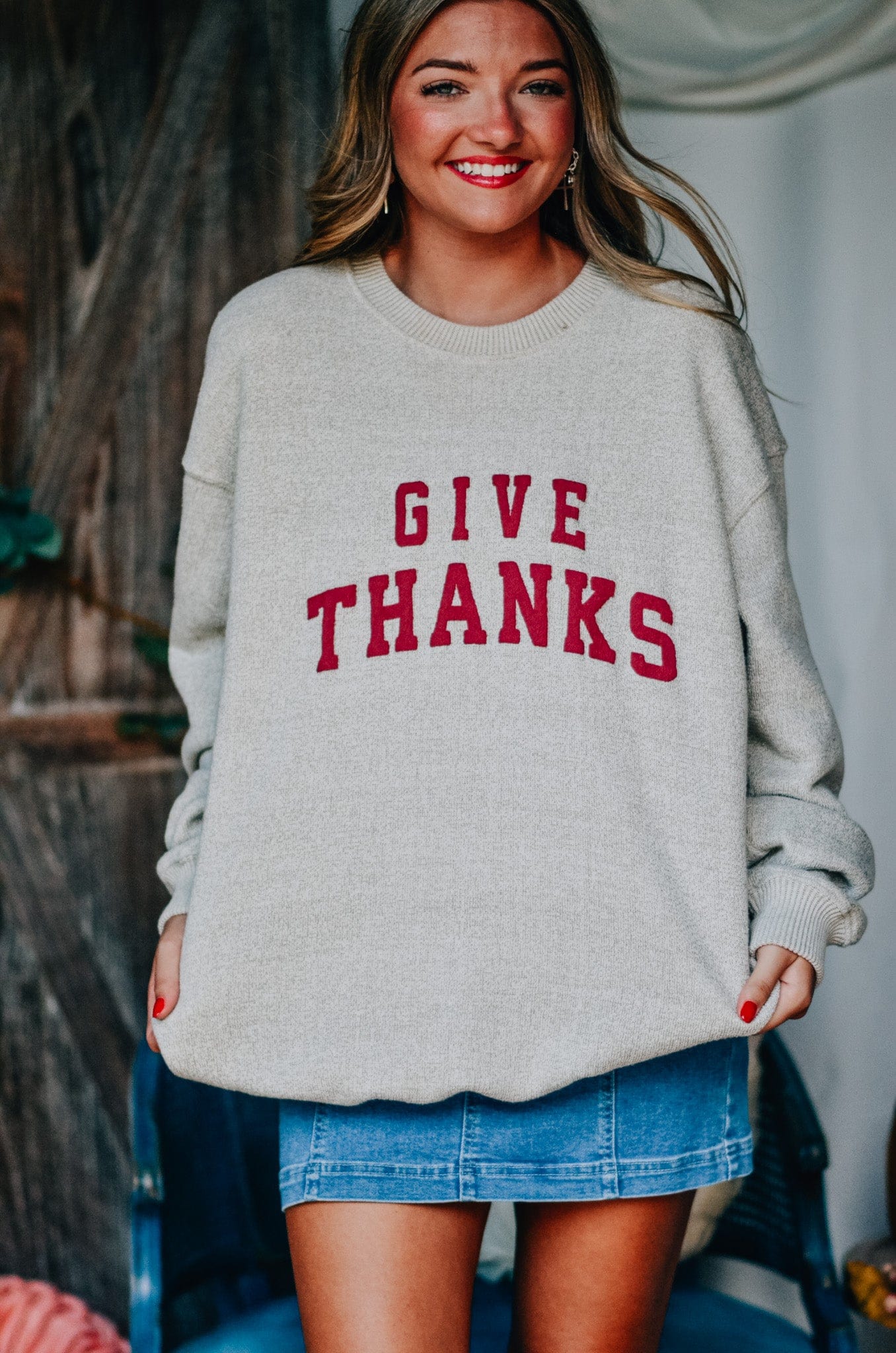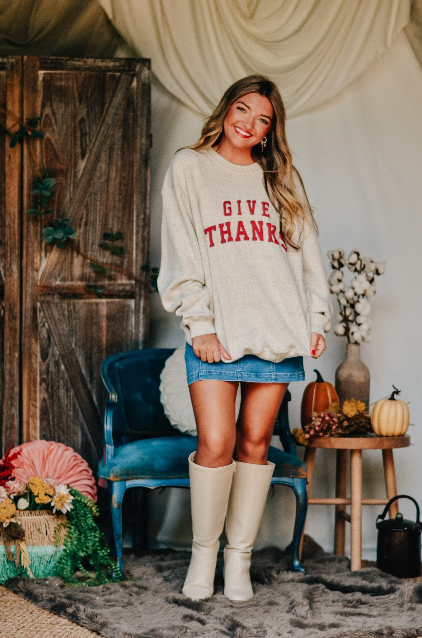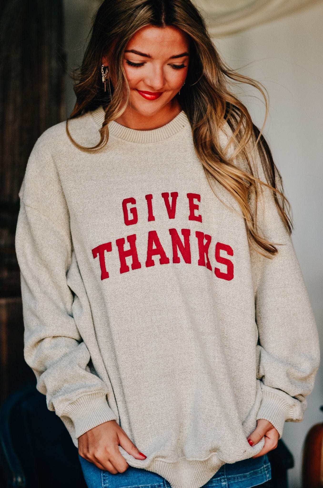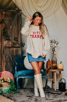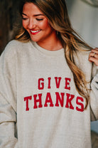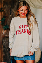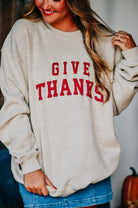 Soft, warm, and ready for fall — this oatmeal-colored knit sweatshirt features “Give Thanks” in cozy puff ink for the perfect touch of seasonal charm. Designed in a unisex mid-weight crewneck silhouette, it's crafted from a textured cotton blend and finished with ribbed cuffs and waistband for that classic, comfy fit.