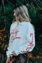 Spread holiday cheer in style with our Jolly Season sweatshirt. Featuring bold red script across the front and festive candy cane + bow graphics down both sleeves, this sweatshirt is merry, bright, and oh-so-cozy.