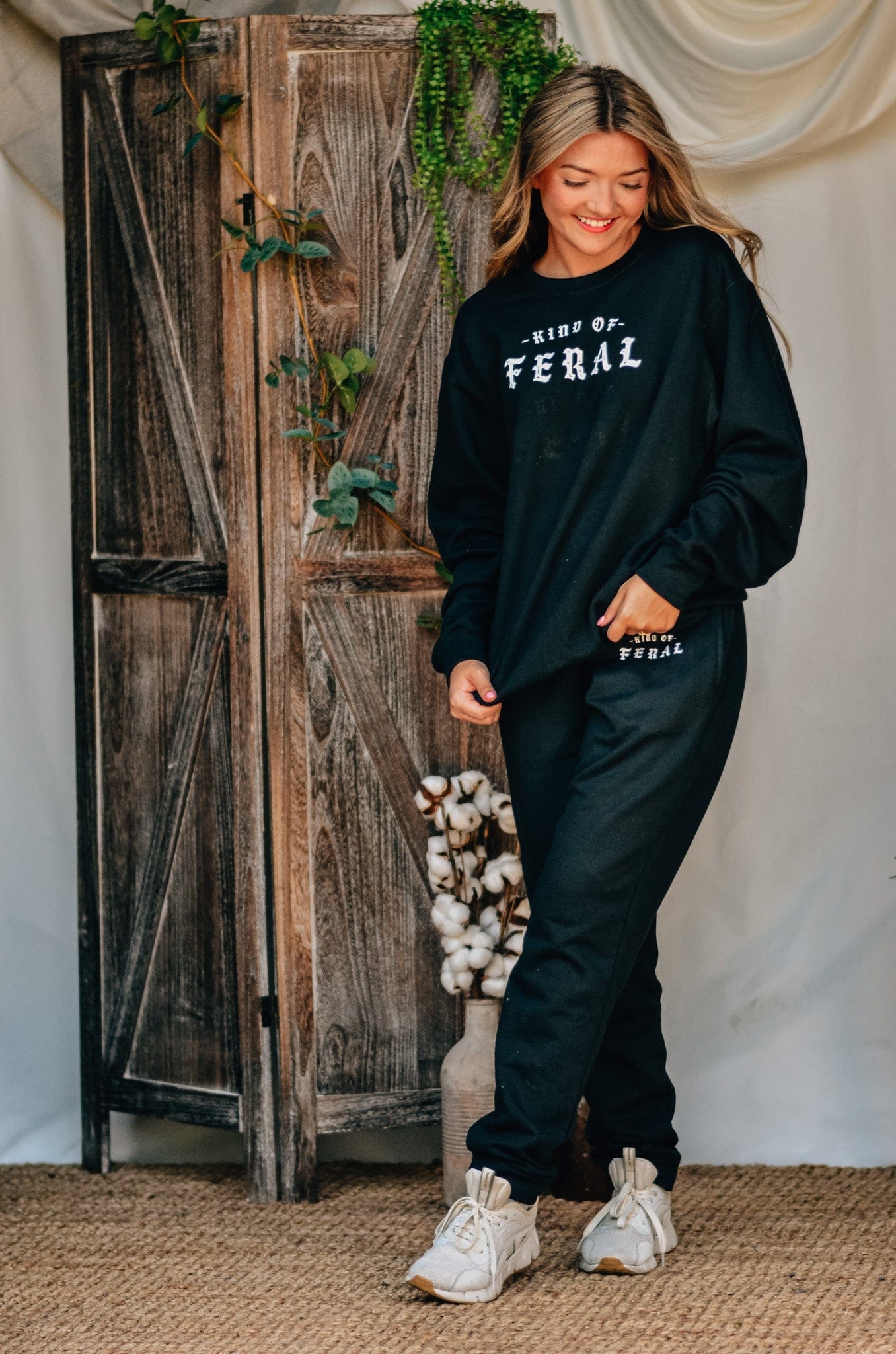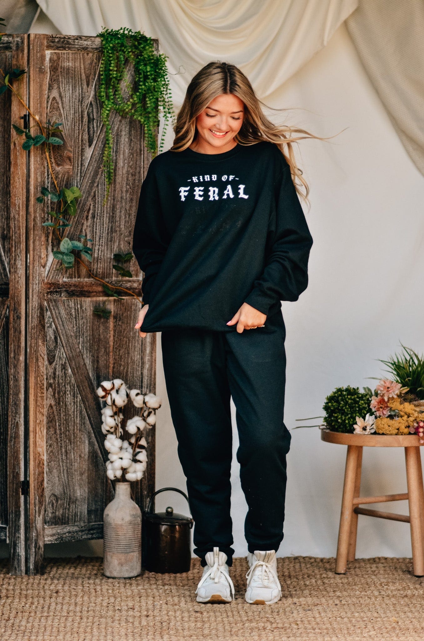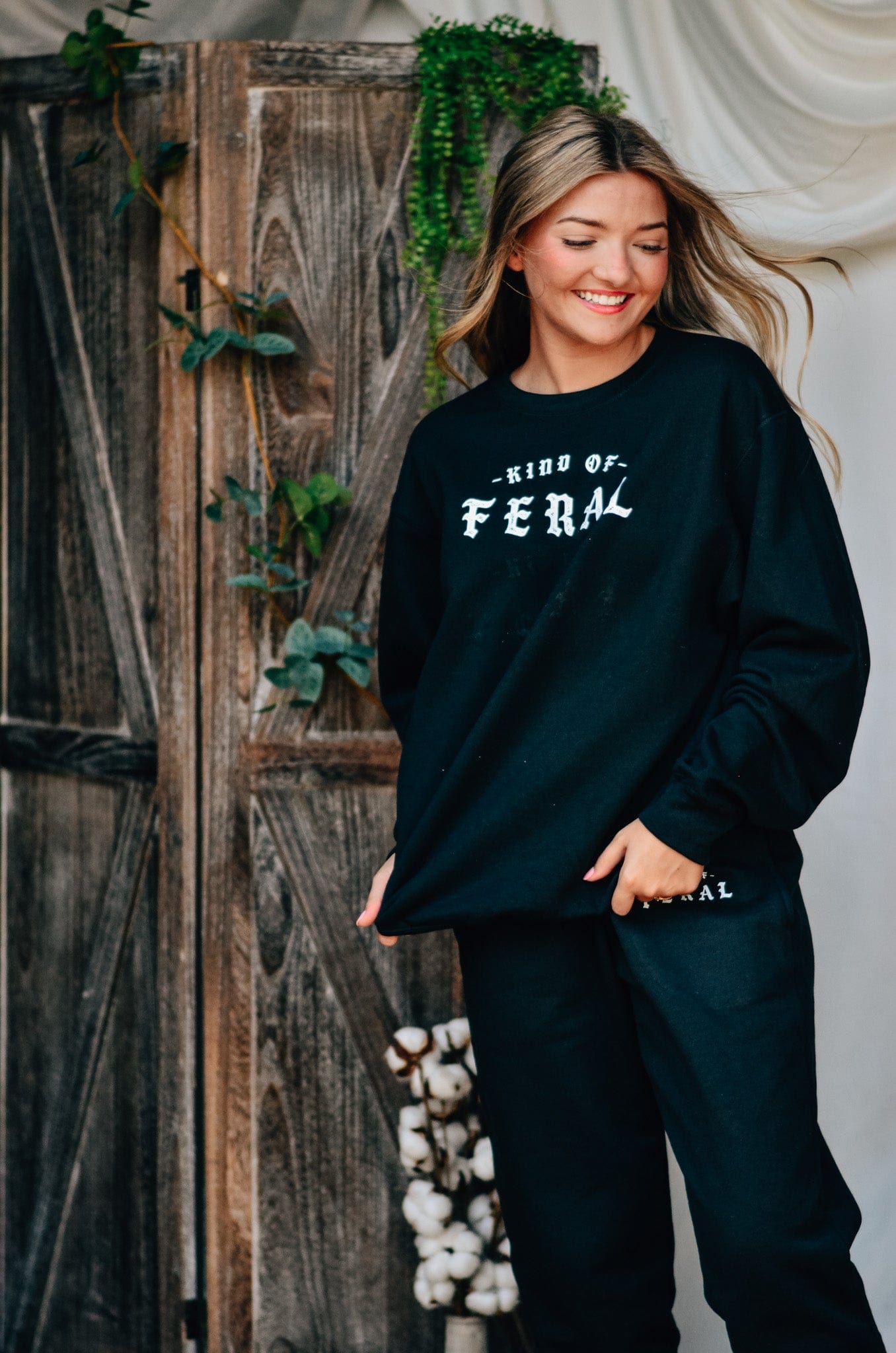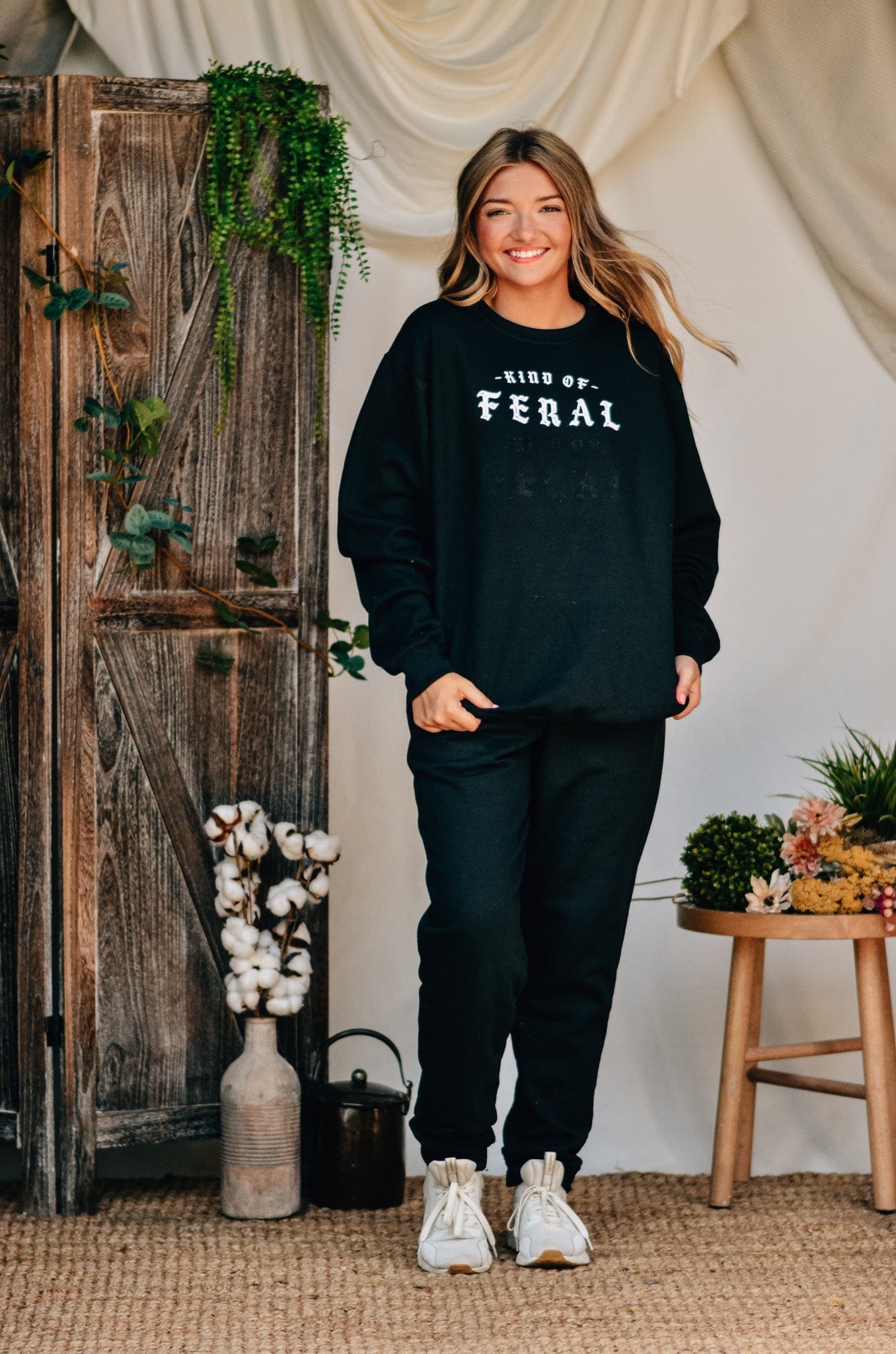For the girls who look put together but still might bite. The Kind of Feral sweatshirt is soft, oversized, and just a little unhinged—in the best way. Bold white lettering pops against black fleece for that effortlessly edgy vibe.