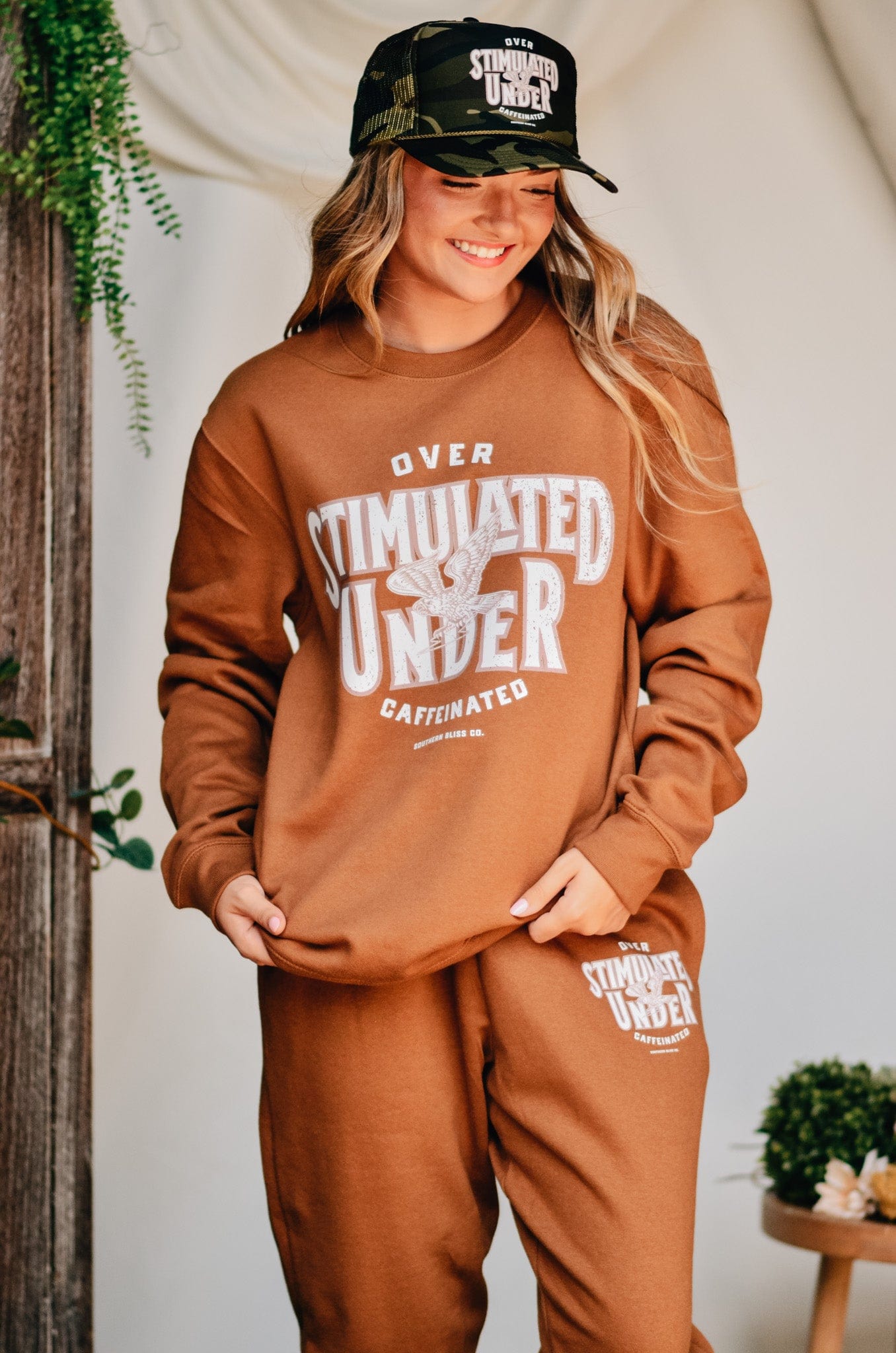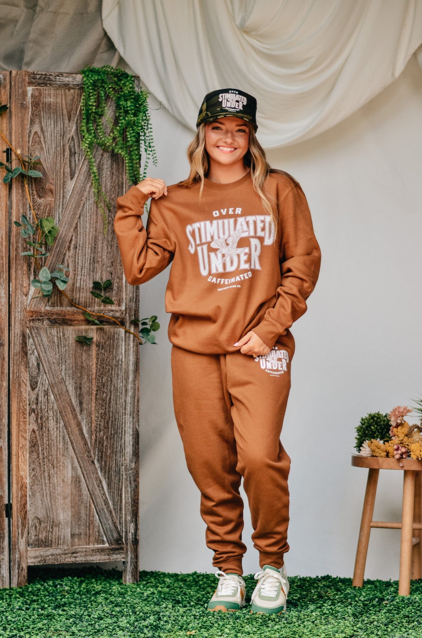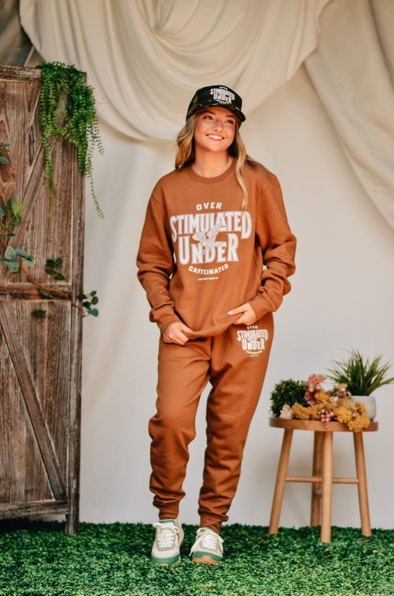 For the girl who’s doing the most on zero caffeine—this warm caramel fleece sweatshirt says it all: “Overstimulated, under-caffeinated.” Comfy, oversized, and made for chaos. Snag the matching joggers for a full fit that gets you.