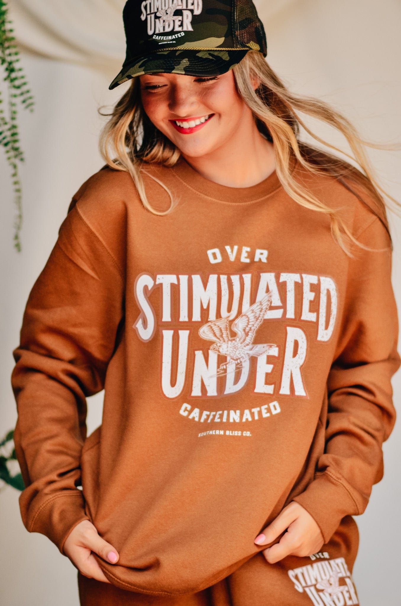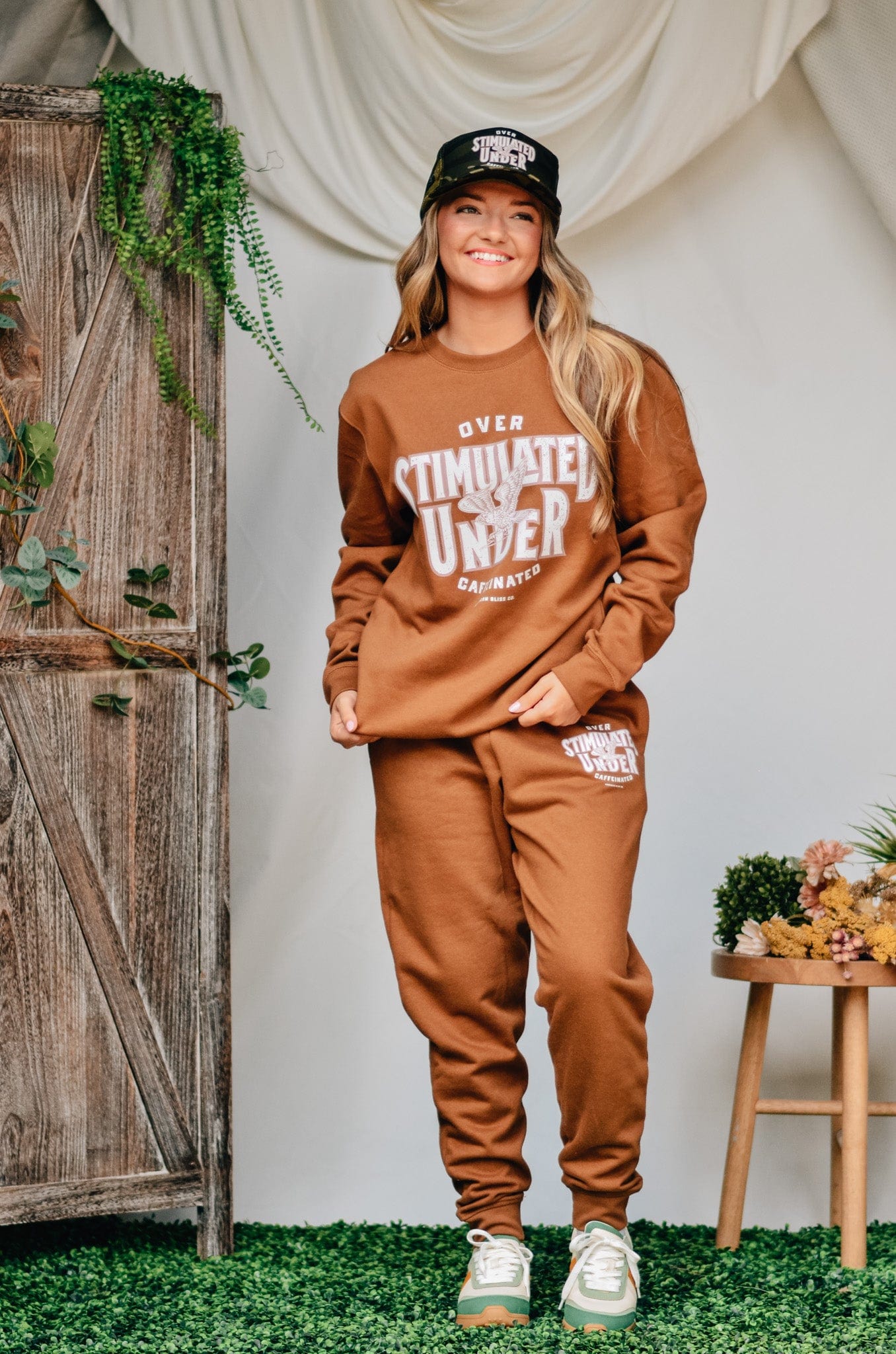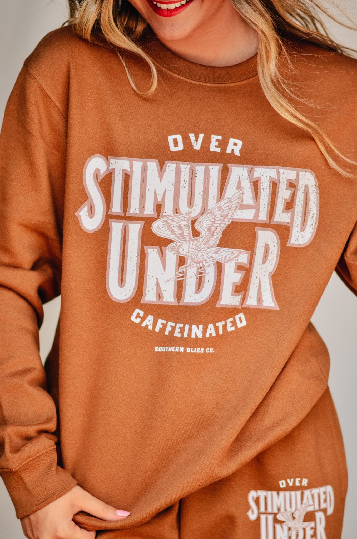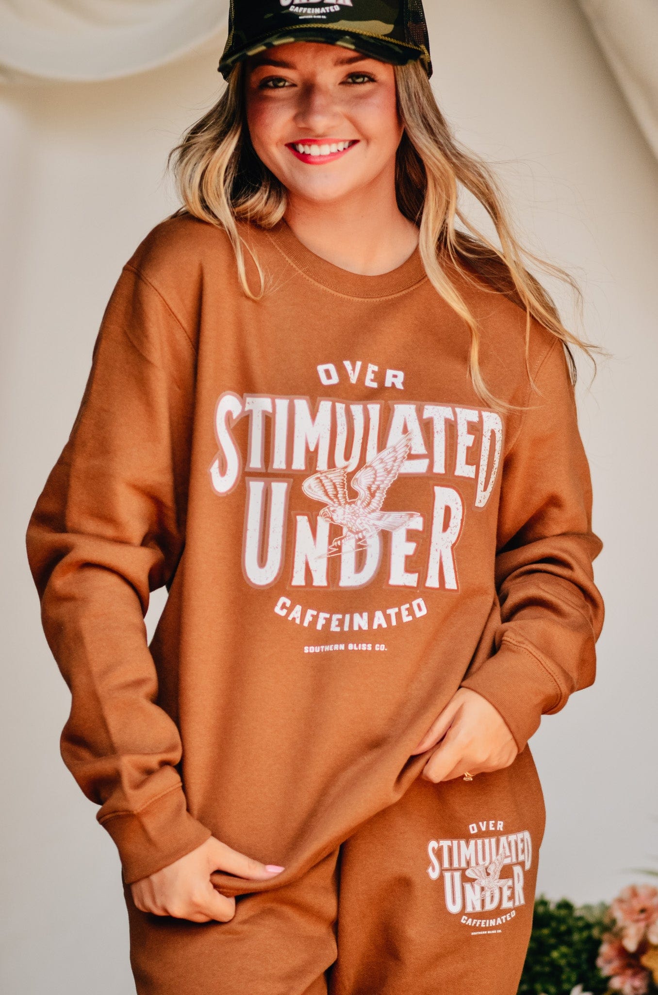 For the girl who’s doing the most on zero caffeine—this warm caramel fleece sweatshirt says it all: “Overstimulated, under-caffeinated.” Comfy, oversized, and made for chaos. Snag the matching joggers for a full fit that gets you.