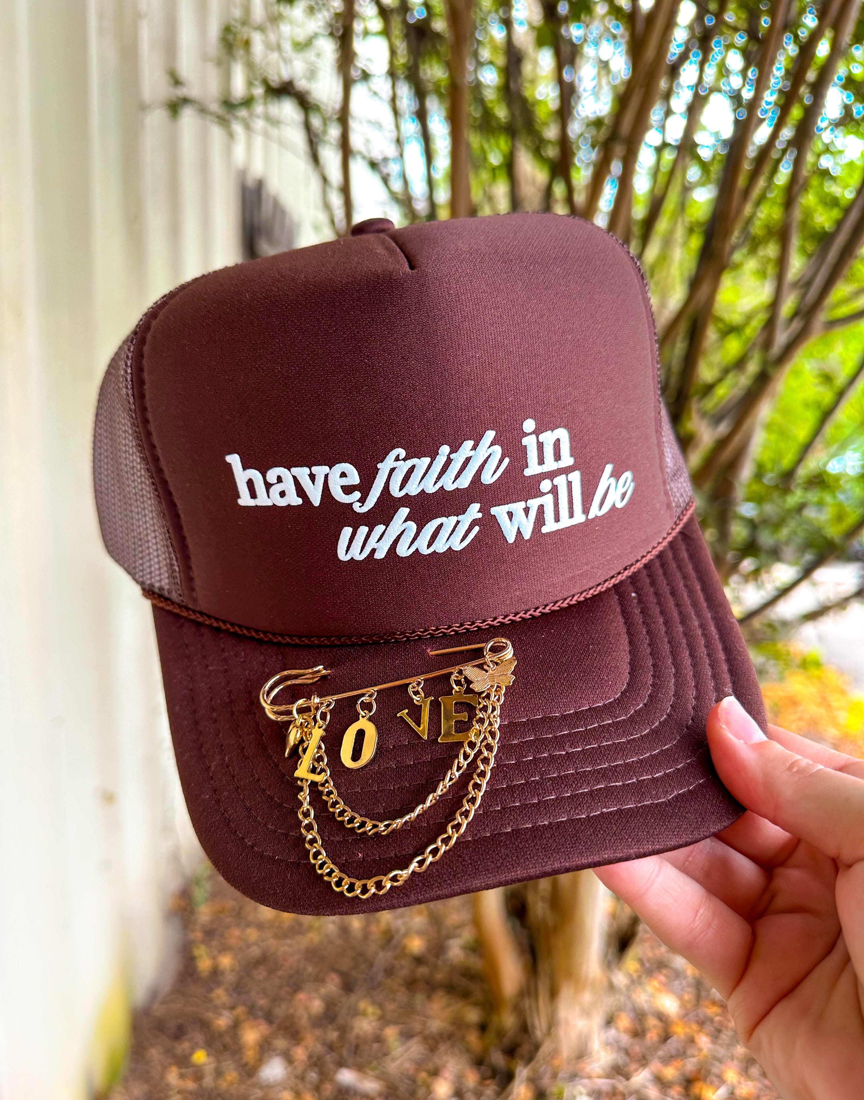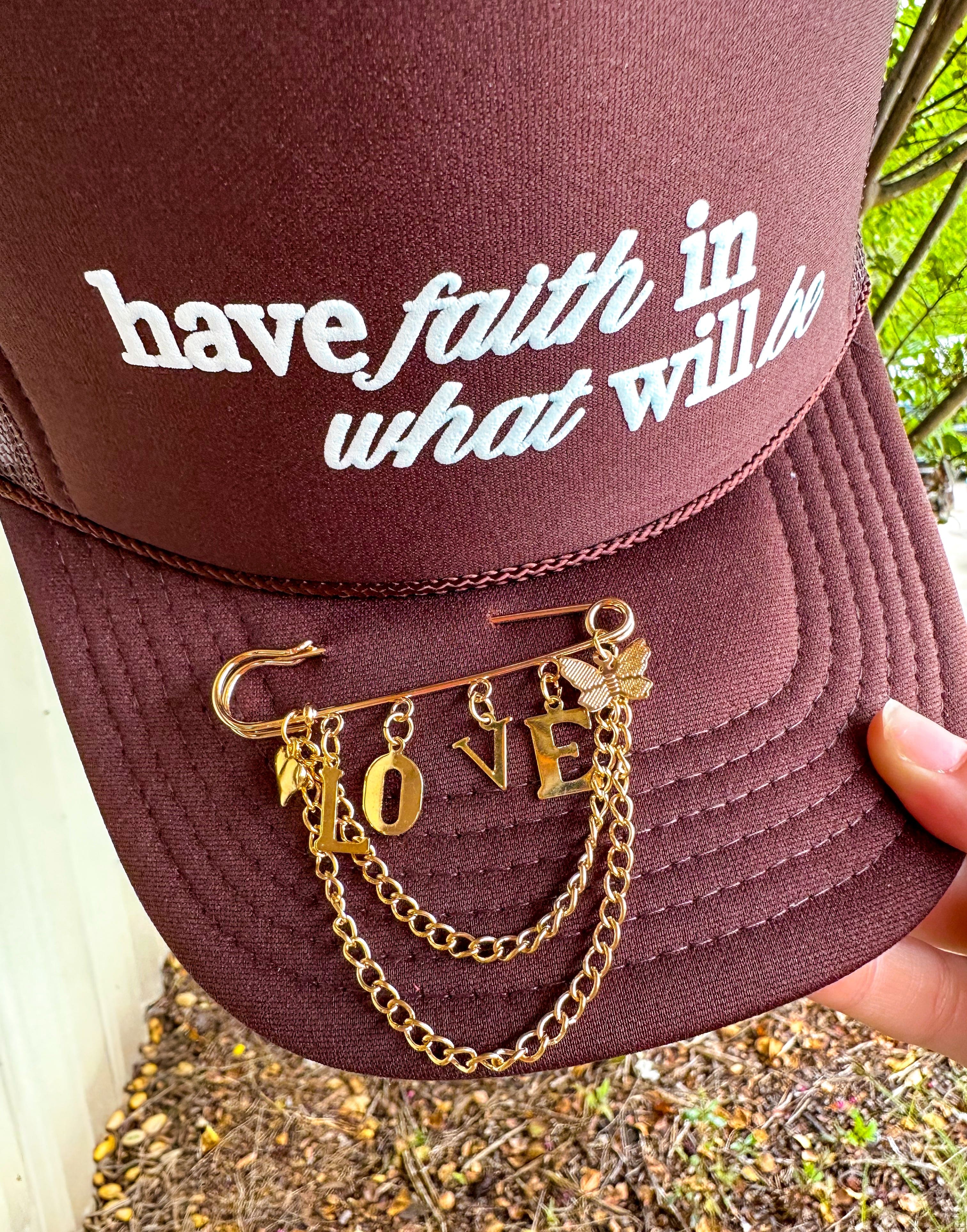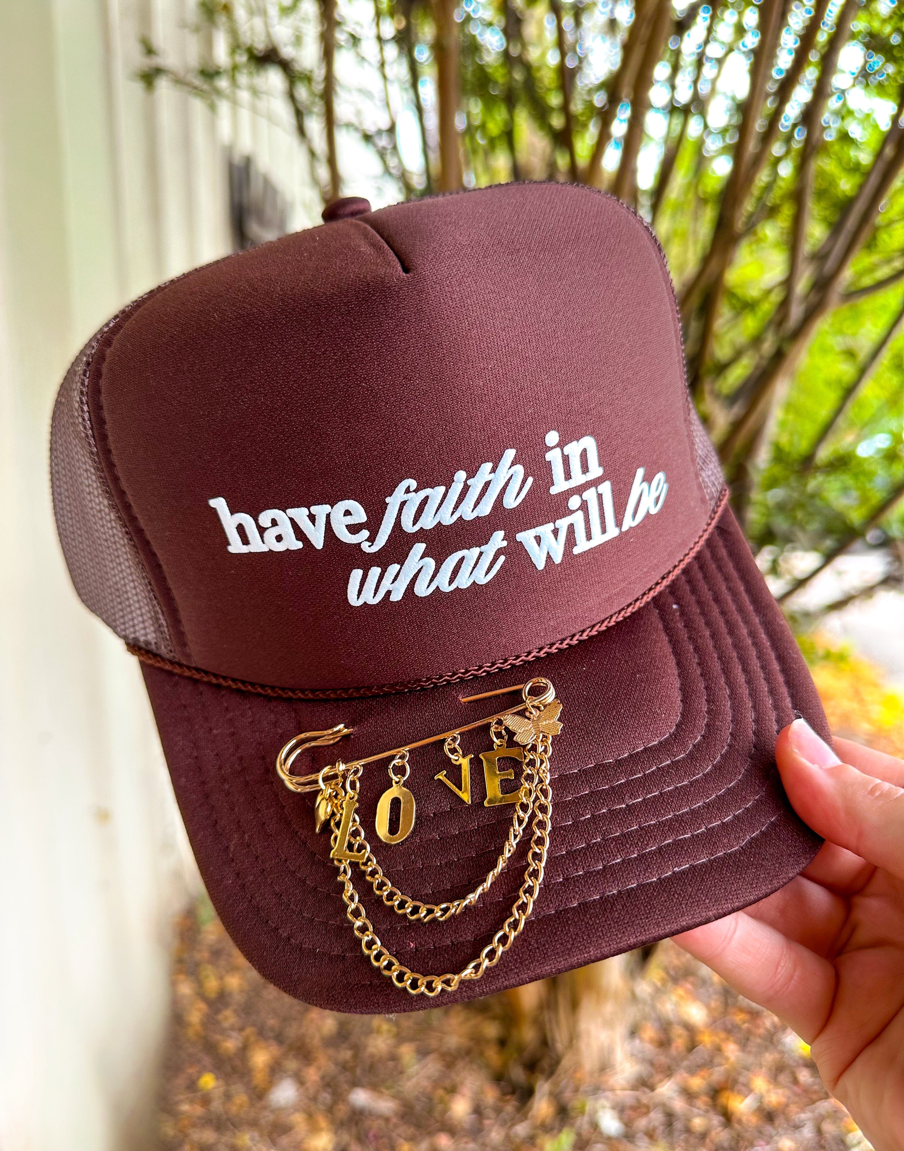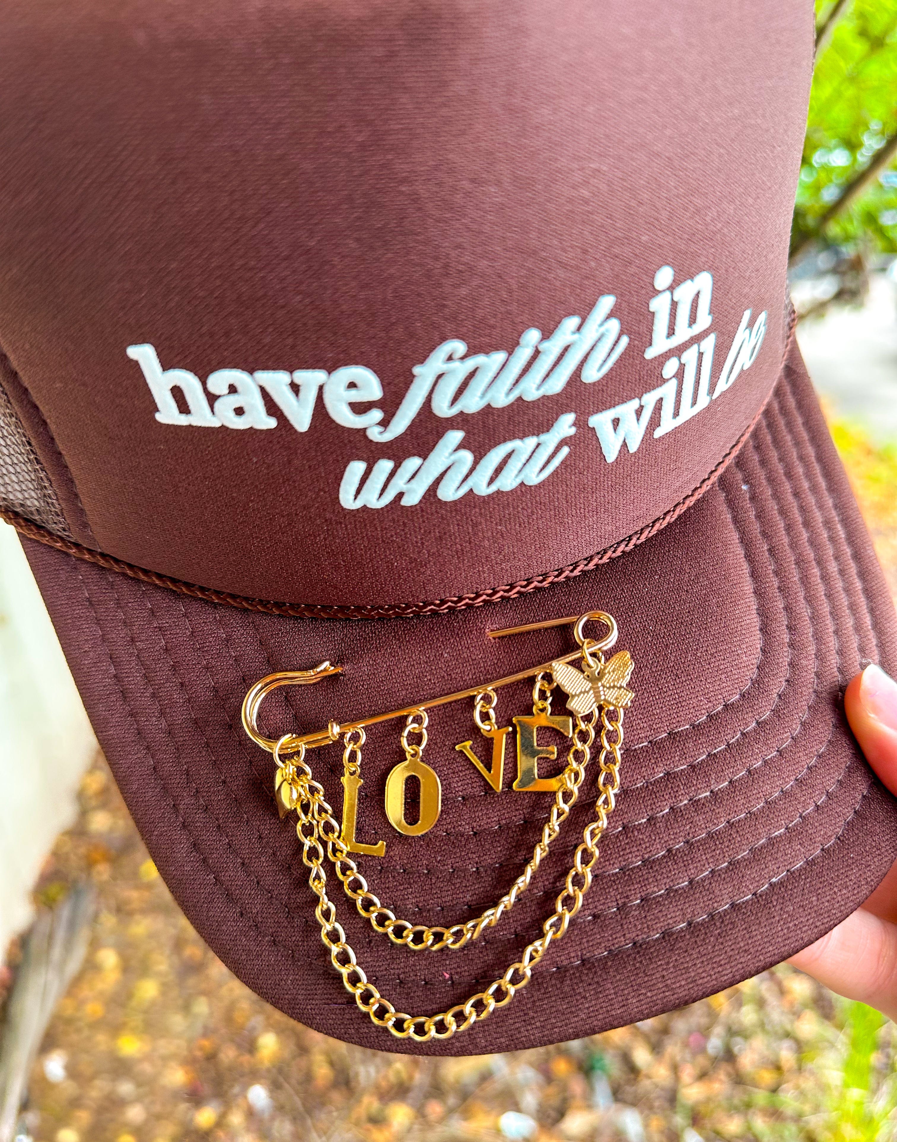 Have Faith In What Will Be with LOVE Gold Pin Brown Trucker