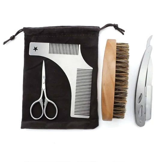 Deluxe 5 piece men's grooming gift set makes the perfect gift for a bearded friend, father, boyfriend, or husband. Taming and shaping your beard or mustache is an easy task utilizing the soothing feel of the boar bristle brush & the sharp barber scissors. Easily contour & comb with the shaping comb tool. The premium Mad Man Beard Kit Includes: drawstring pouch, soft grooming brush, straight razor, trimming shears, 2 in 1 beard comb & shaper. Mad Man, masters of men's gifts. Material: Alloy/Wood. Dimensions: 4" x 6"