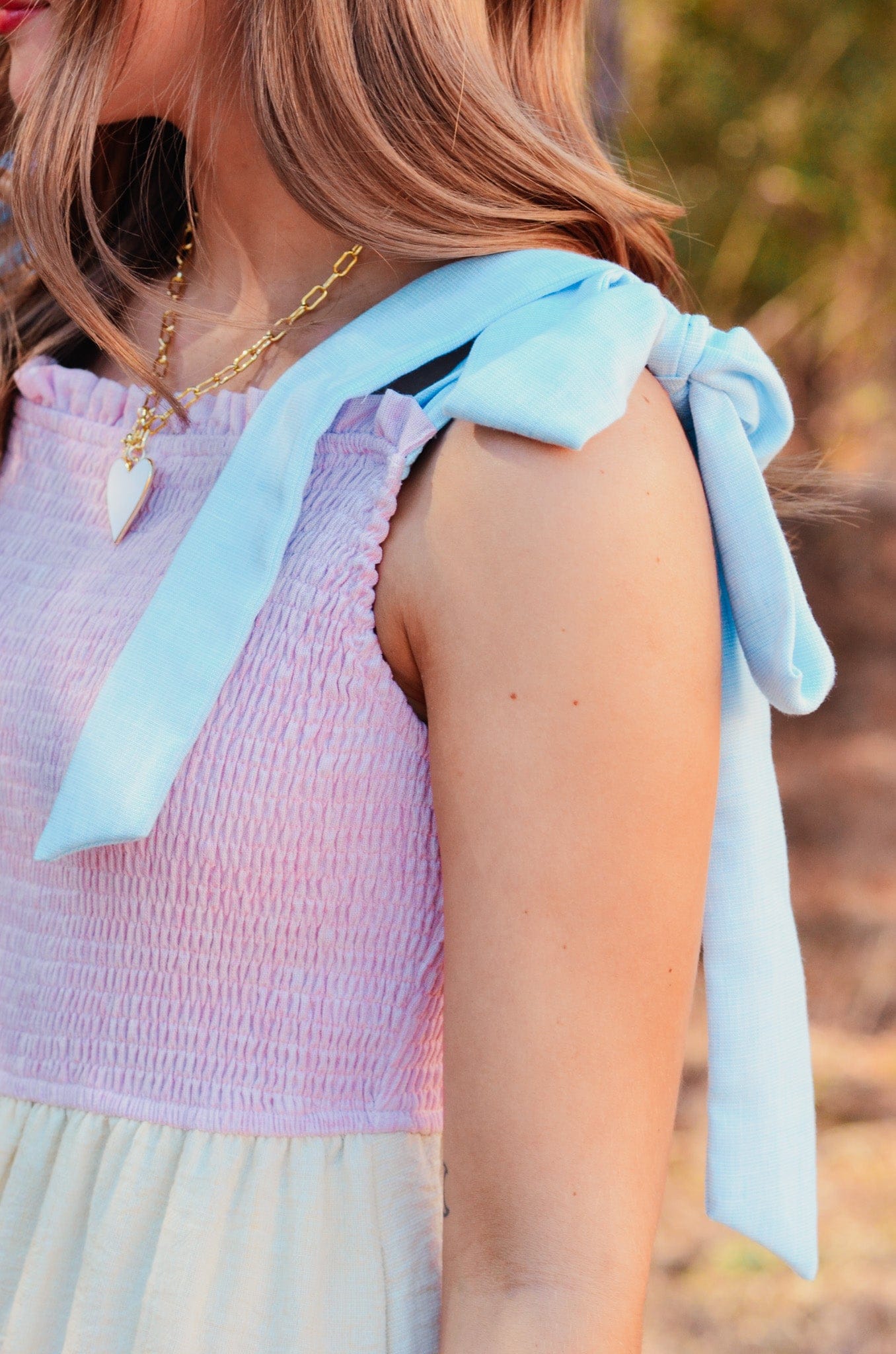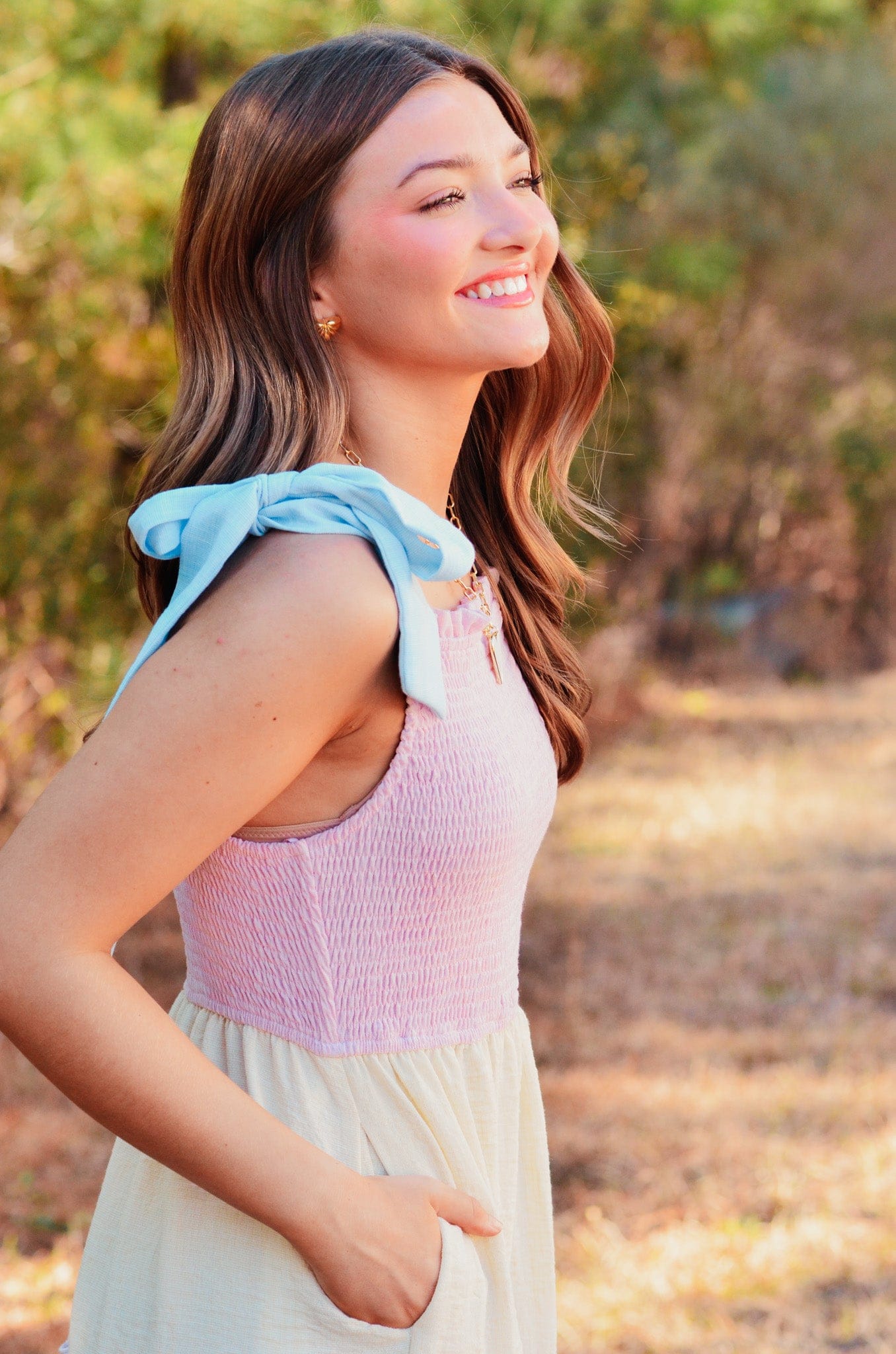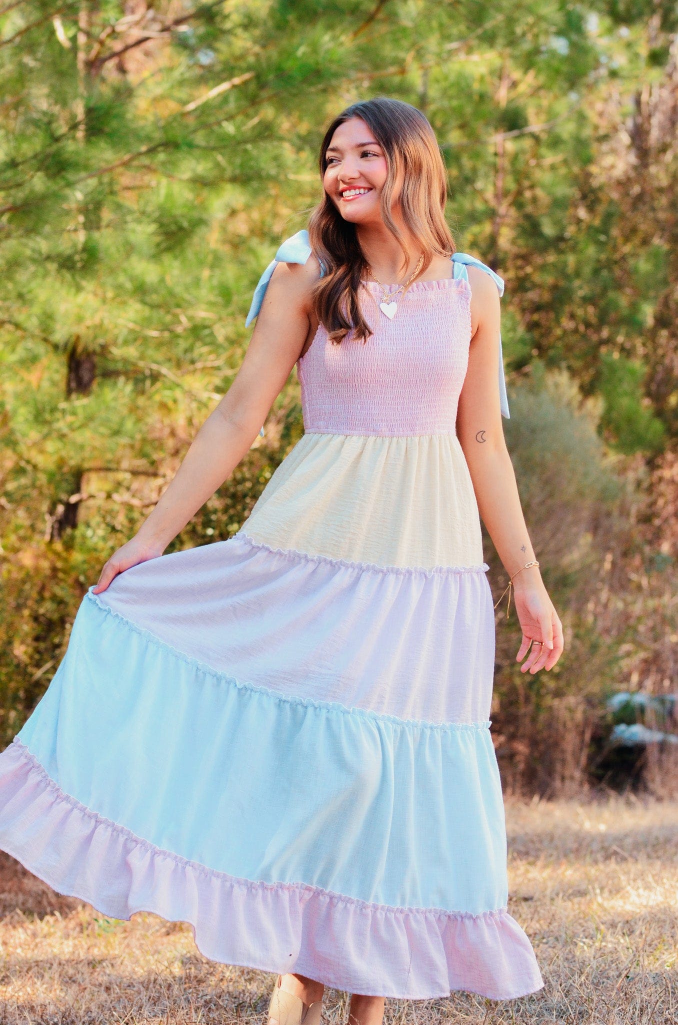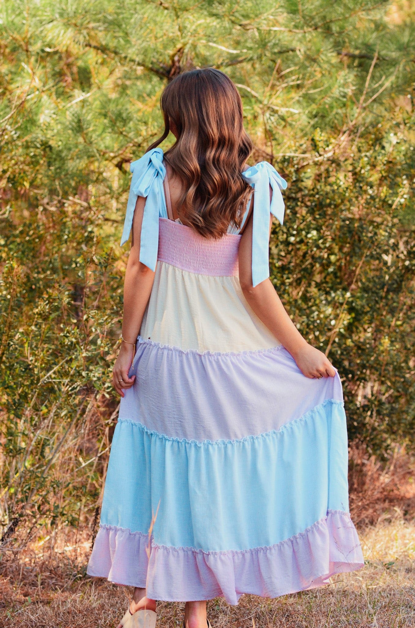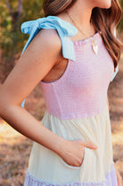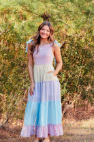 Elevate your wardrobe with the Caroline Color Block Tiered Maxi Dress, featuring soft pastel hues in a modern colorblock design. The tie shoulders add a playful touch while the rouched top creates flattering definition. Practical pocket detail keeps your essentials close. Perfect for garden parties, casual outings, or any occasion calling for effortless elegance and comfort.
