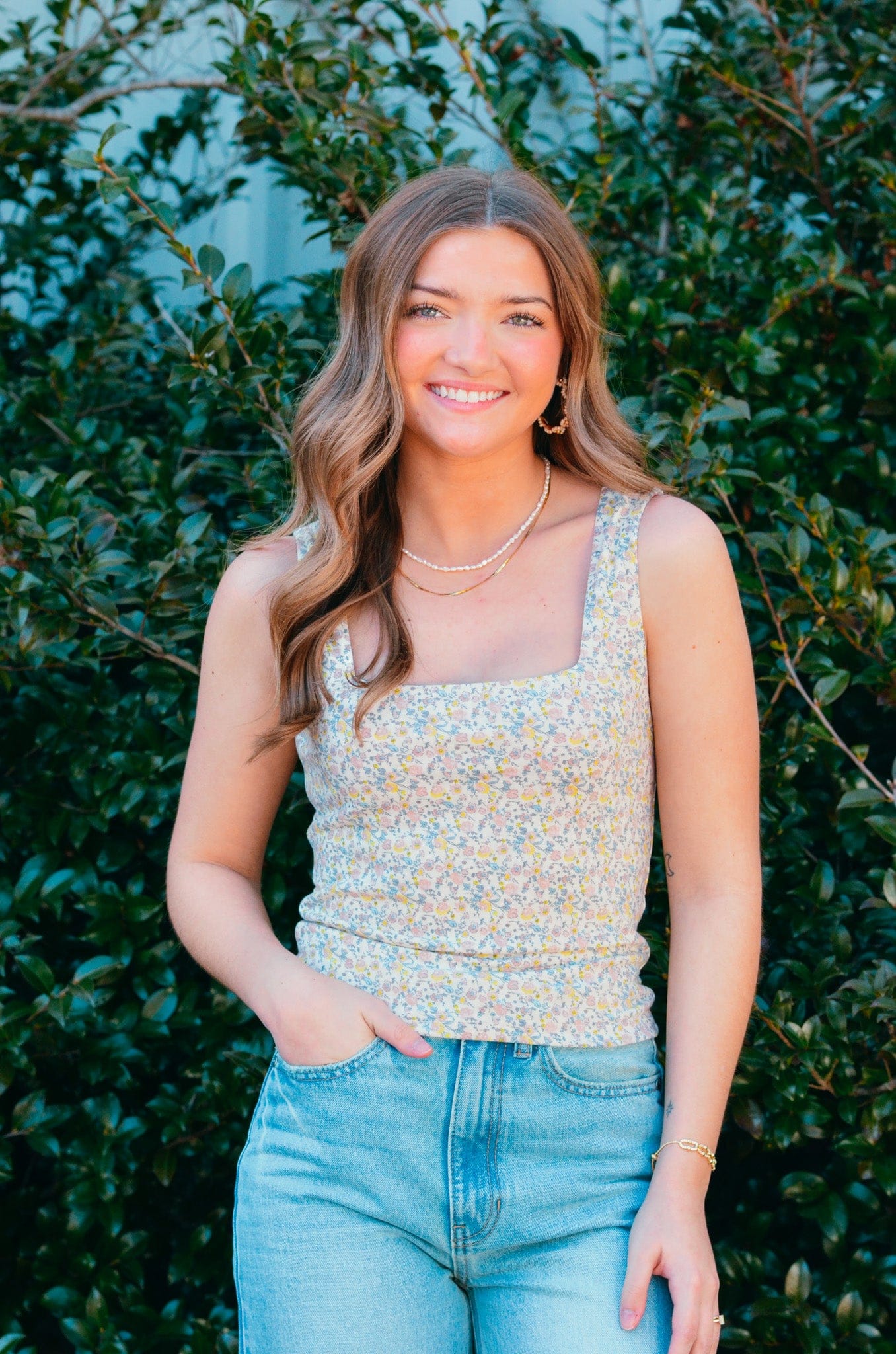 Embrace effortless style with this charming floral tank top. Featuring a soft, breathable fabric and delicate multi-colored floral print on a cream base, it's perfect for warm weather layering or wearing solo. The relaxed fit and sleeveless design offer comfort and versatility, making it an easy addition to any casual wardrobe. Pair it with denim, linen pants, or a flowing skirt for a fresh, feminine look.