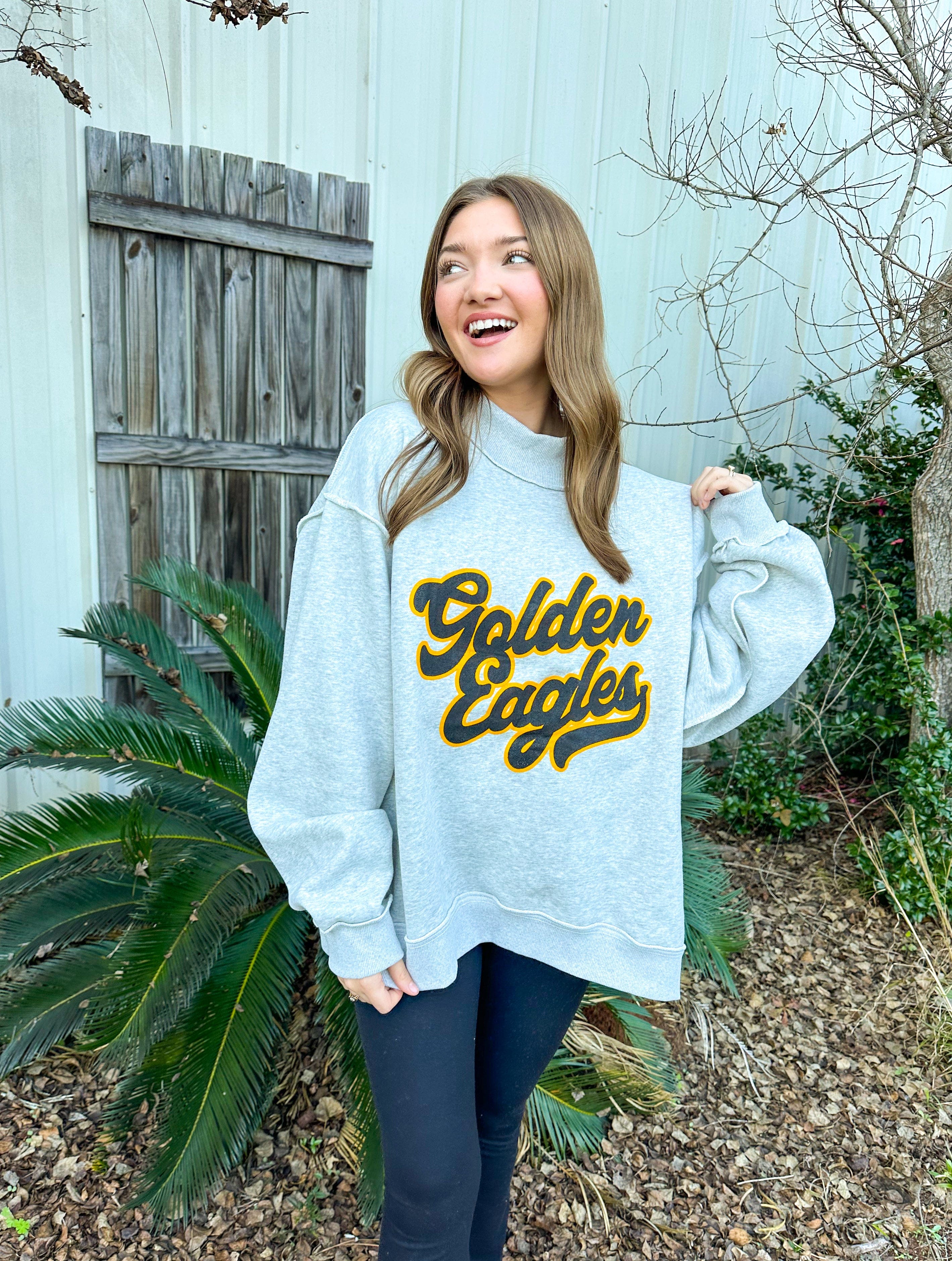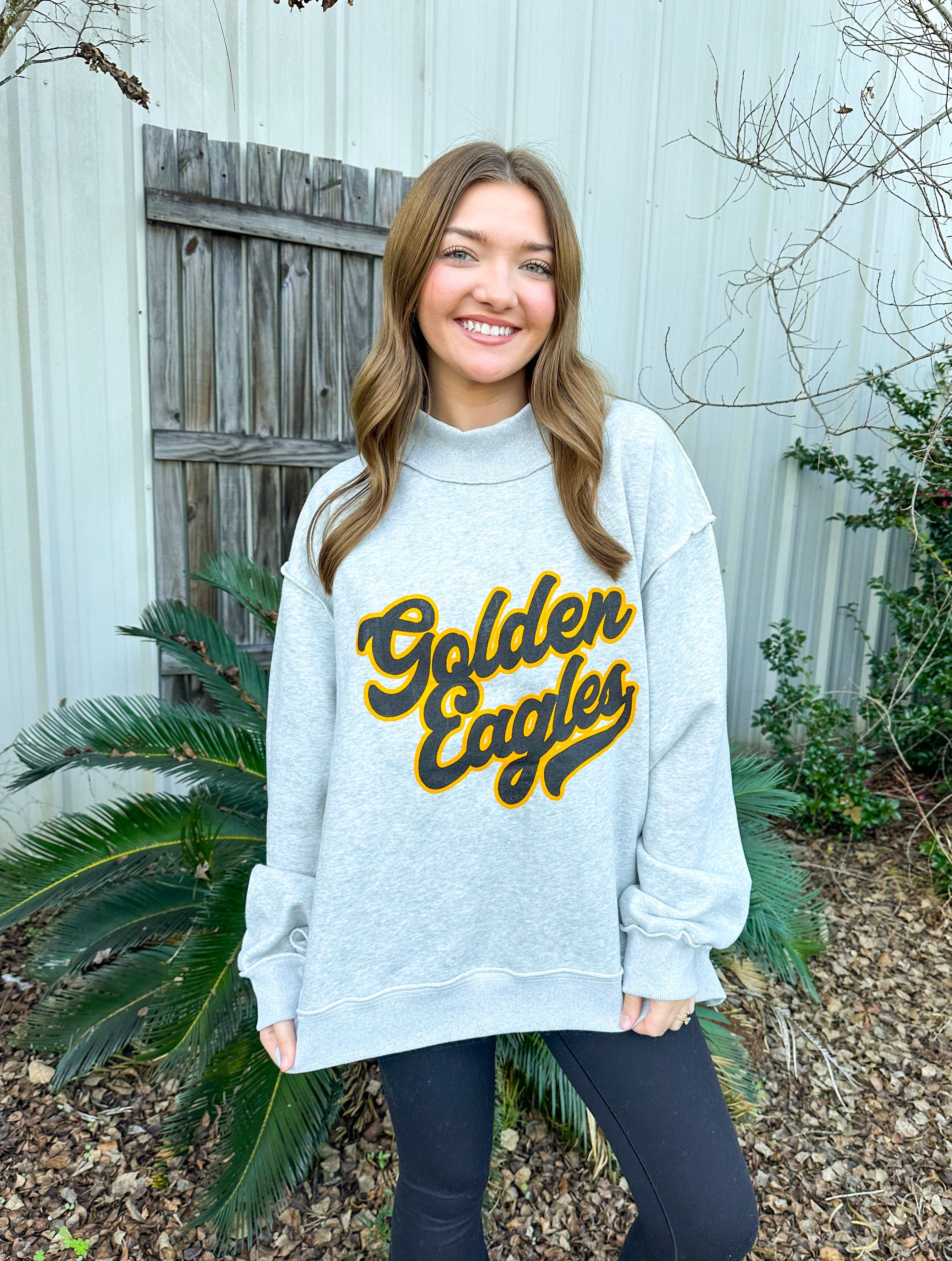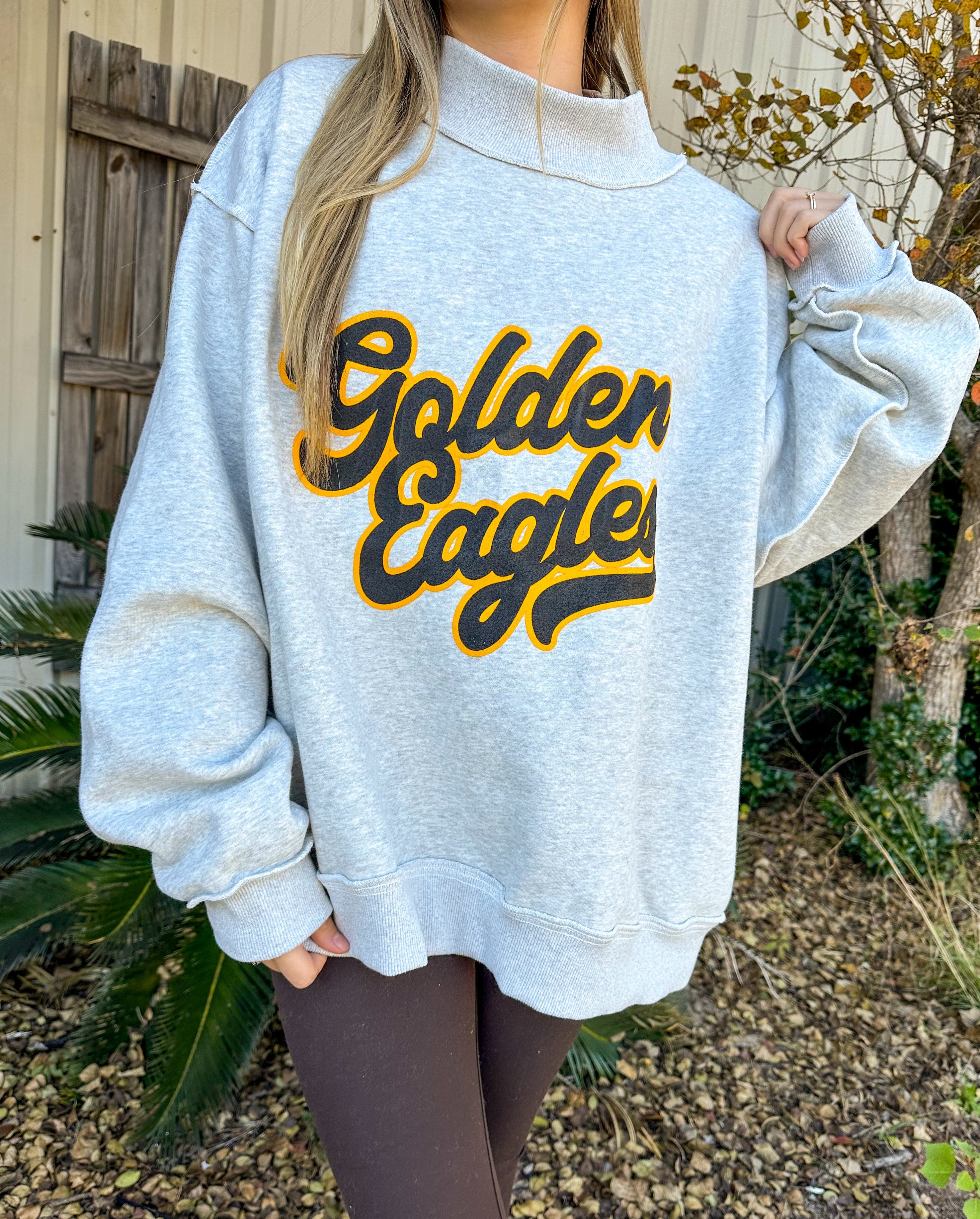 The Golden Eagles Mock Sweatshirt features a reversible design with a mock neck, showcasing the Golden Eagles logo prominently. Constructed for versatility, this sweatshirt allows for two distinct looks while providing comfort and warmth. Ideal for both casual and active wear, it is an essential addition to any wardrobe.
