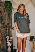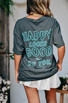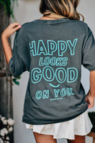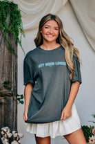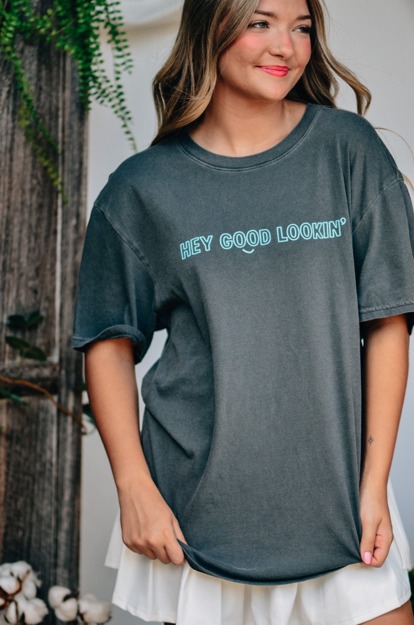 A classic tee with a cheeky twist, this "Hey Good Lookin" Comfort Color tee is your go-to for effortless charm. Featuring playful front-and-back text in a vibrant turquoise pop against a washed charcoal base, it's made with ultra-soft, garment-dyed cotton for that perfectly lived-in feel. Whether you’re lounging or out and about, this tee says it all—happy looks good on you.