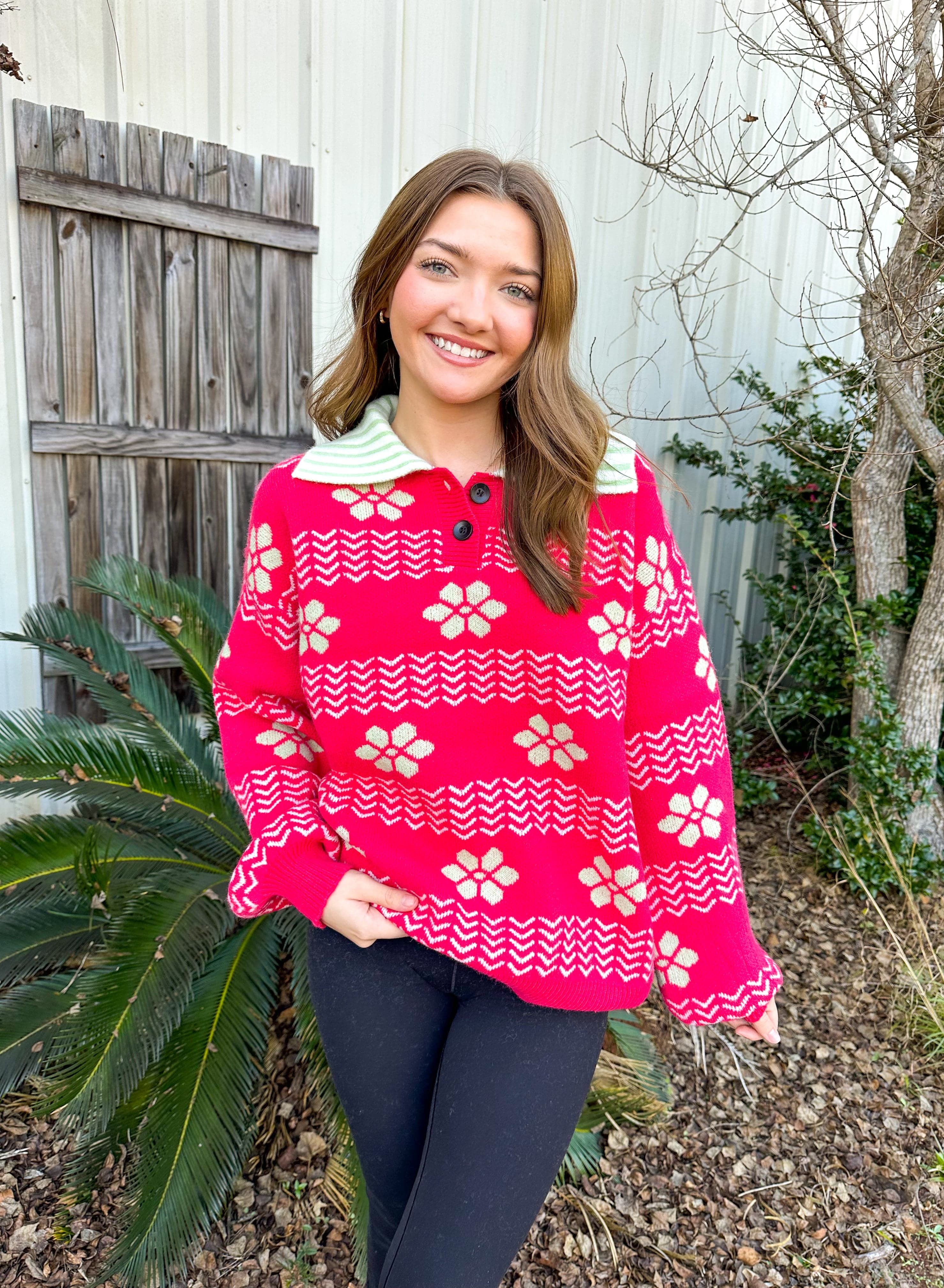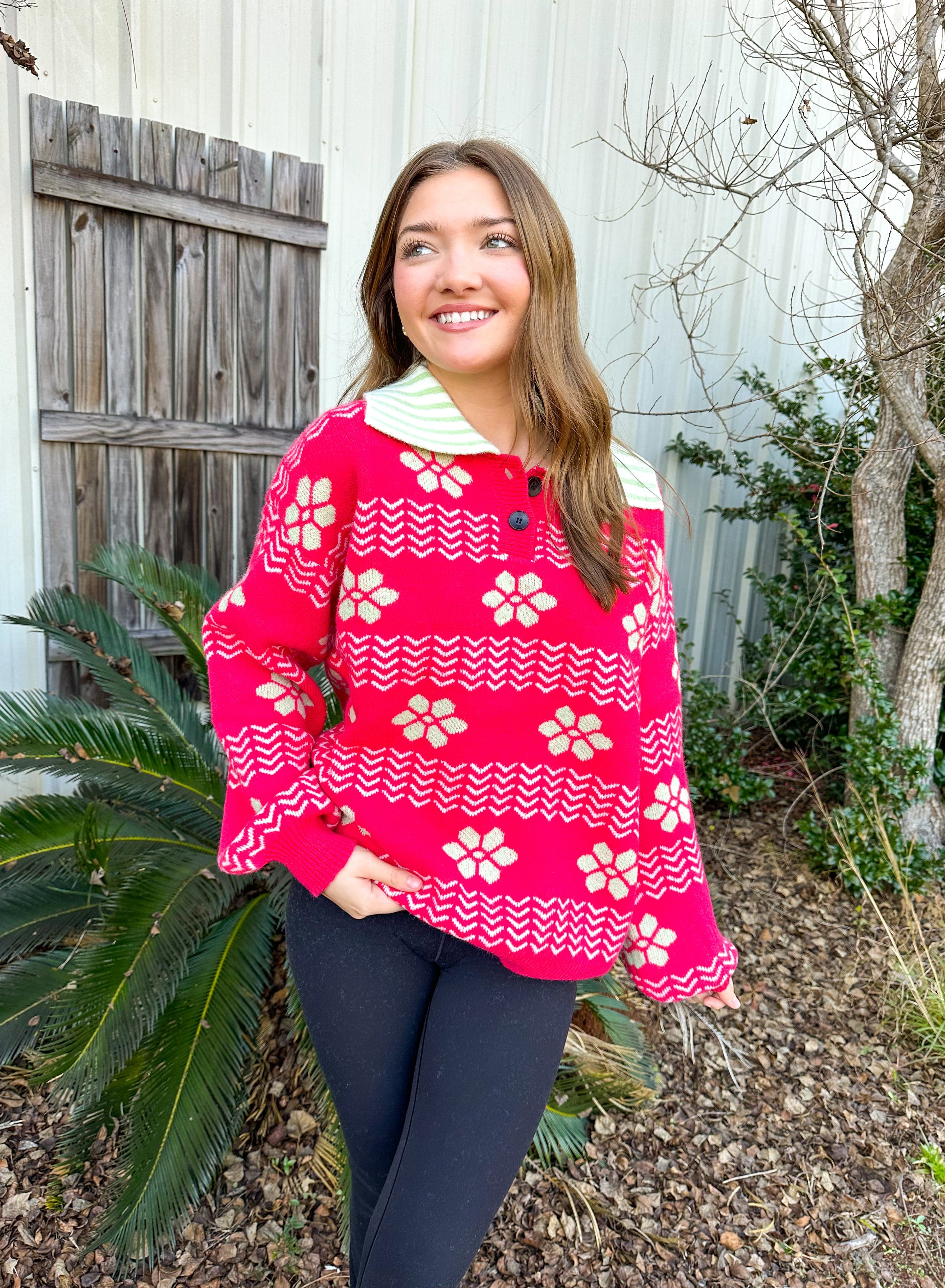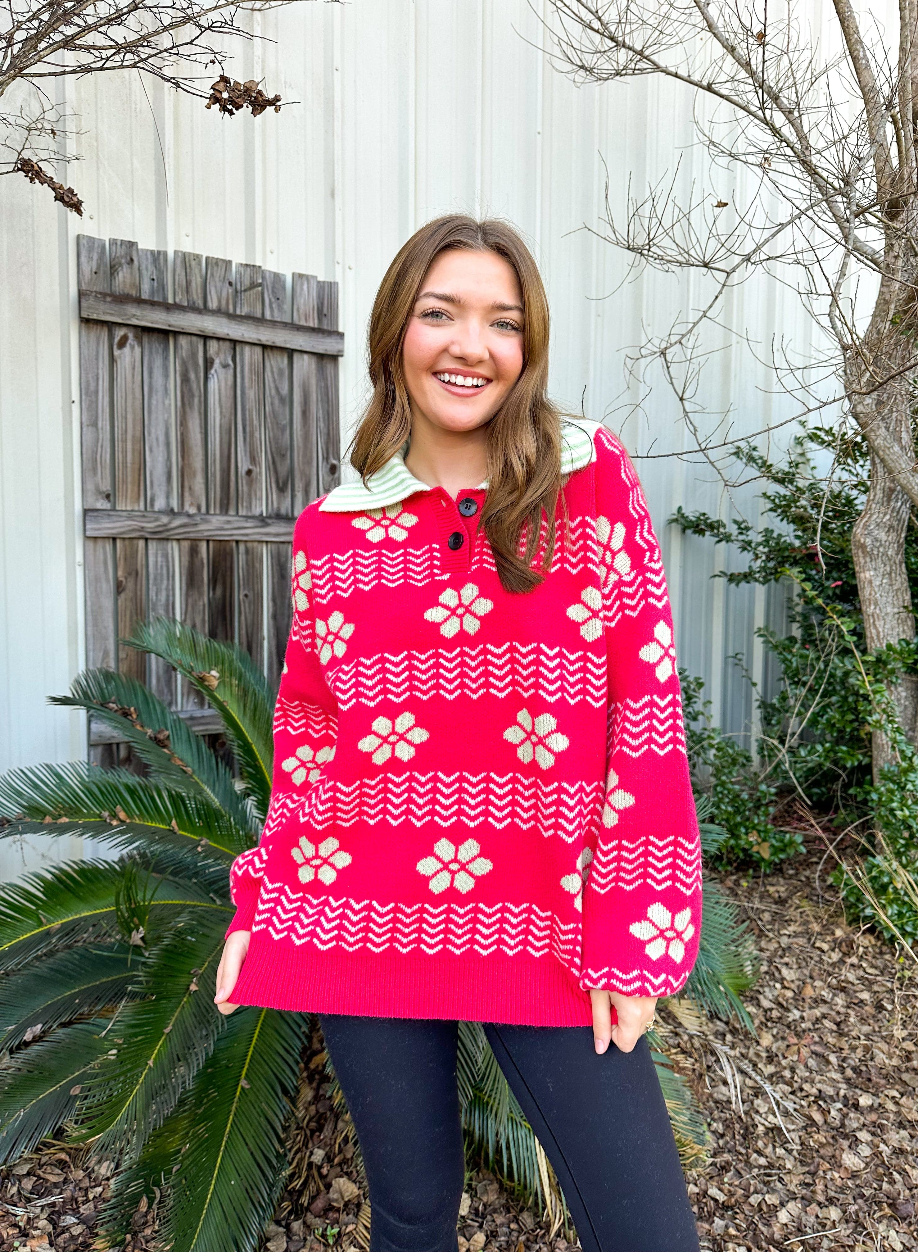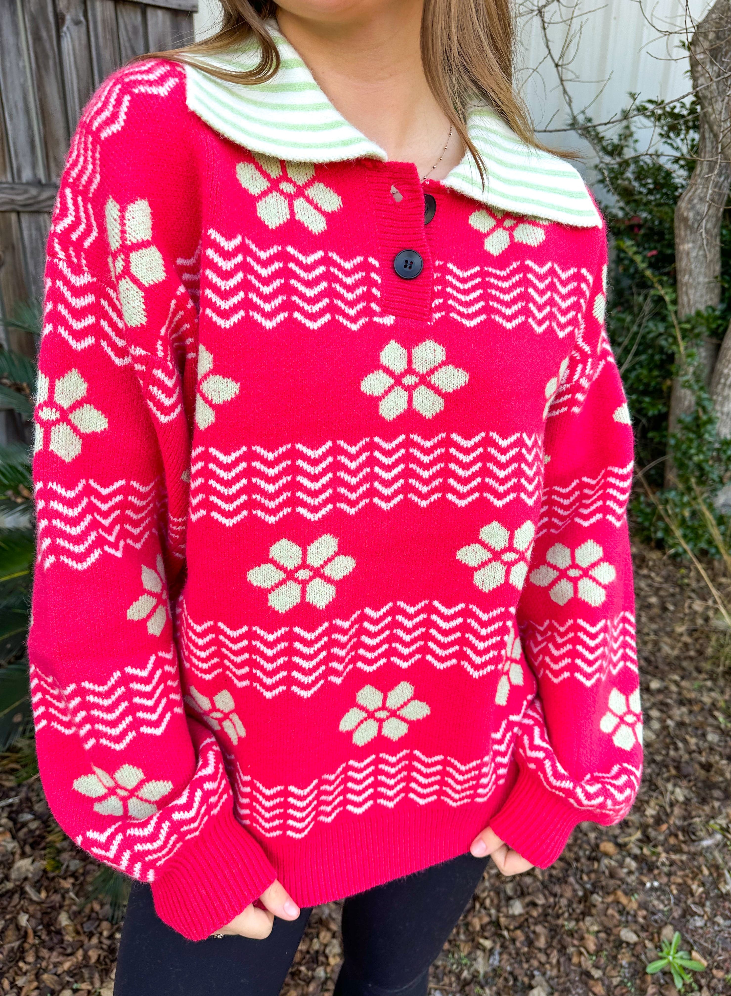 Bloom into style with this eye-catching long sleeve sweater that blends artistic flair with everyday comfort. Featuring a vibrant pink floral abstract design accented with striking green tones, this piece makes a bold statement. The contrasting green and white striped collar adds a playful twist, while the button neck detail offers versatile styling options. Wrapped in cozy, warm fabric, you'll stay snug without sacrificing that trendy, put-together look. Perfect for anyone who loves to express their personality through fashion.