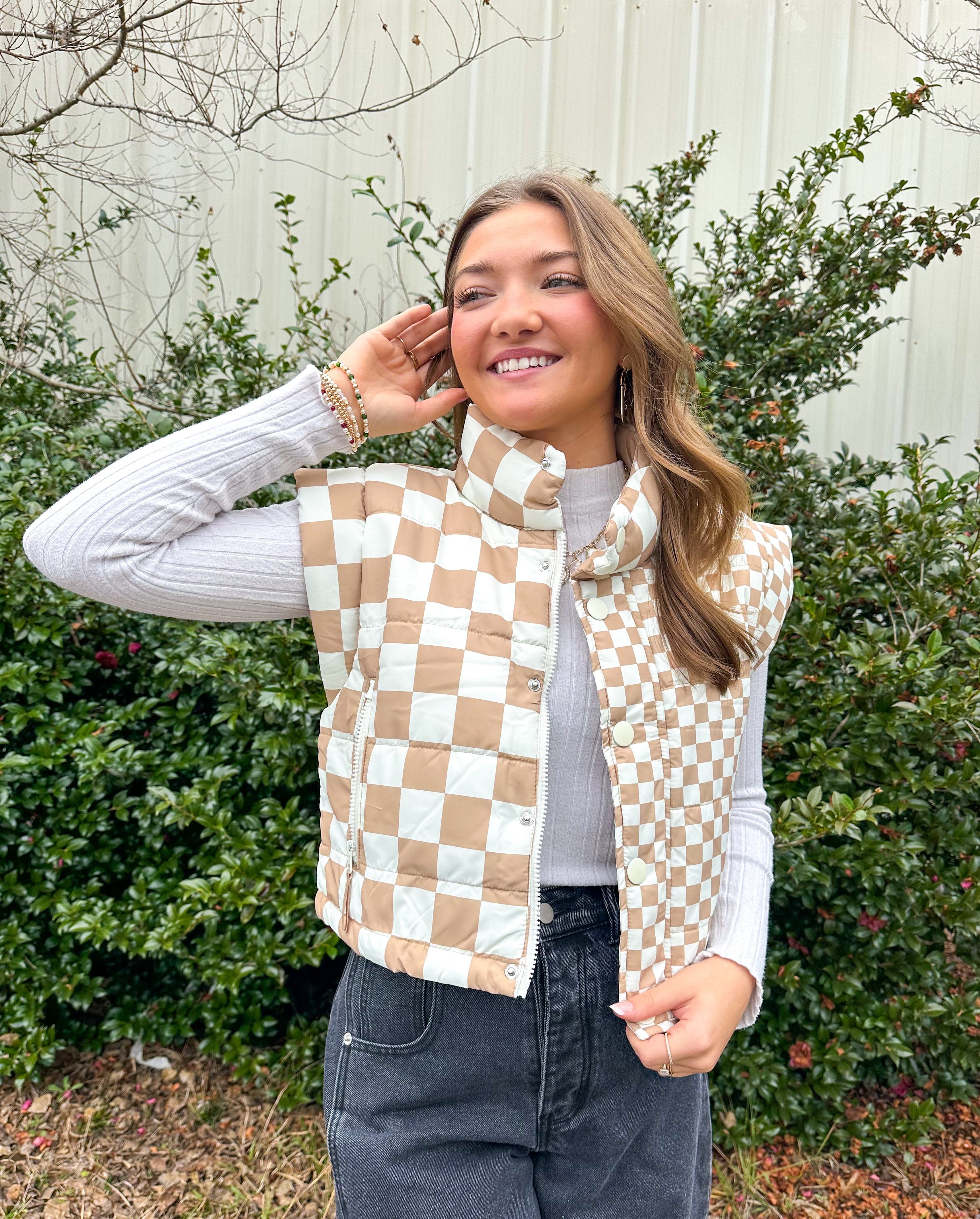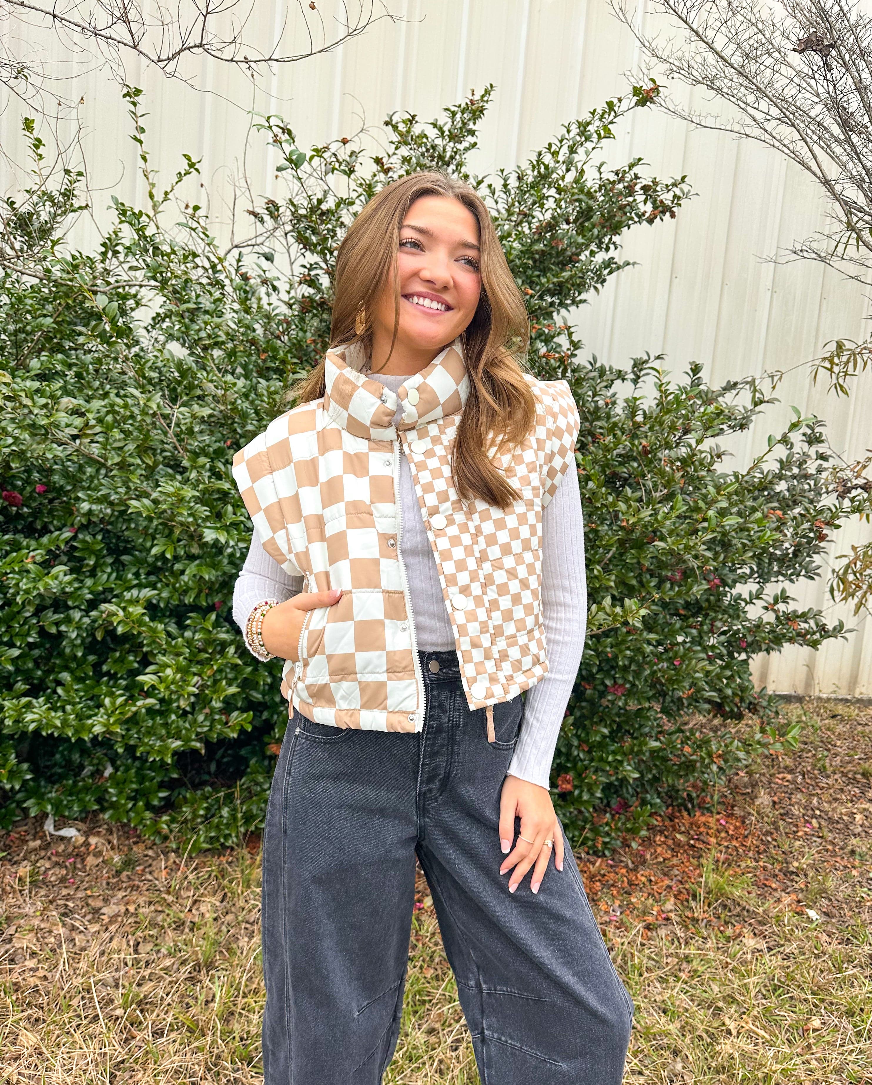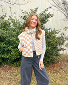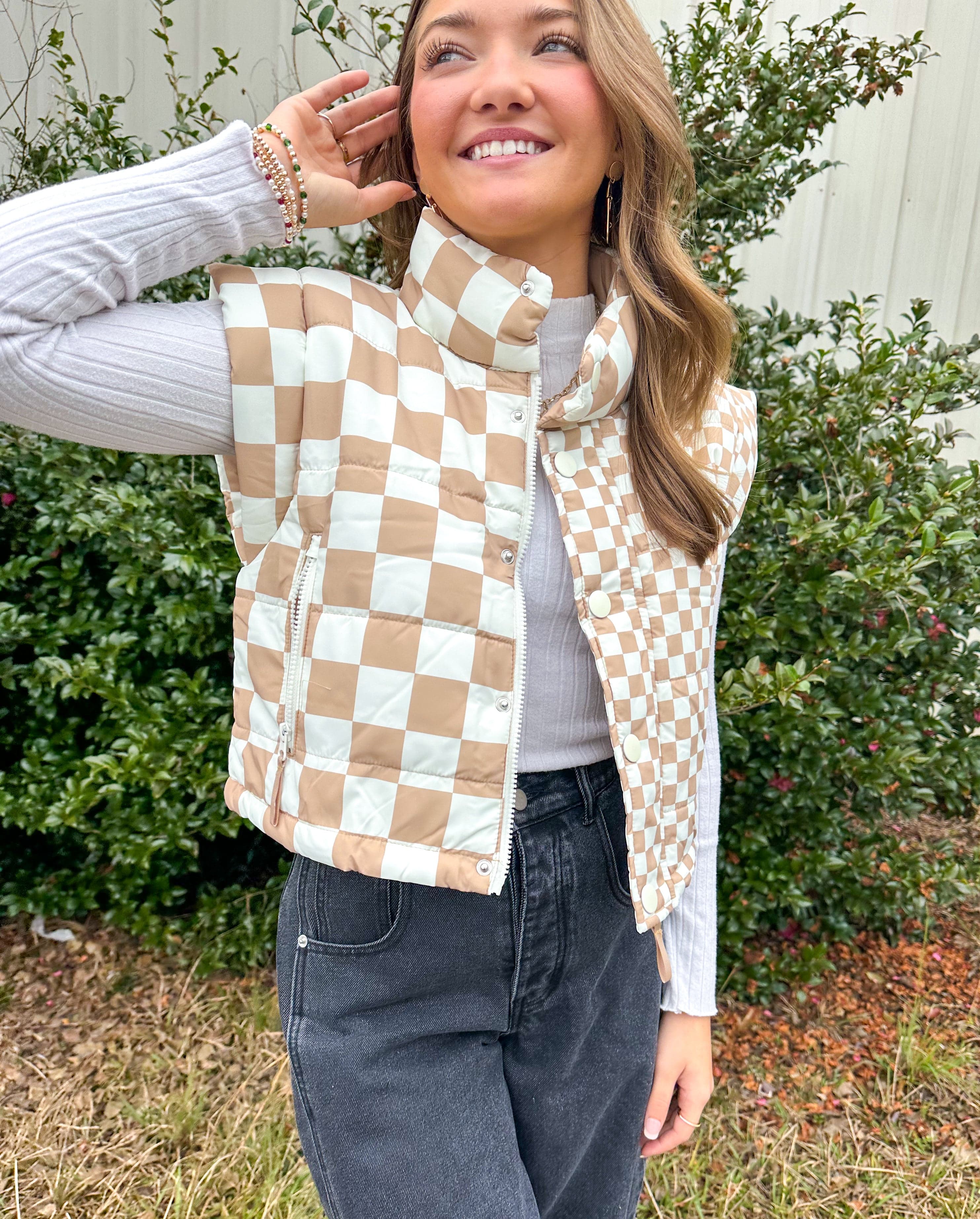 The Isabel Checkered Puffer Vest combines timeless style with practical layering. Featuring a distinctive ivory checkered print, this polyester vest offers versatile warmth for transitional seasons. The cropped silhouette flatters various body types while the mock neckline adds structure and sophistication. Dual closure options—a convenient zip and snap button front—allow you to customize your fit and styling preferences throughout the day. An essential piece for building a refined, adaptable wardrobe.