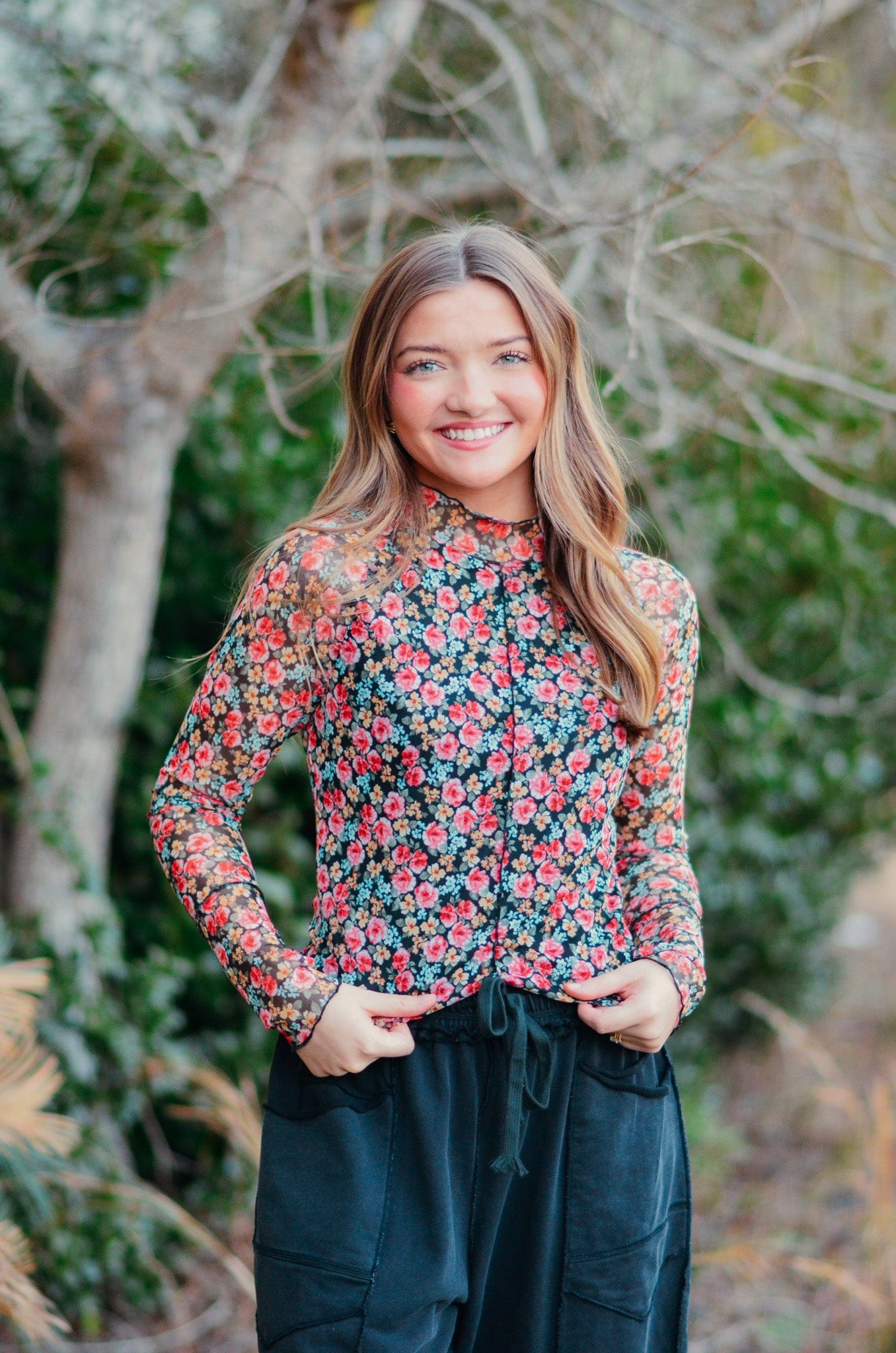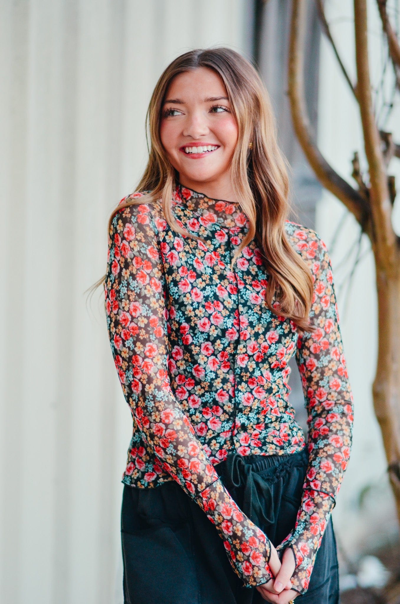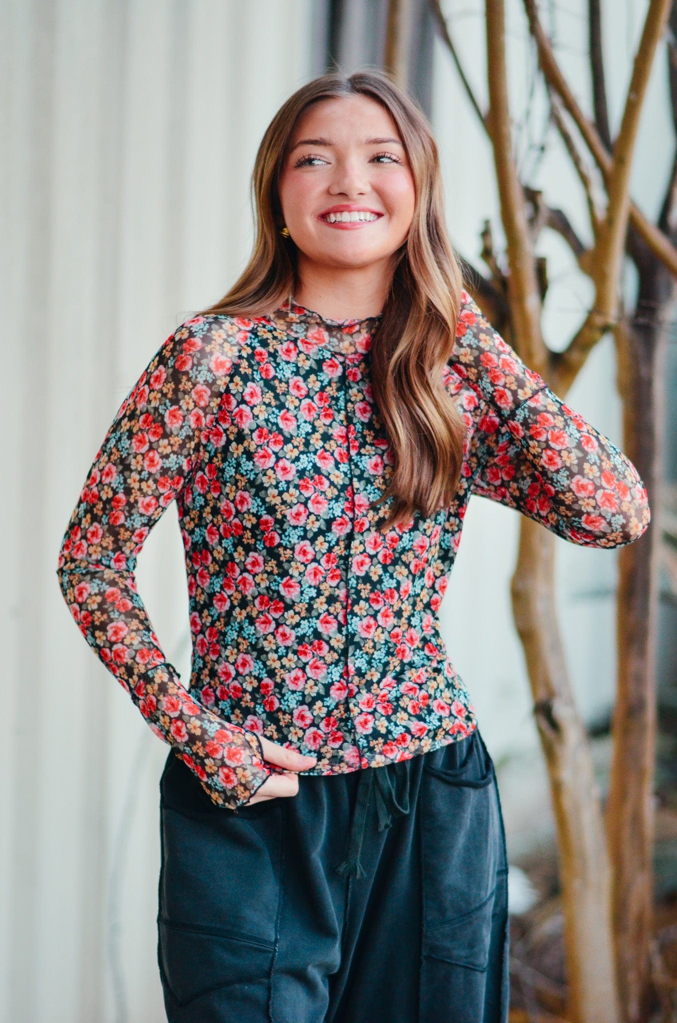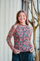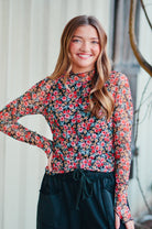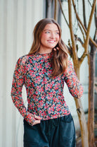 Elevate your wardrobe with the Jane Floral Mesh Long Sleeve Top—where delicate femininity meets everyday wearability. The intricate floral print catches the eye while double lining ensures modest coverage you'll love. Designed with thoughtful details like a mock neck and exposed seams, this piece delivers sophisticated style without sacrificing comfort. The scalloped hem adds a polished finishing touch that sets it apart from basic basics. Perfect for layering or wearing solo, this versatile top transitions seamlessly from casual days to dressed-up occasions.