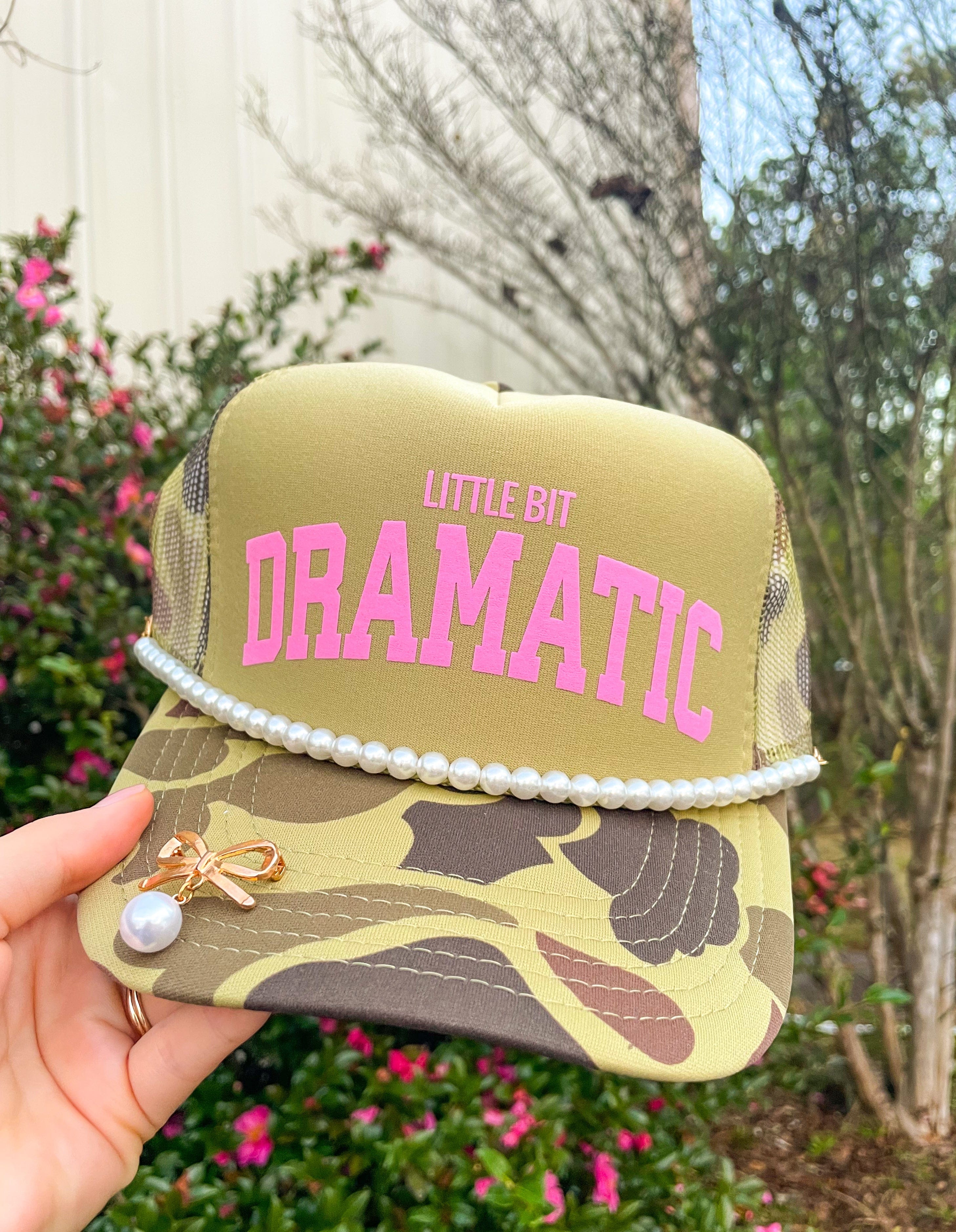 Little Bit Dramatic With Pin & Pearl Chain Two Toned Camo Trucker