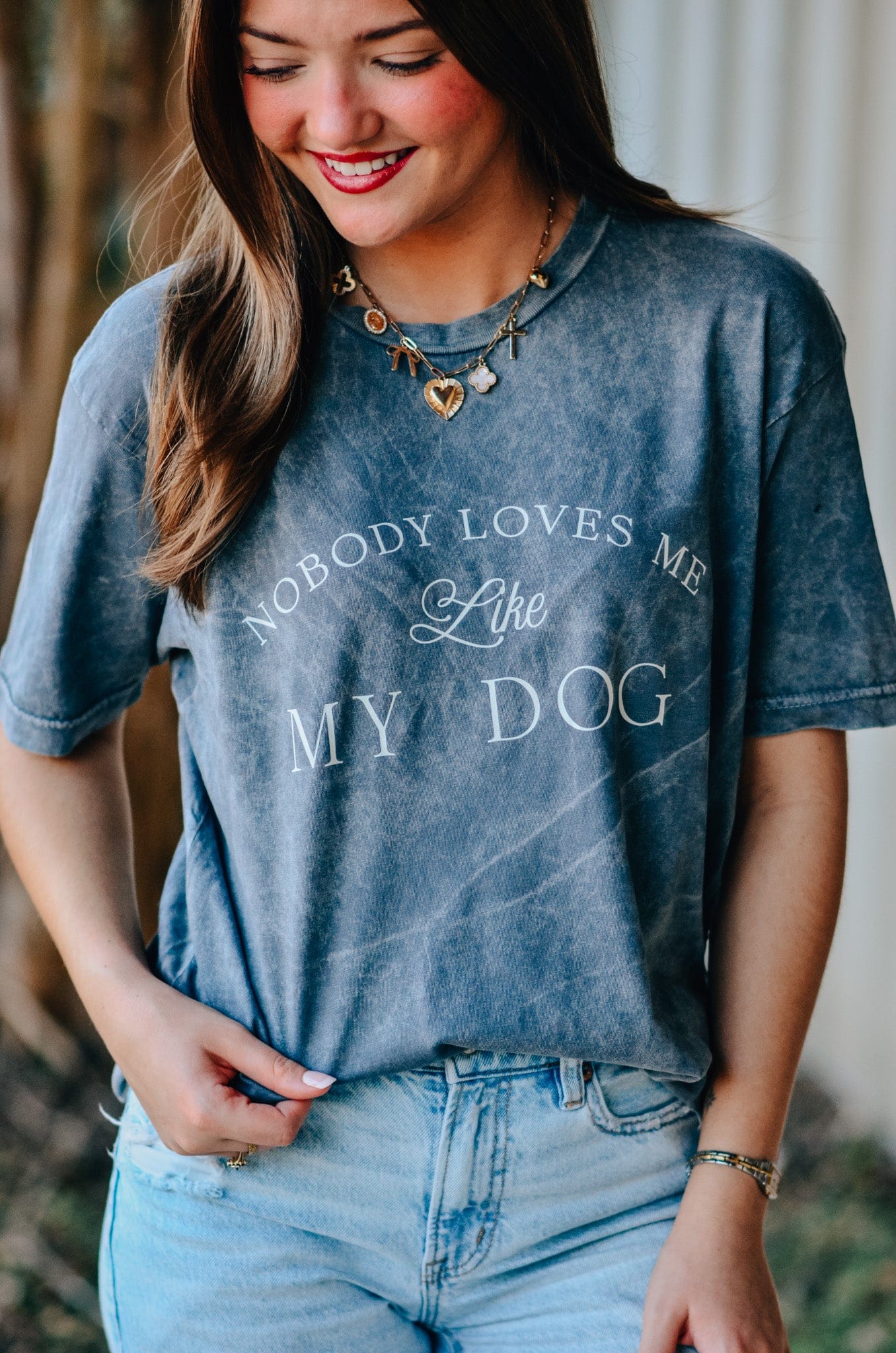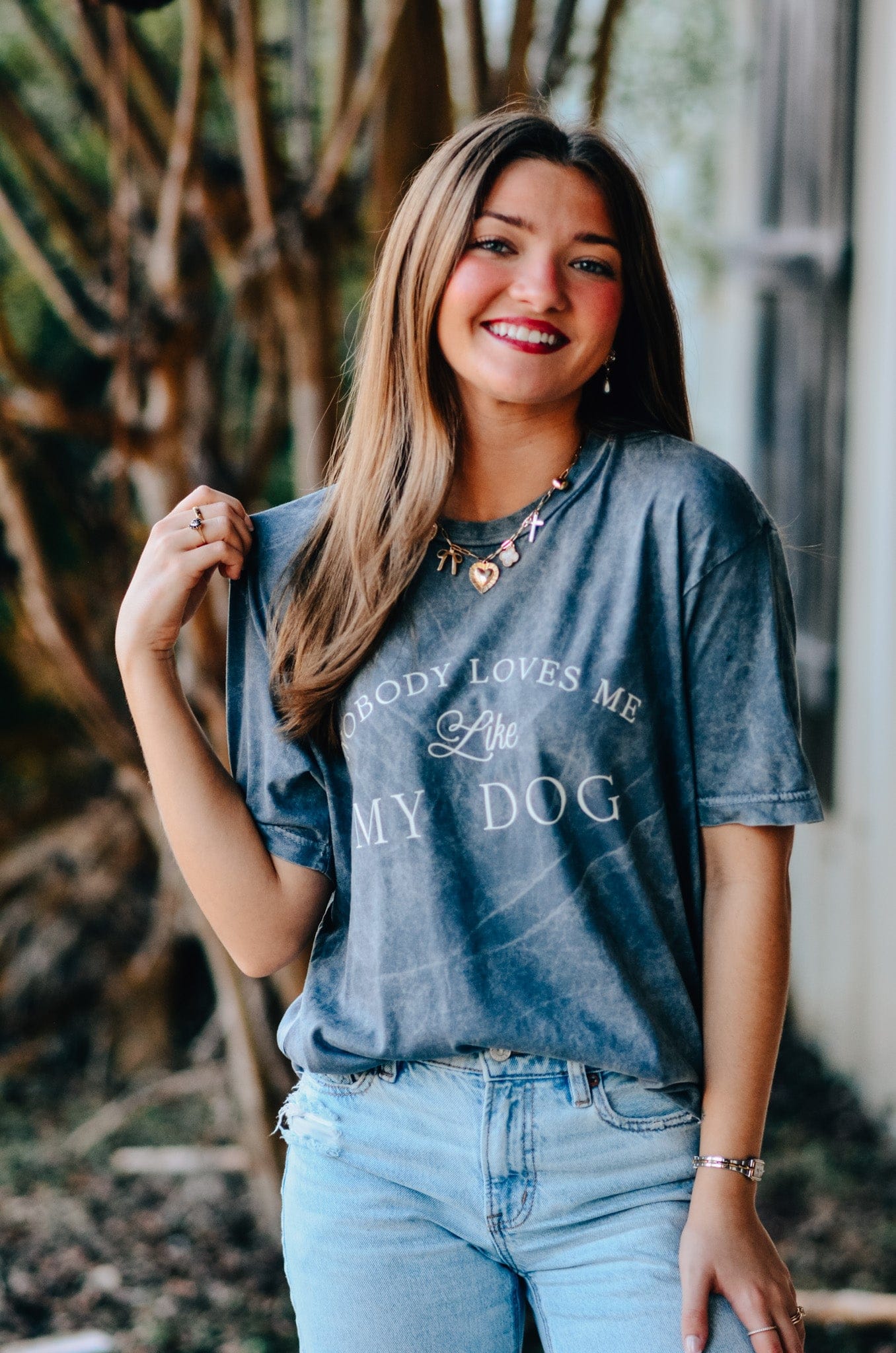 Nobody Loves Me Like My Dog Tee Celebrate the unconditional love of your furry best friend with this charming gray tee. Perfect for dog parents who know that their pup's affection is truly one-of-a-kind, this playful shirt captures that special bond in a lighthearted way. Soft, comfortable, and ideal for casual wear, it's a fun conversation starter that any dog lover will appreciate. Whether you're running errands or lounging at home, wear your dog devotion with pride.