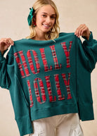 Get into the holiday spirit with the Holly Jolly Christmas Knit Top! Made from cozy waffle knit fabric and designed with an oversized fit, this green long sleeve shirt offers all-day comfort. The cheerful "Holly Jolly" spelled out in festive plaid letters adds a playful touch perfect for celebrating the season in style.