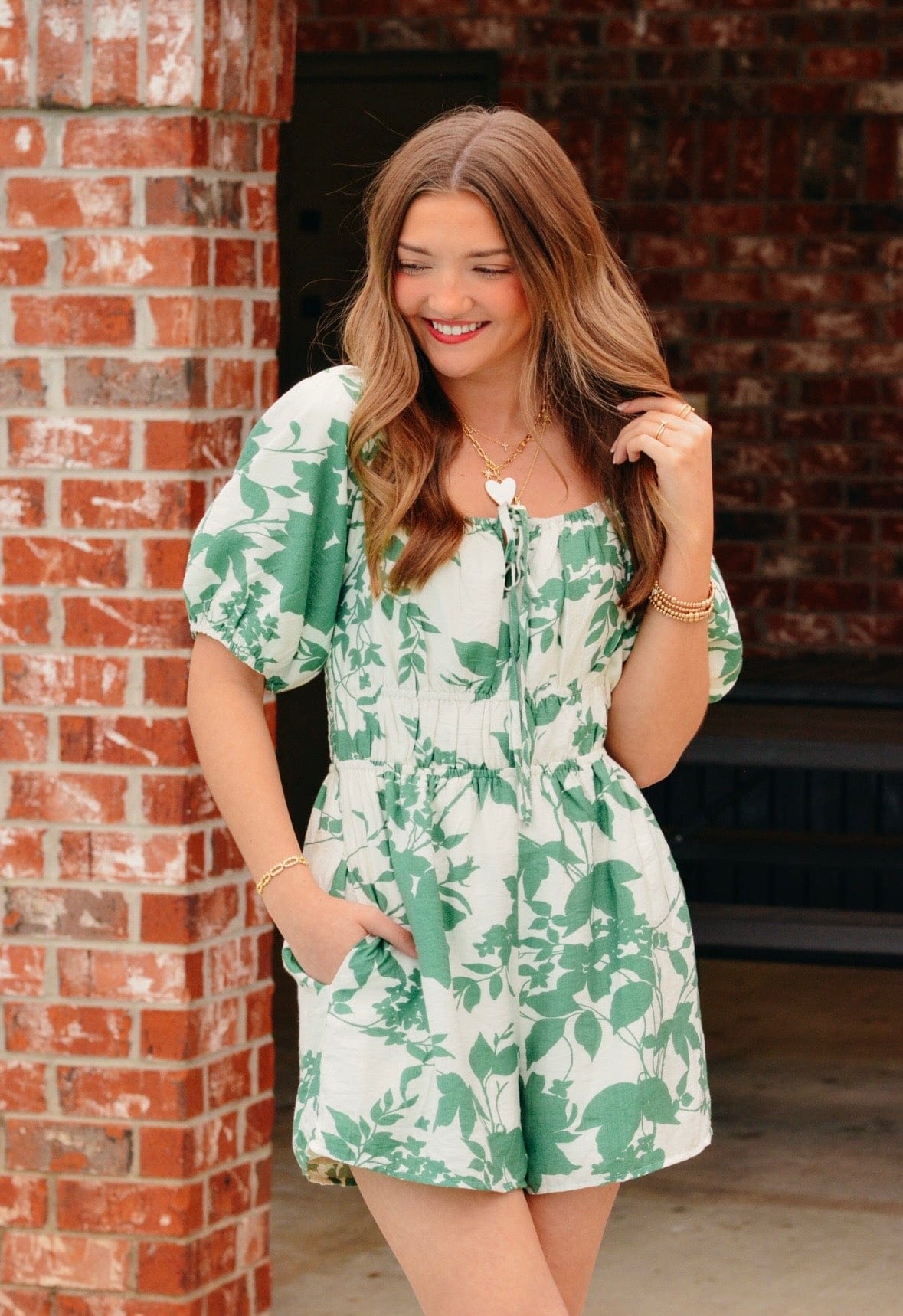 Effortless style meets comfort in the Gretta Floral Romper. This relaxed-fit piece features a charming green floral pattern that works for casual outings or weekend adventures. The elastic square neckline and puff sleeves add a playful touch, while functional pockets keep your essentials close. An elastic waistband ensures a comfortable, flattering fit all day long.