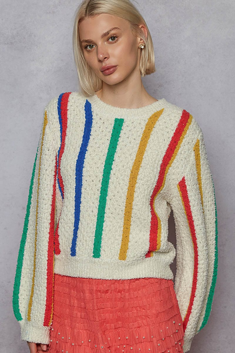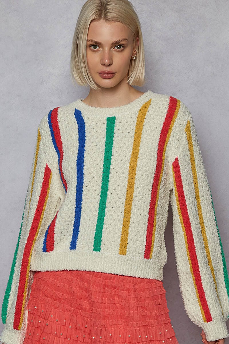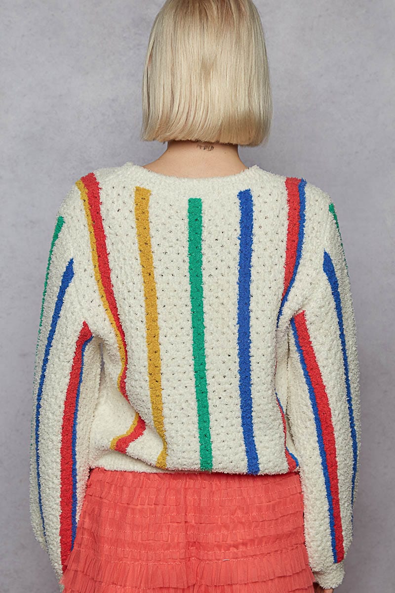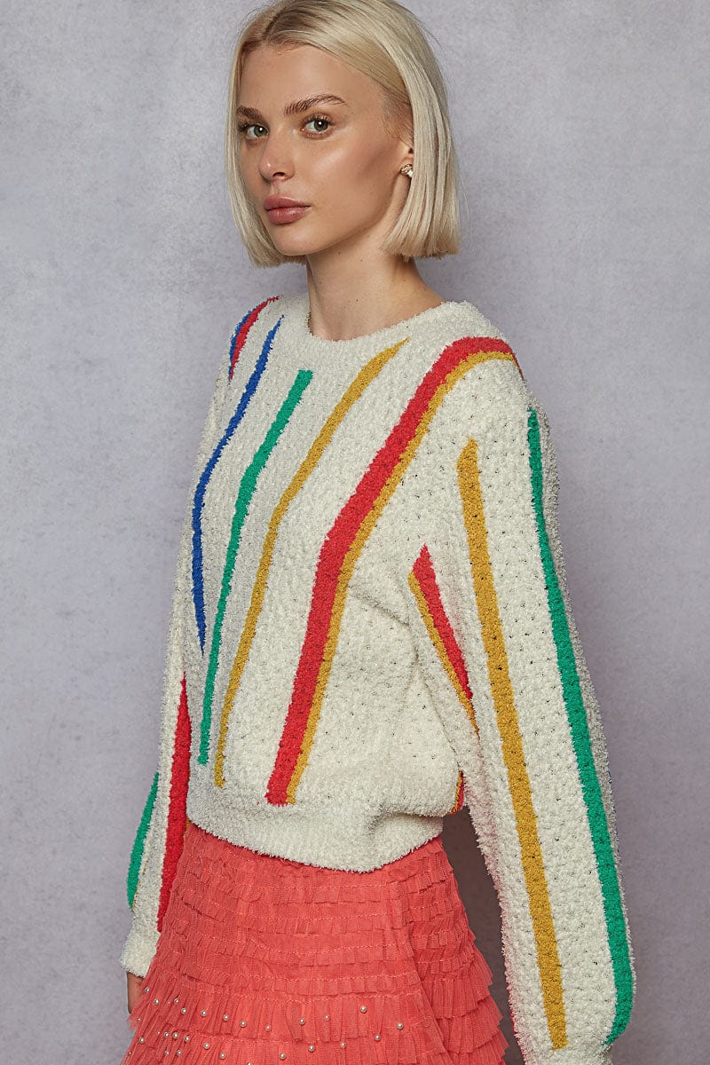 This cozy Carolyn sweater combines a classic cream color with bold, multi-colored stripes for a stylish and versatile look. Its soft fabric and flattering fit make it a must-have for any wardrobe. Elevate your fashion game with this trendy and comfortable sweater!