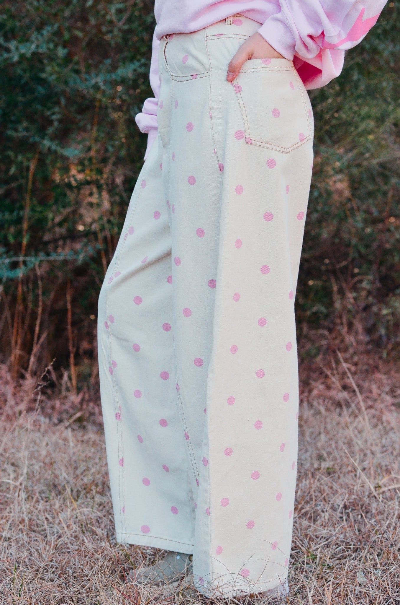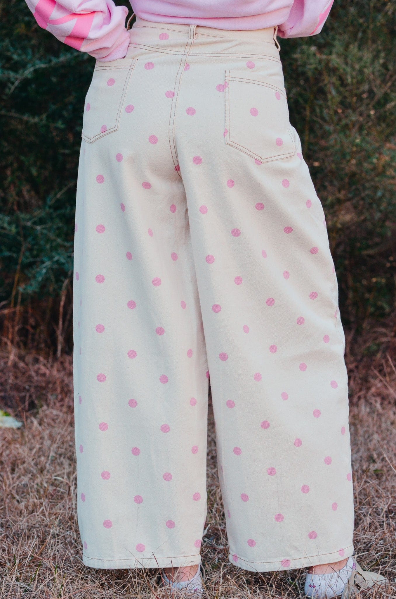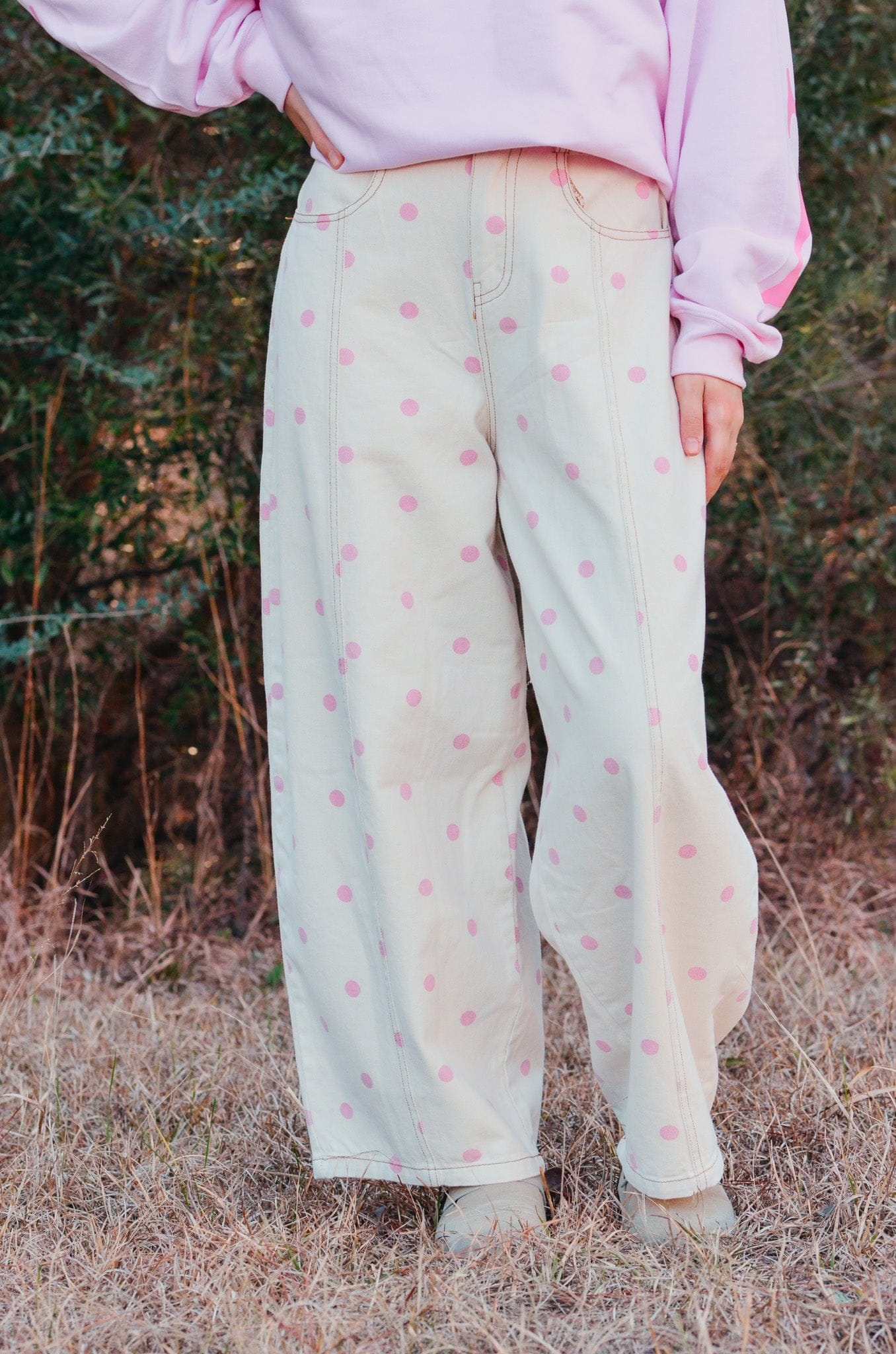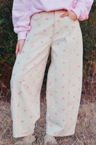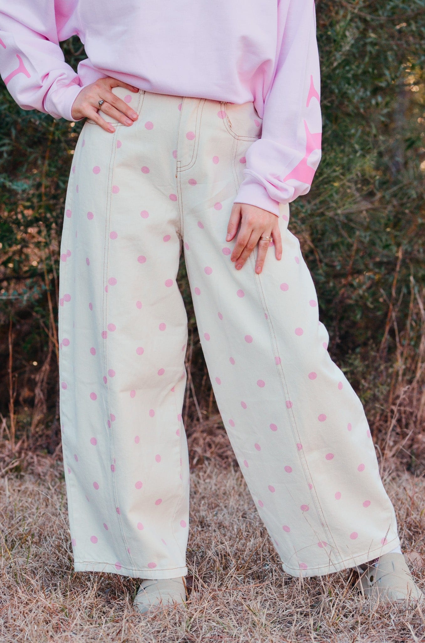 The Dottie Barrel Jeans are made for girly girls who love a statement piece. Featuring a cream denim base with pink polka dots, these jeans have a high-rise waist, super oversized wide legs, and a cropped length for the perfect playful fit. Cute and comfy, they’re ideal for teacher outfits, brunch dates, or adding a fun pop to everyday looks!
