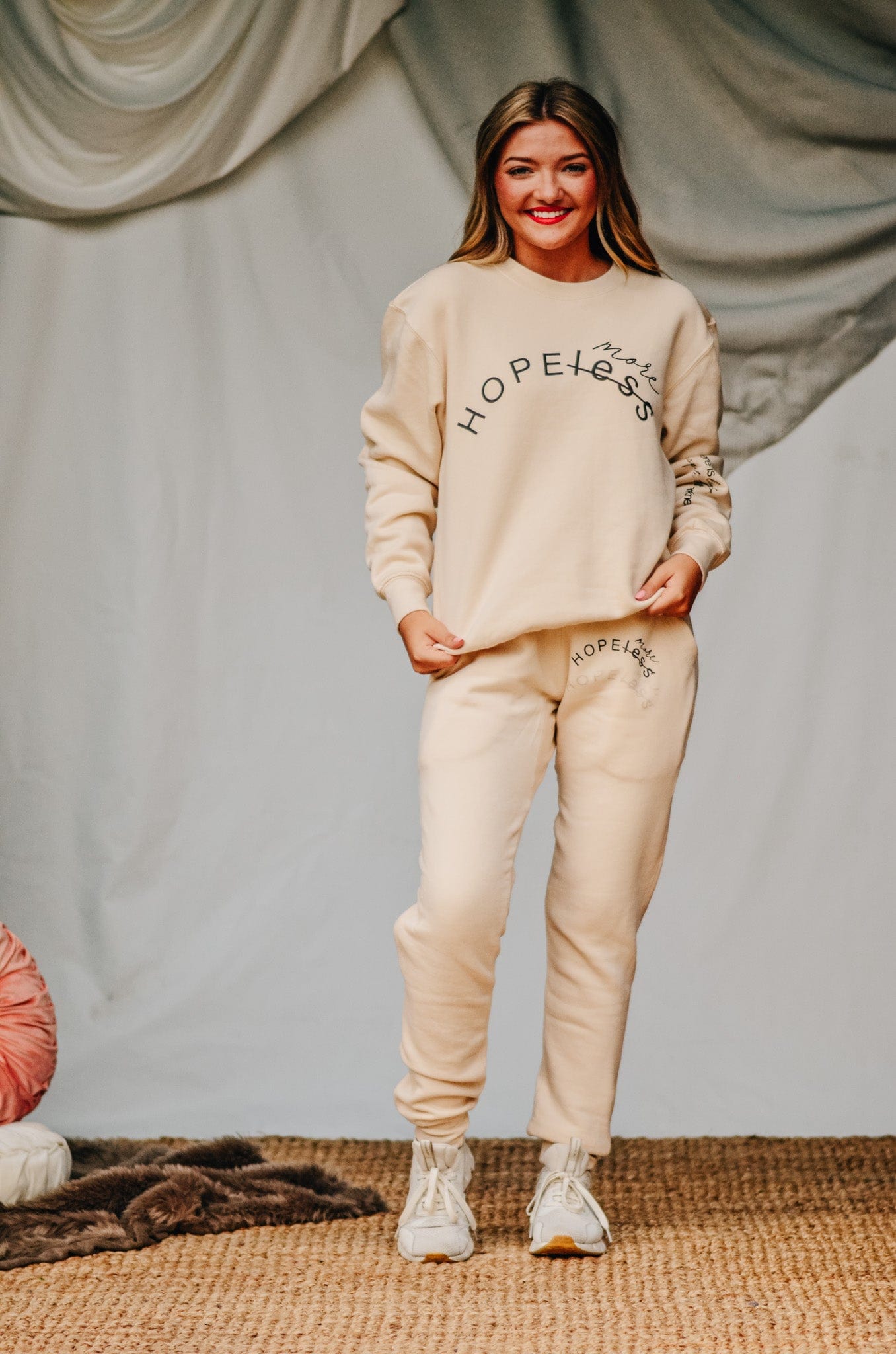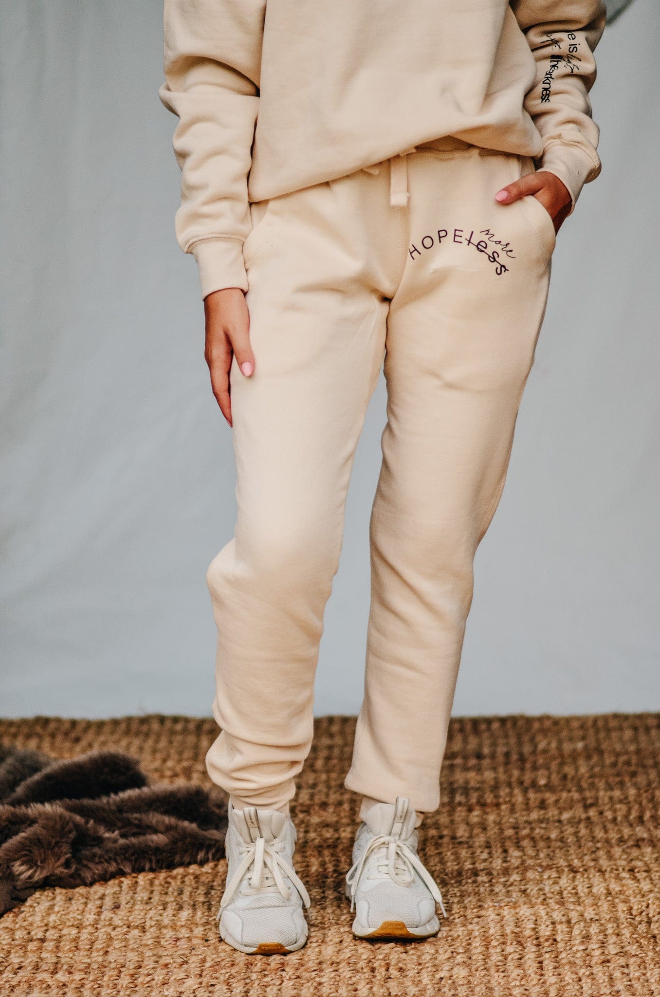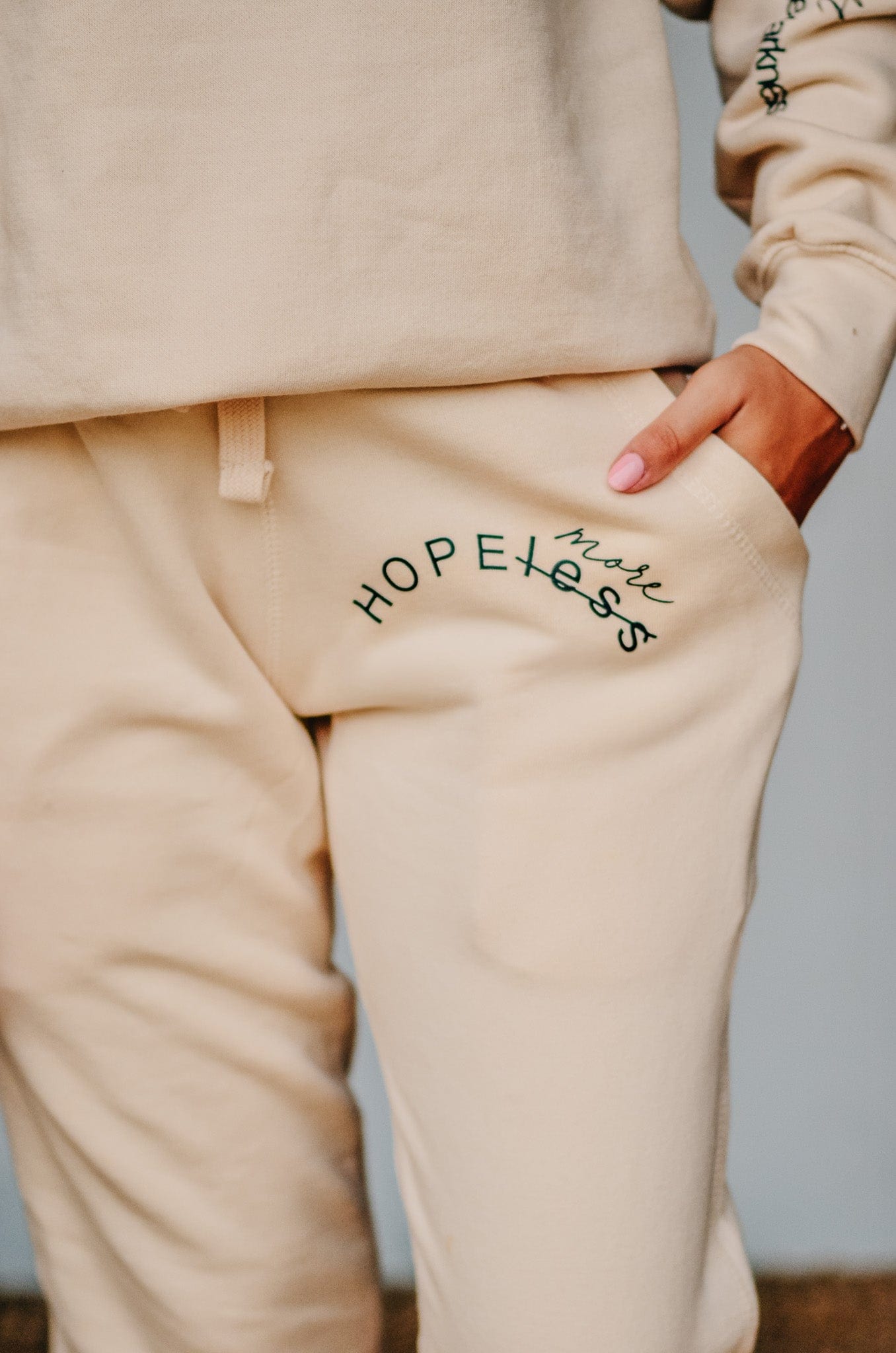 Your new favorite joggers with a message that matters. These relaxed-fit bottoms feature the same bold "hope more" twist on "hopeless," offering a boost of comfort and encouragement. Finished with an adjustable waistband and pockets for everyday wear.