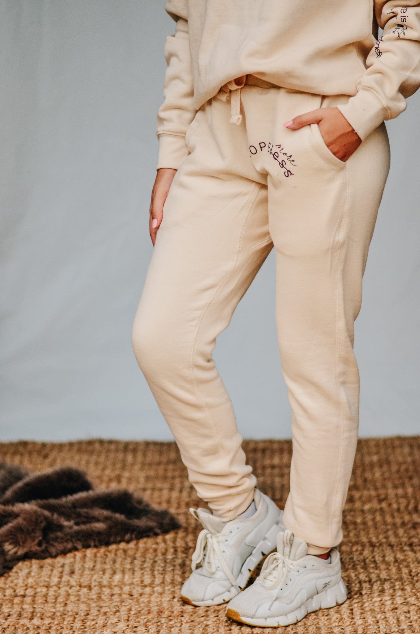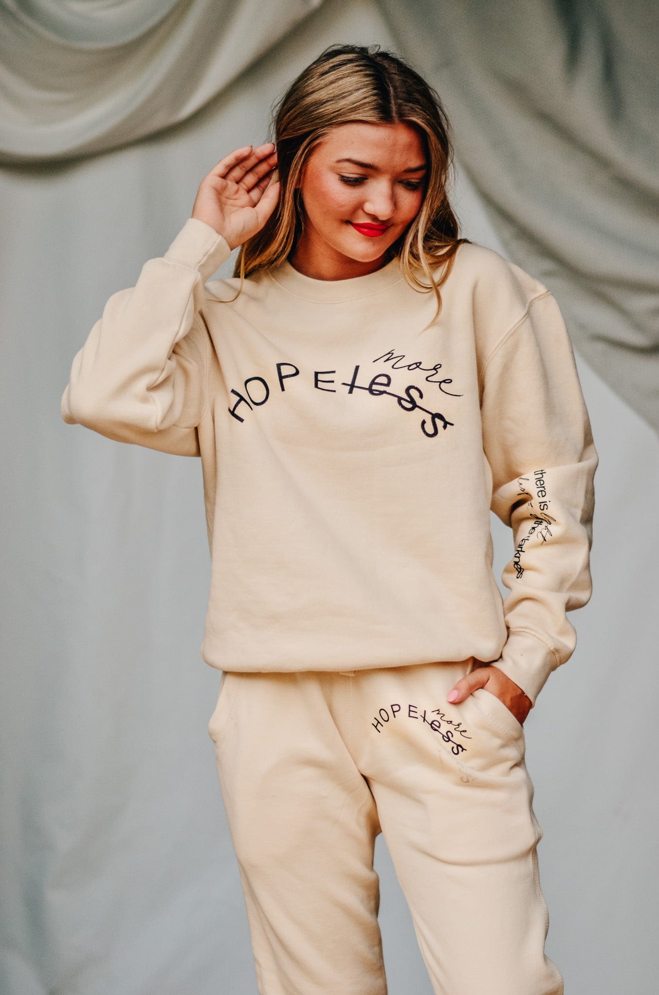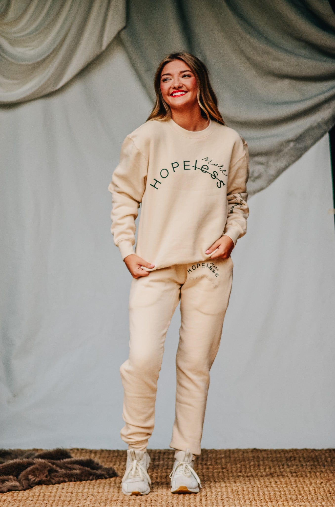 Your new favorite joggers with a message that matters. These relaxed-fit bottoms feature the same bold "hope more" twist on "hopeless," offering a boost of comfort and encouragement. Finished with an adjustable waistband and pockets for everyday wear.