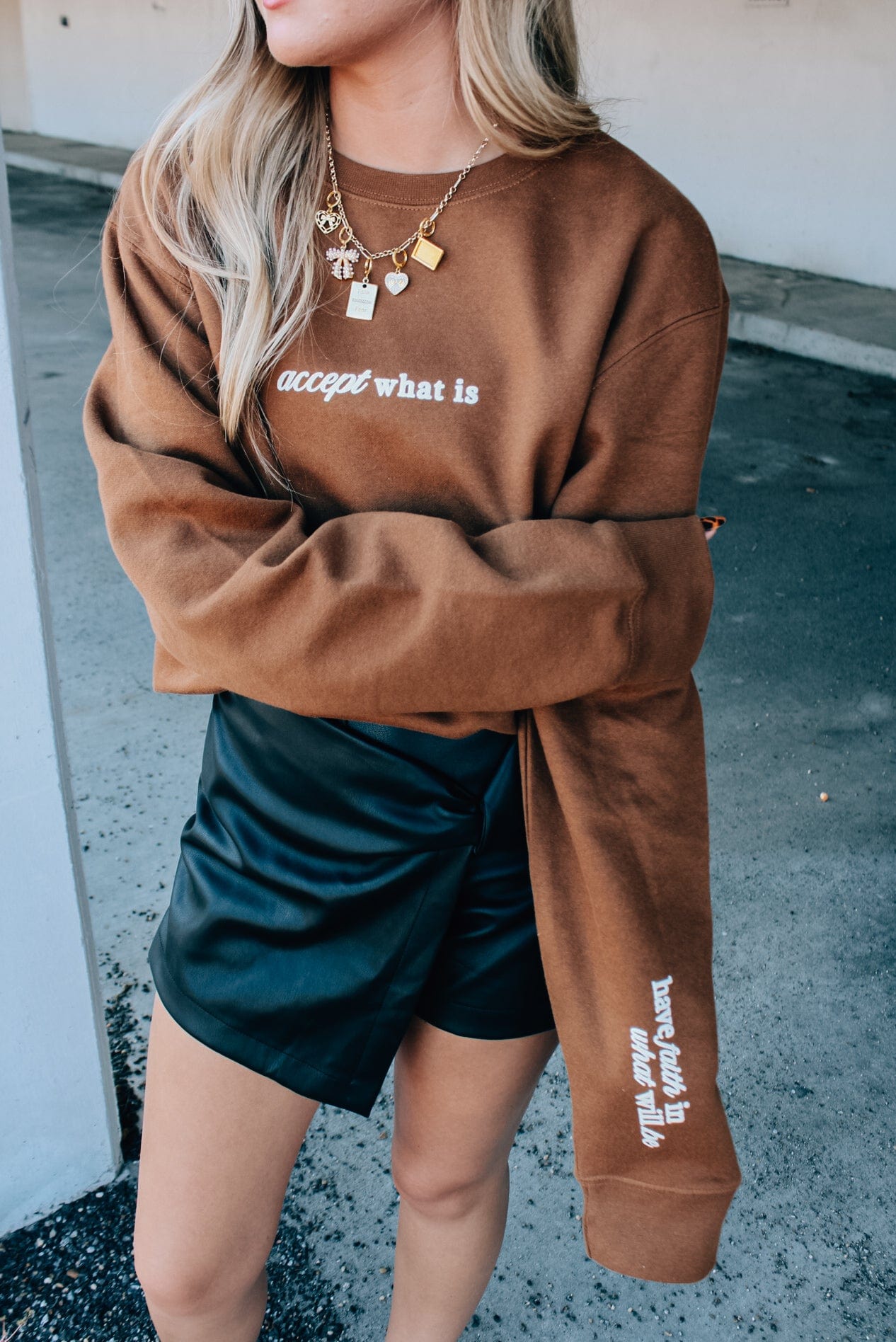 Embrace life’s journey in our Accept What It Is sweatshirt, designed to inspire, empower, and remind you to stay grounded. Featuring the words “Accept What It Is” across the chest, “Let Go of What Was” on the back, and “Have Faith in What Will Be” down the sleeve, this sweatshirt is your daily dose of motivation.