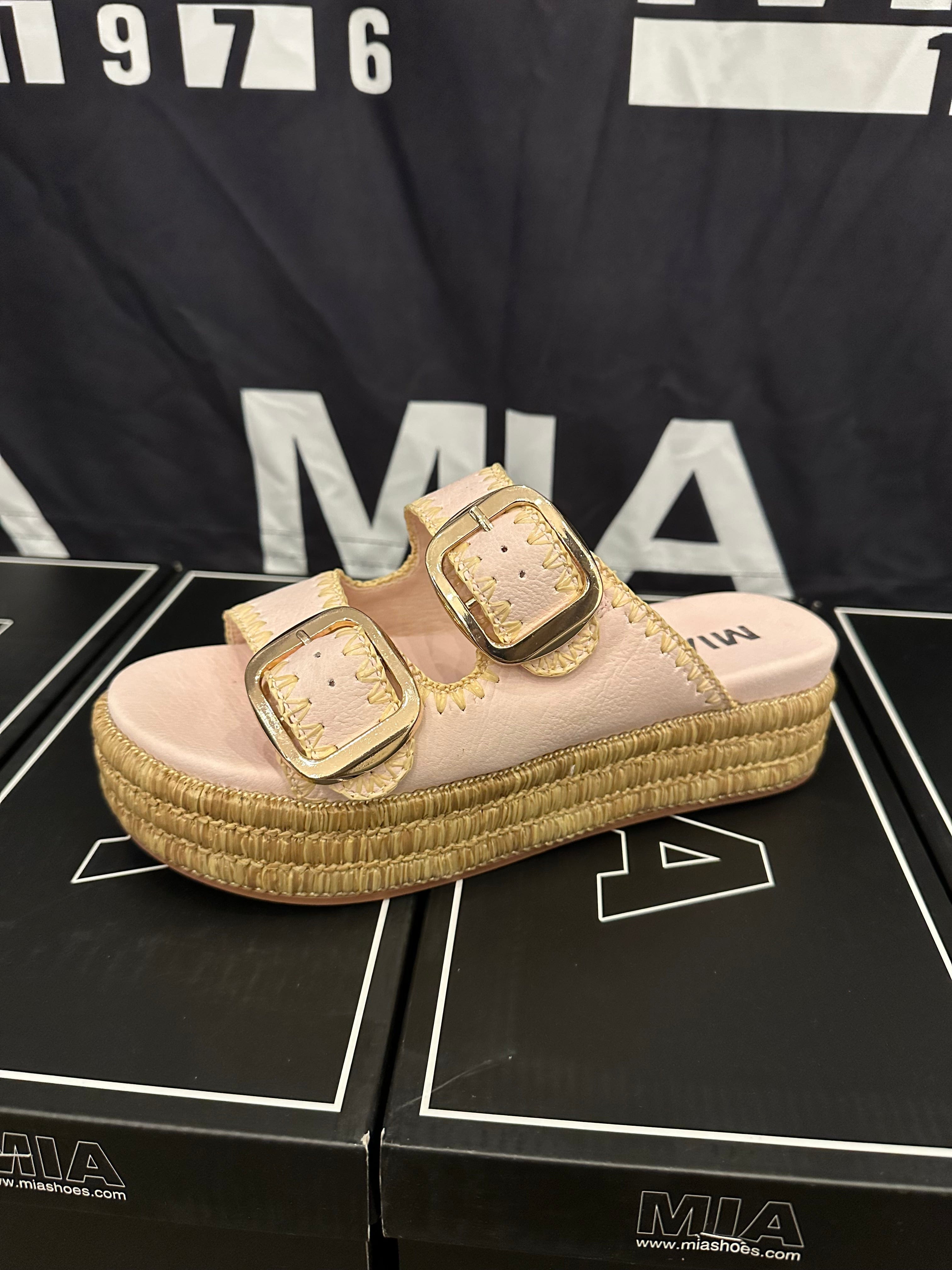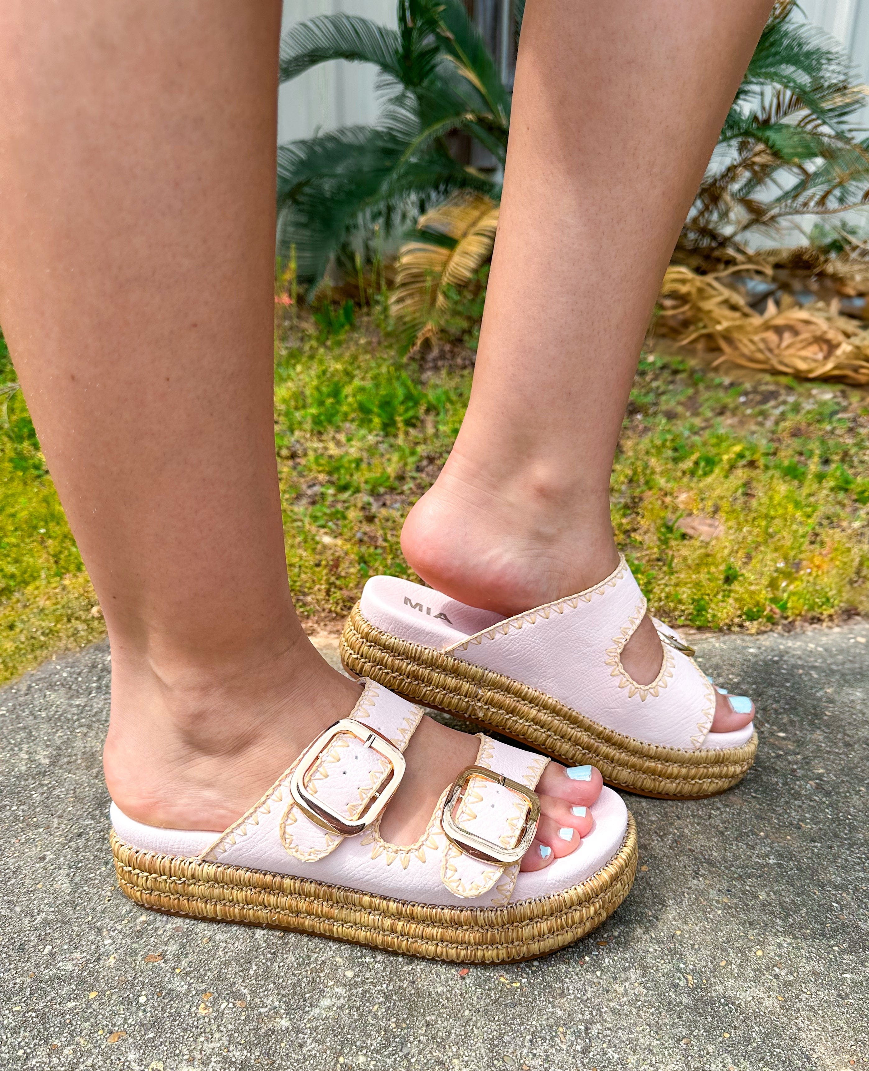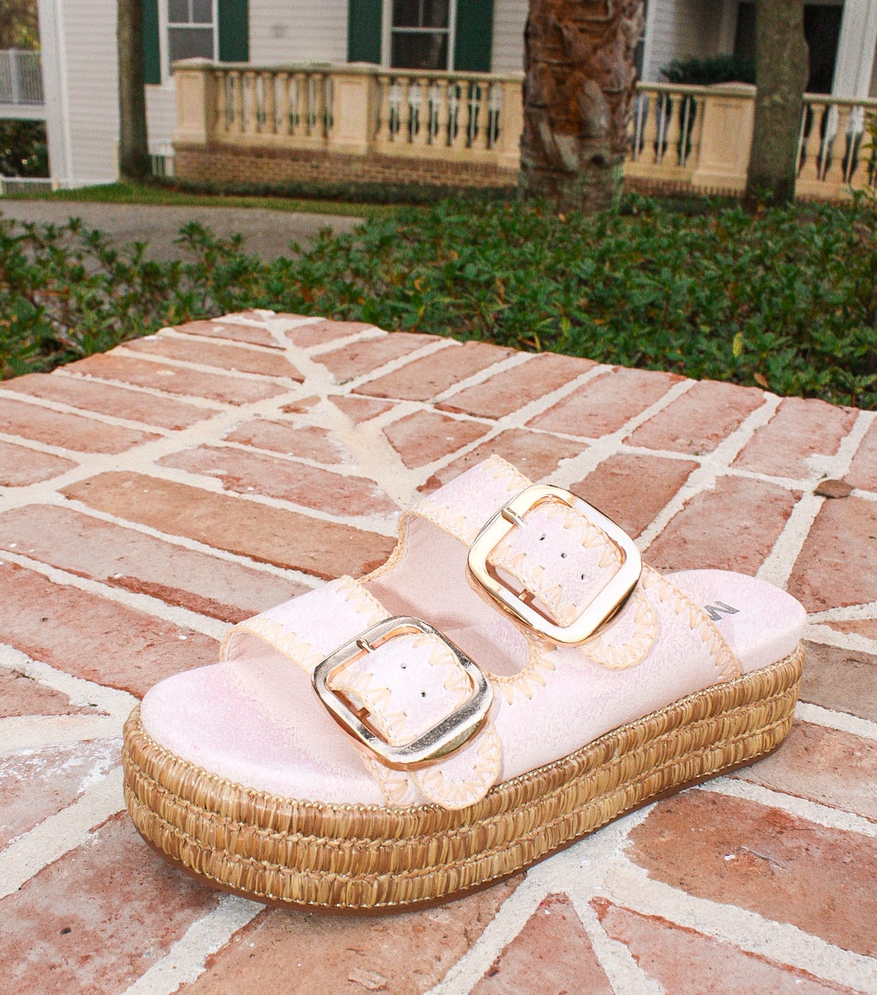 Elevate your style with Marie Platform Sandals! These fun and beachy sandals in baby pink are perfect for a day at the beach or a casual outing. Featuring jute and gold accents, and a double buckle closure, these sandals add a touch of whimsy to any outfit. Step out with confidence and comfort in the Marie Platform Sandals.