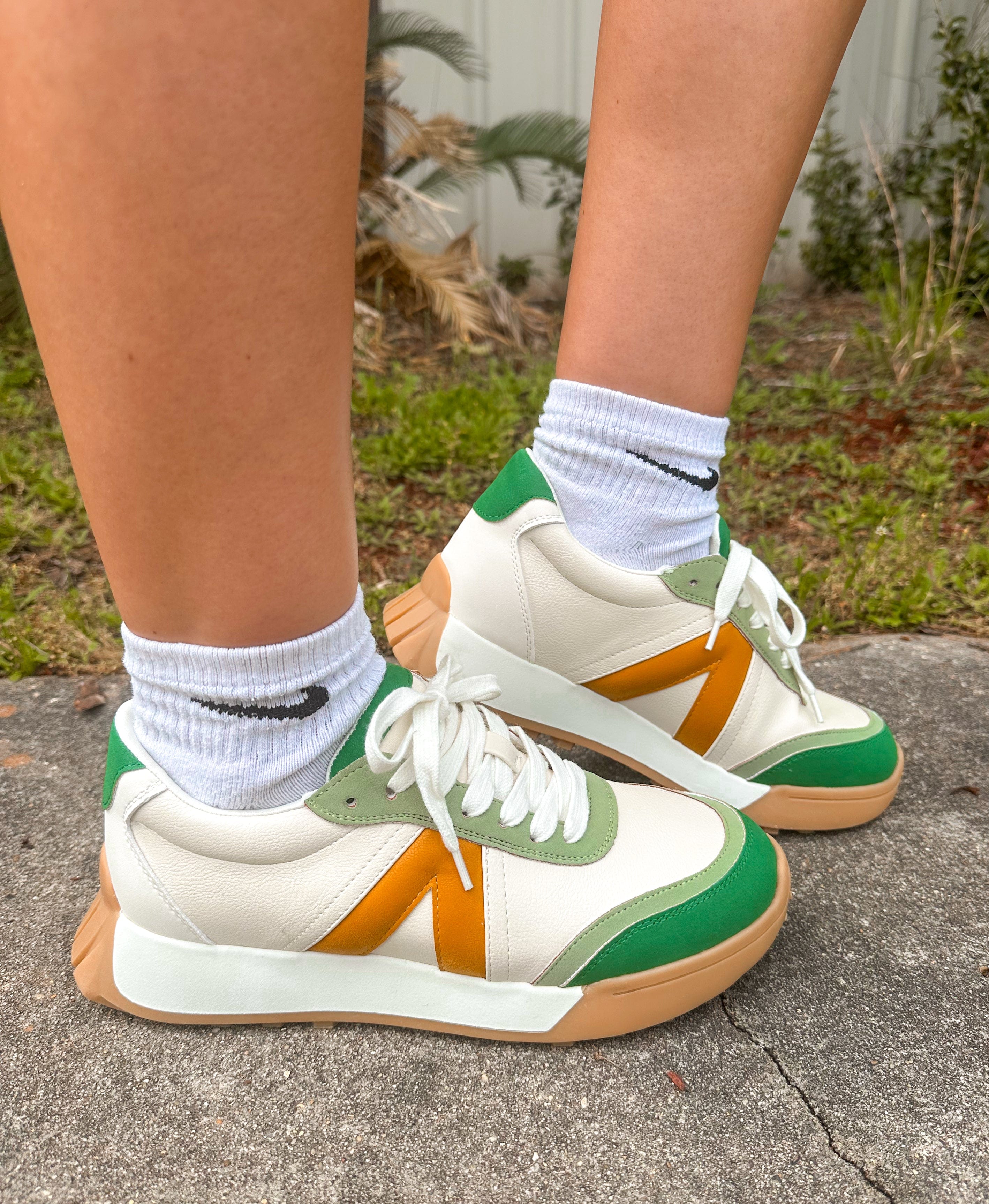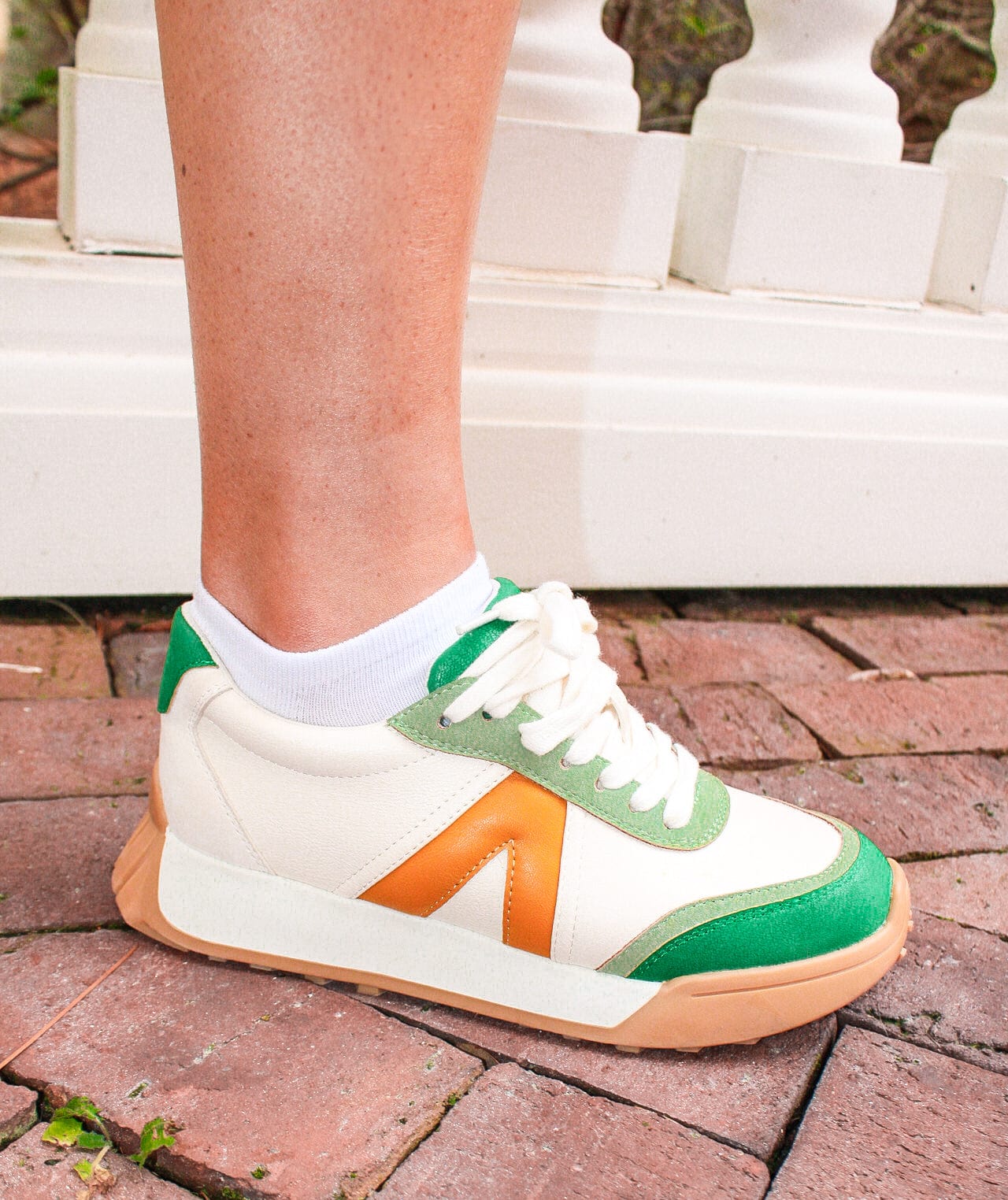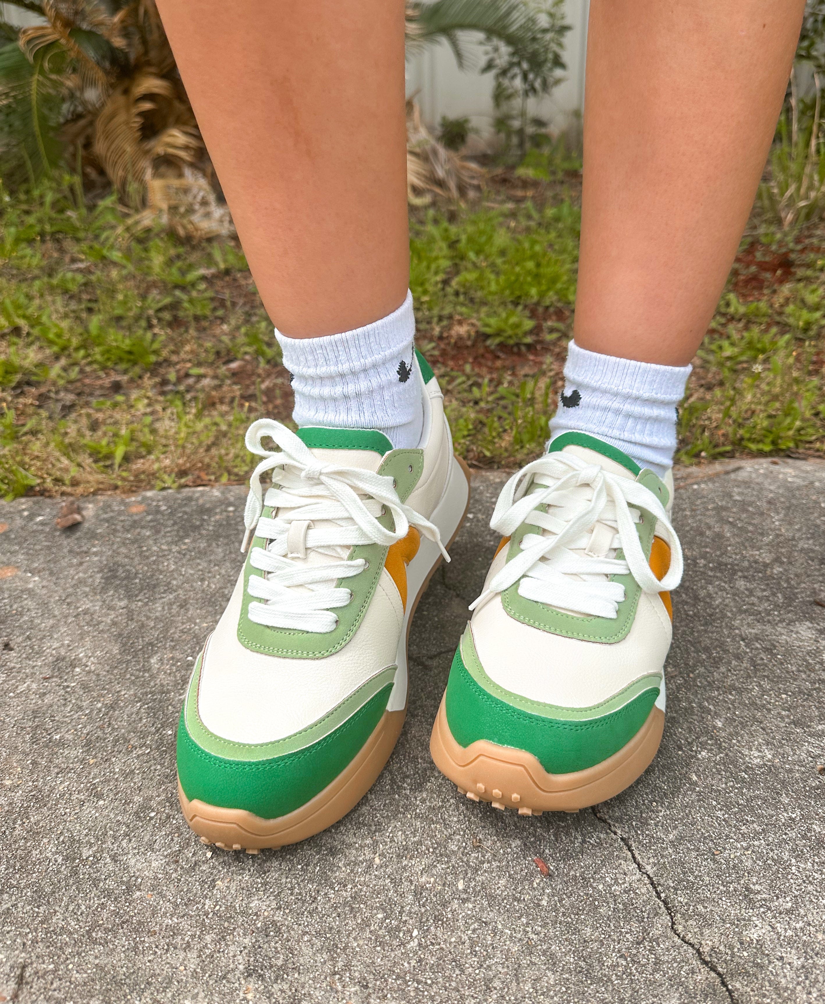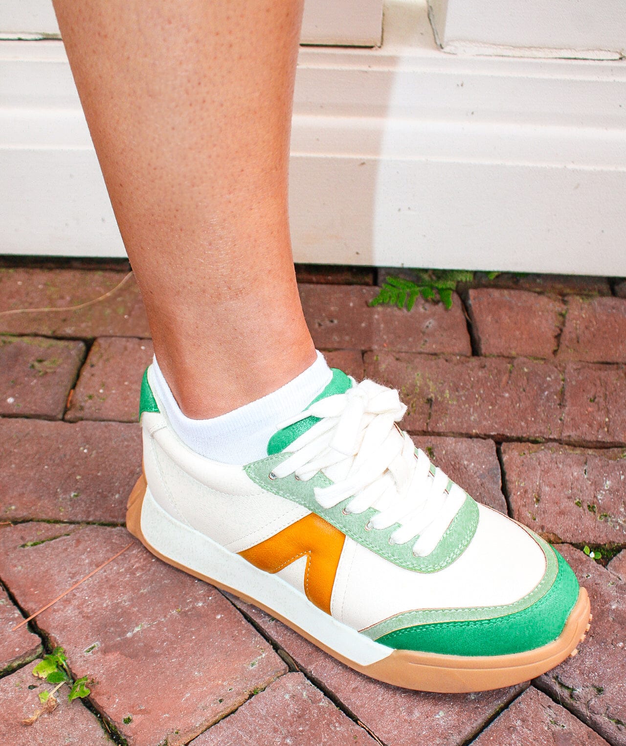 Looking for a versatile pair of sneakers? Look no further than the Allison Sneakers! With their green and mustard yellow detailing, these sneakers will make a stylish statement. Plus, the cream laces and thick, comfortable sole provide both fashion and function. Dress them up or down for any occasion.