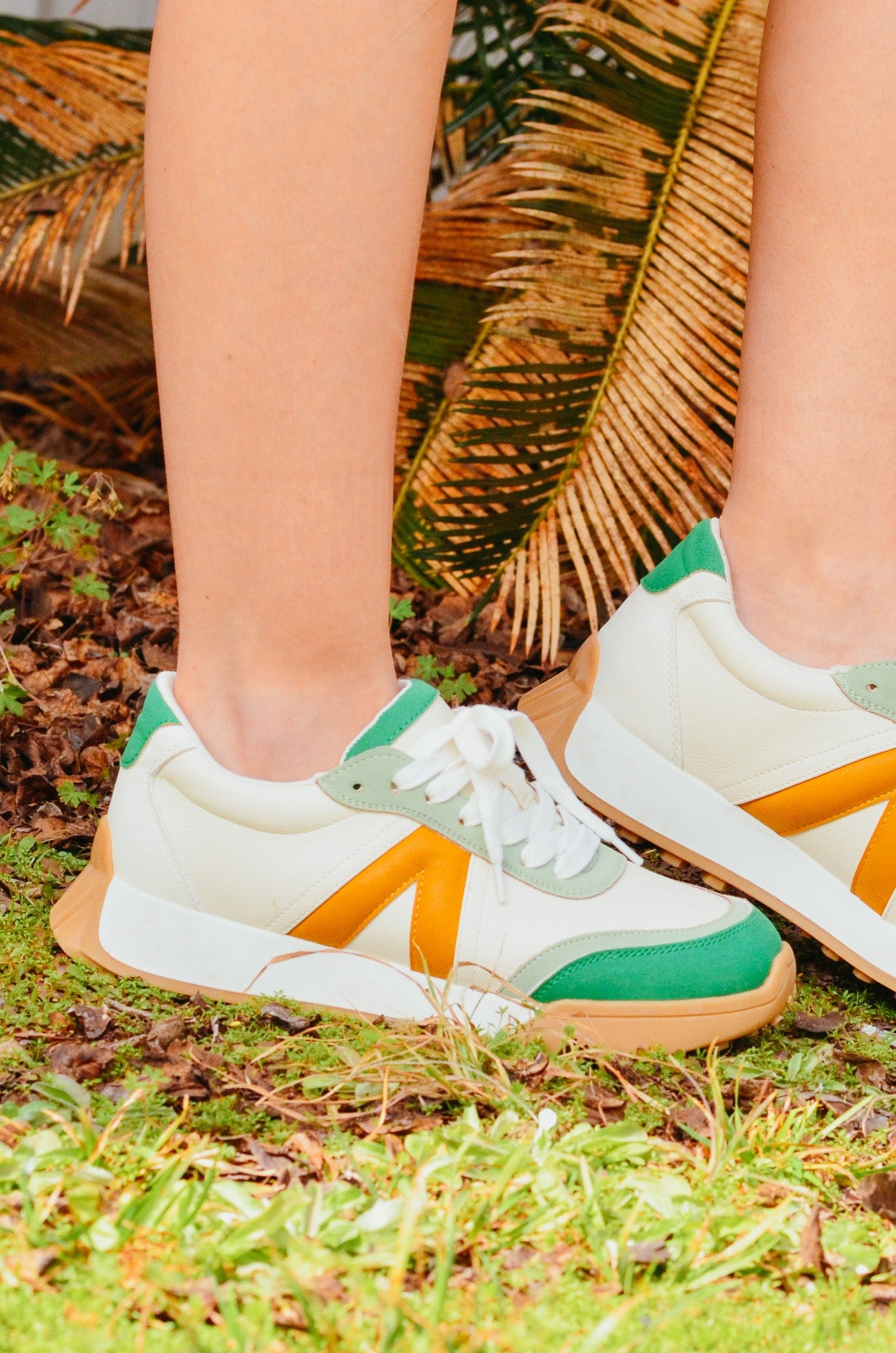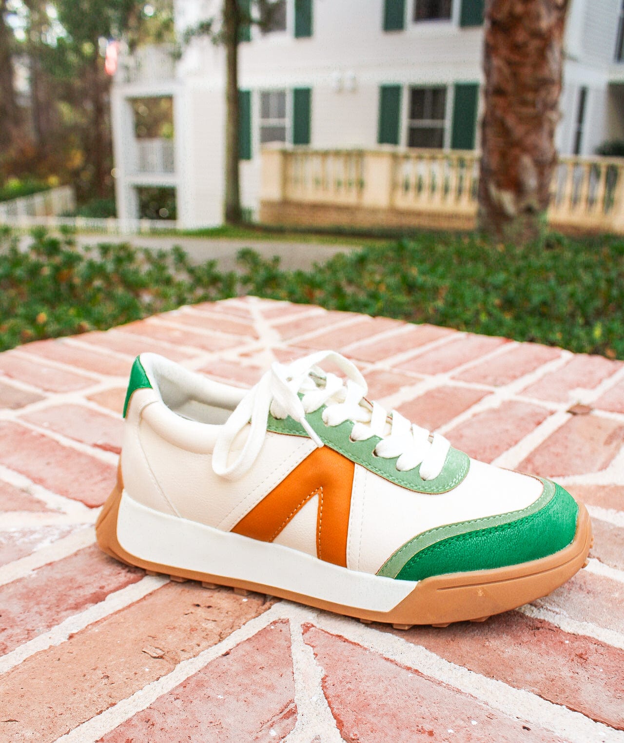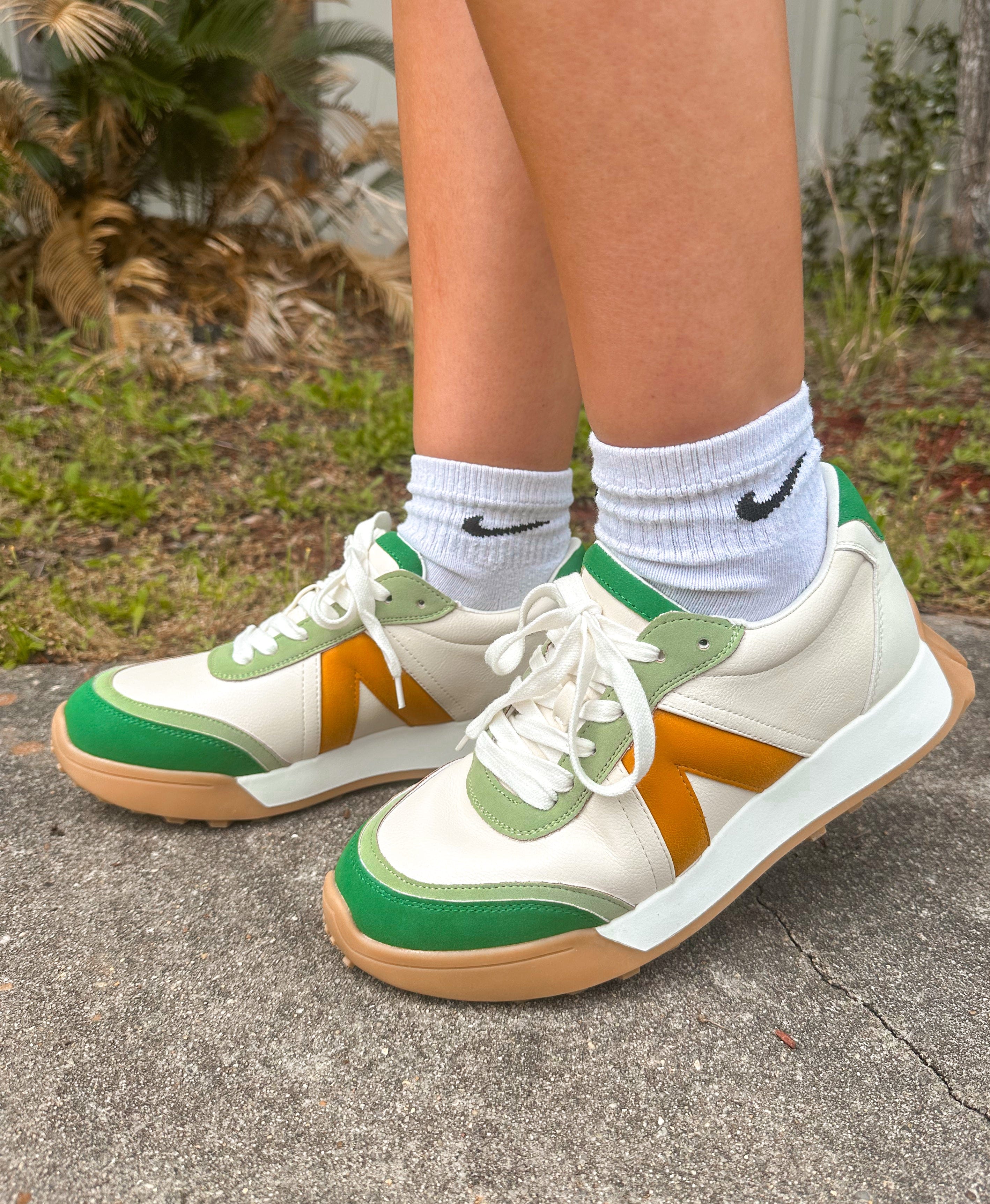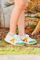 Looking for a versatile pair of sneakers? Look no further than the Allison Sneakers! With their green and mustard yellow detailing, these sneakers will make a stylish statement. Plus, the cream laces and thick, comfortable sole provide both fashion and function. Dress them up or down for any occasion.