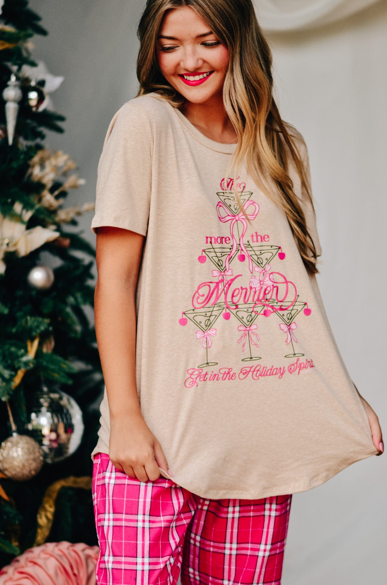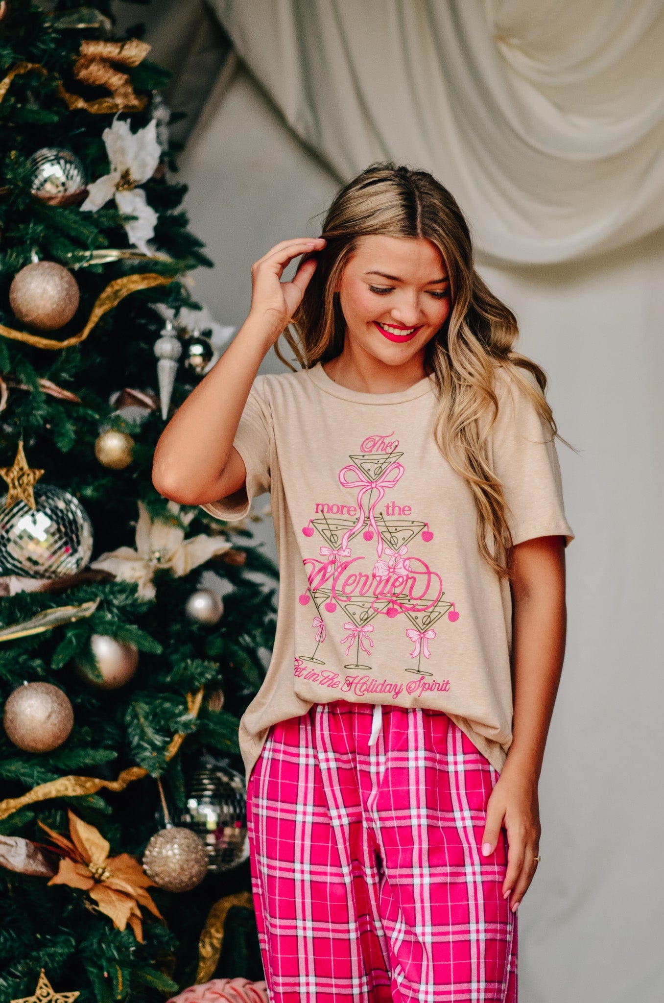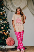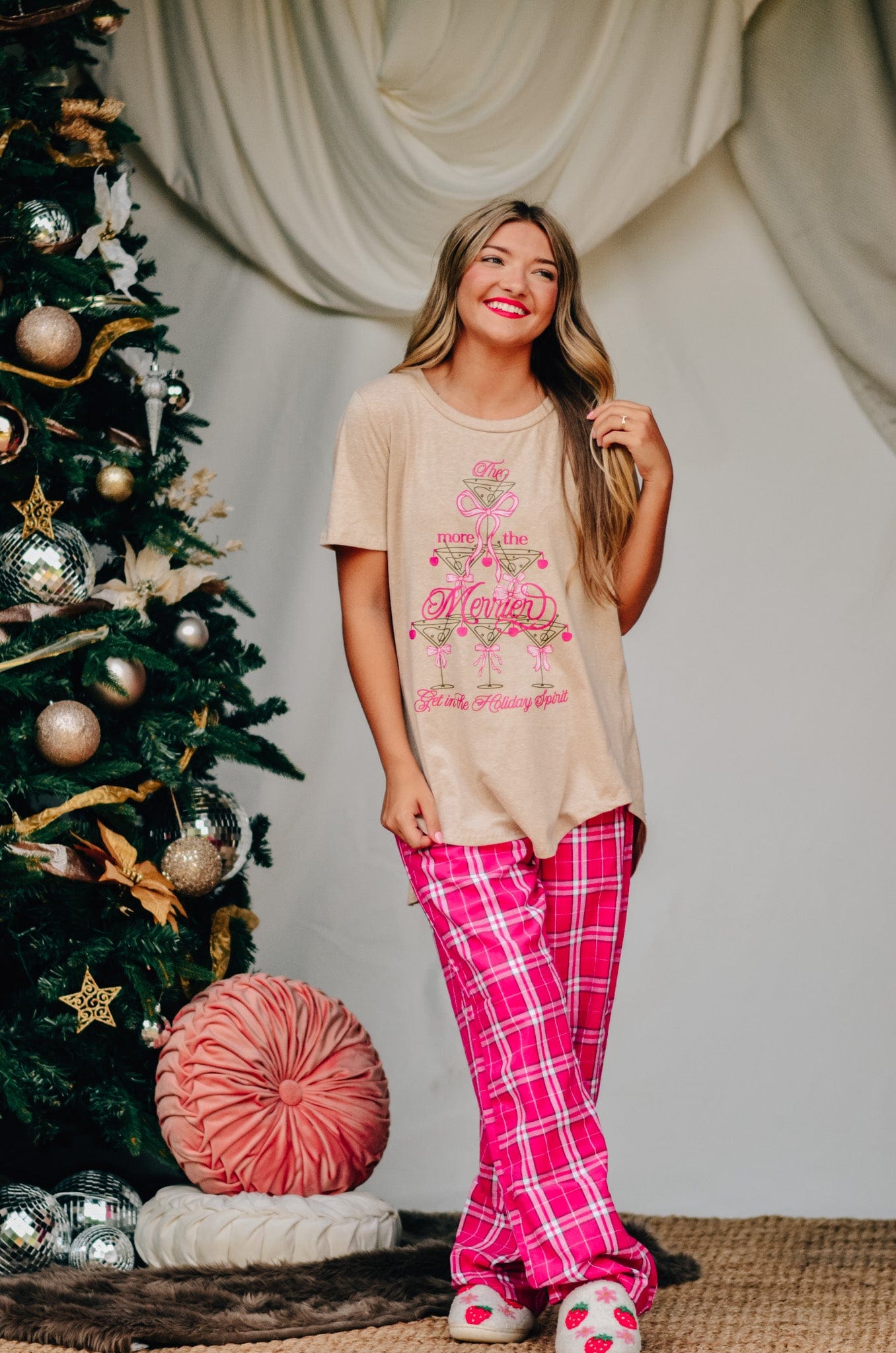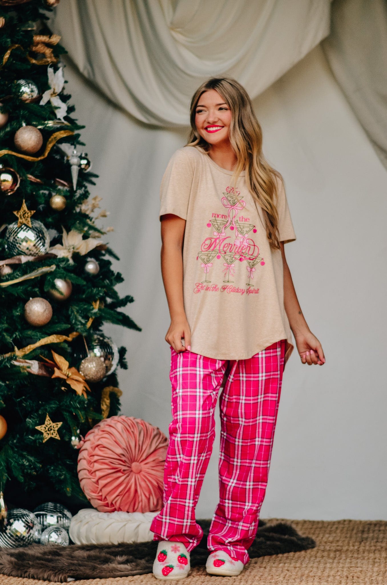 Experience cozy holiday comfort with the More Merrier PJ Set, featuring a popular scoop tee adorned with a festive martini glass bow graphic. Crafted from super soft fabric, the tee pairs perfectly with elastic drawstring plaid pants for an adjustable, relaxed fit. This pink Christmas-themed set combines style and comfort, making it ideal for festive lounging or gifting during the holiday season.