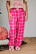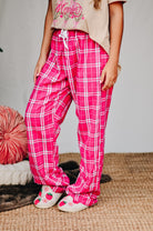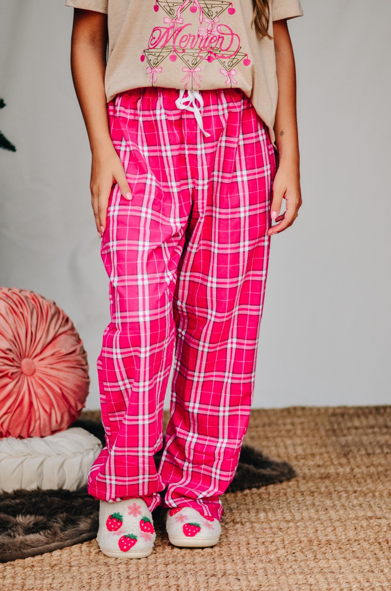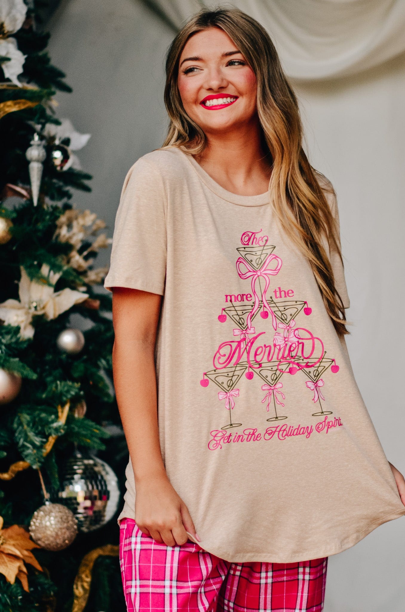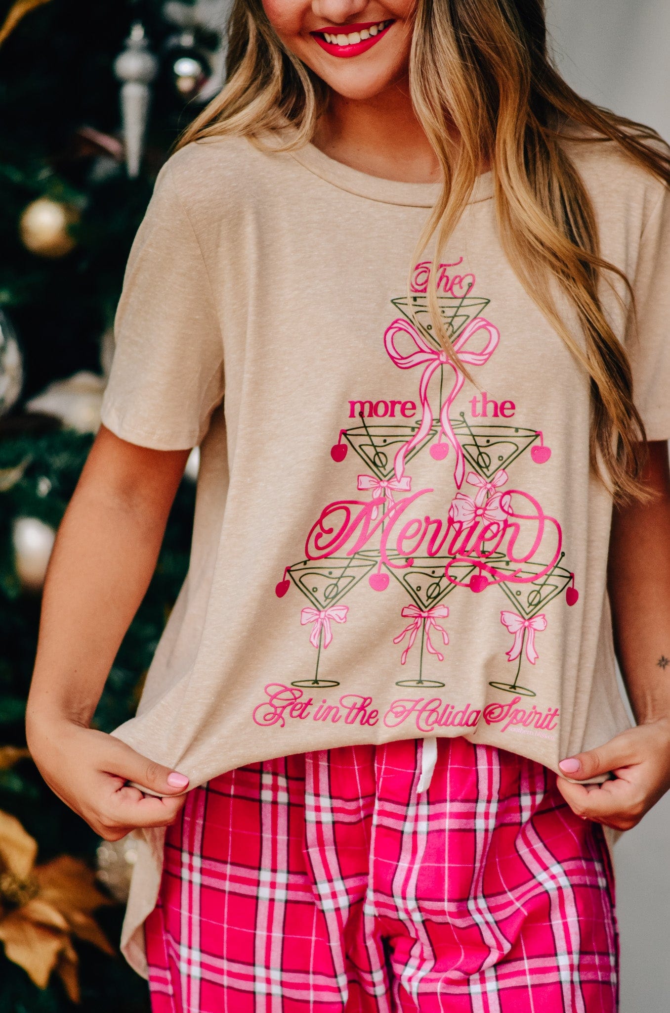 Experience cozy holiday comfort with the More Merrier PJ Set, featuring a popular scoop tee adorned with a festive martini glass bow graphic. Crafted from super soft fabric, the tee pairs perfectly with elastic drawstring plaid pants for an adjustable, relaxed fit. This pink Christmas-themed set combines style and comfort, making it ideal for festive lounging or gifting during the holiday season.