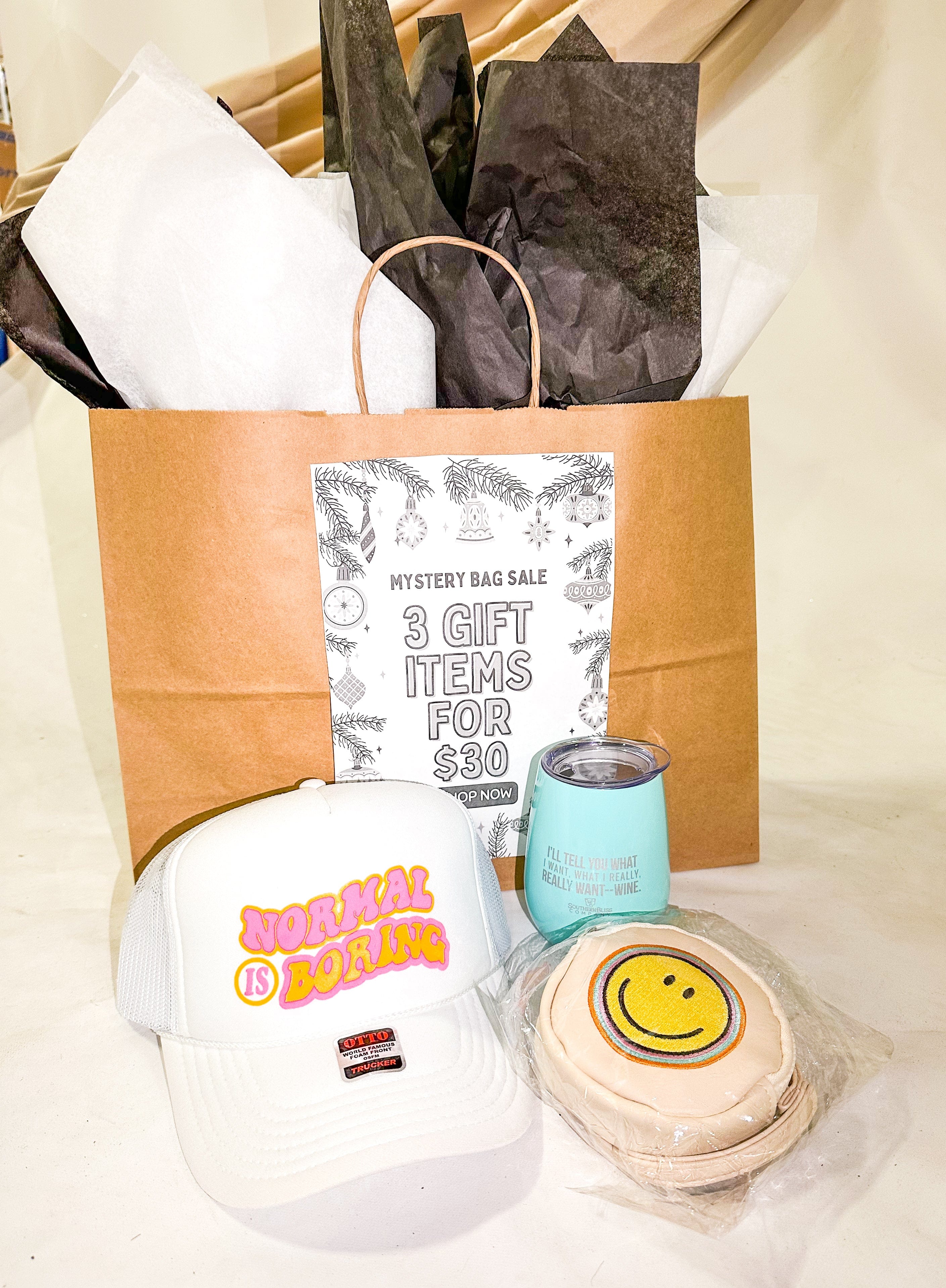 Items may include (all mystery bags vary in products) : jewelry, purses, car freshies, hair products, tumblers, hats, and more!
