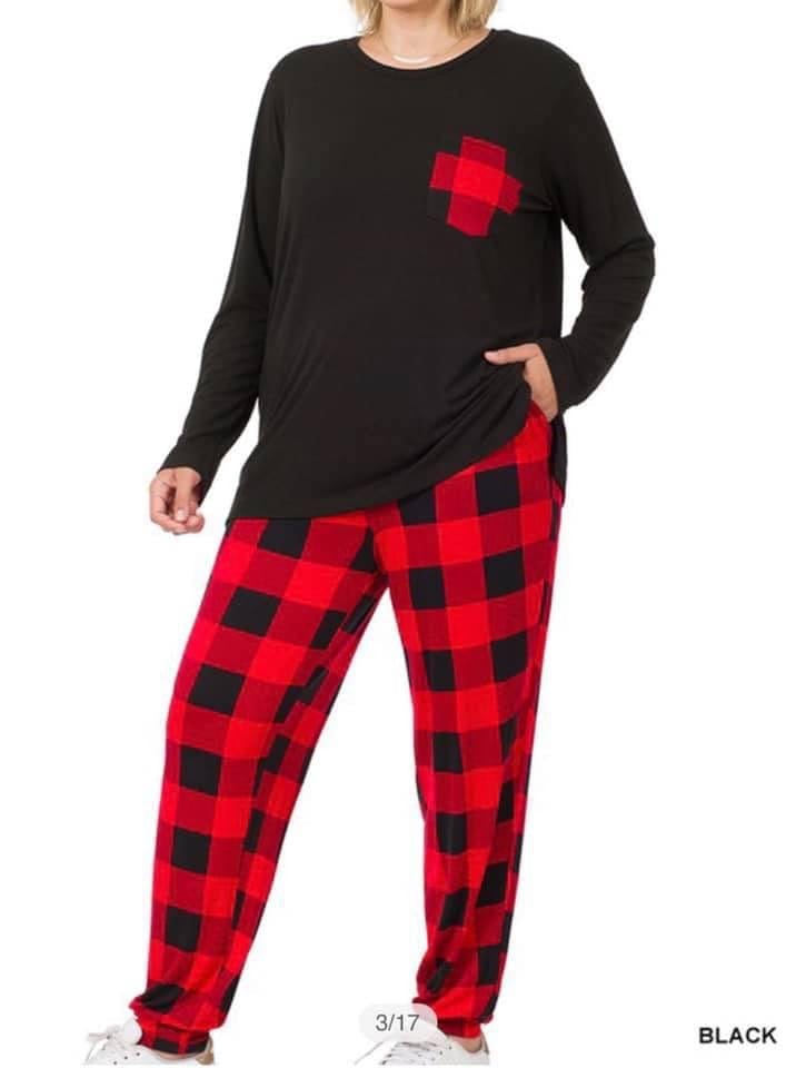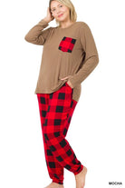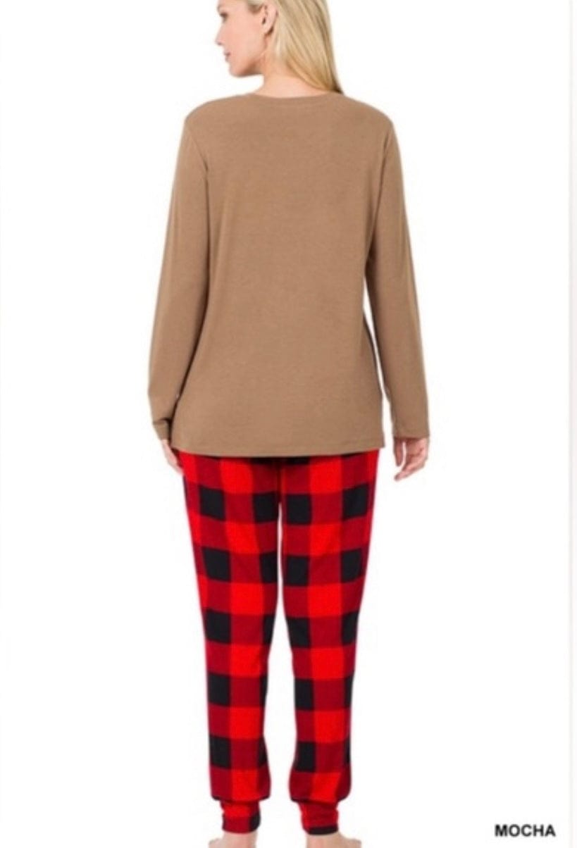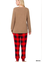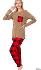 Zenana pajama set with red and black plaid pants with pockets, long sleeve mocha top with matching pocket. Super soft and cozy rayon/spandex blend.