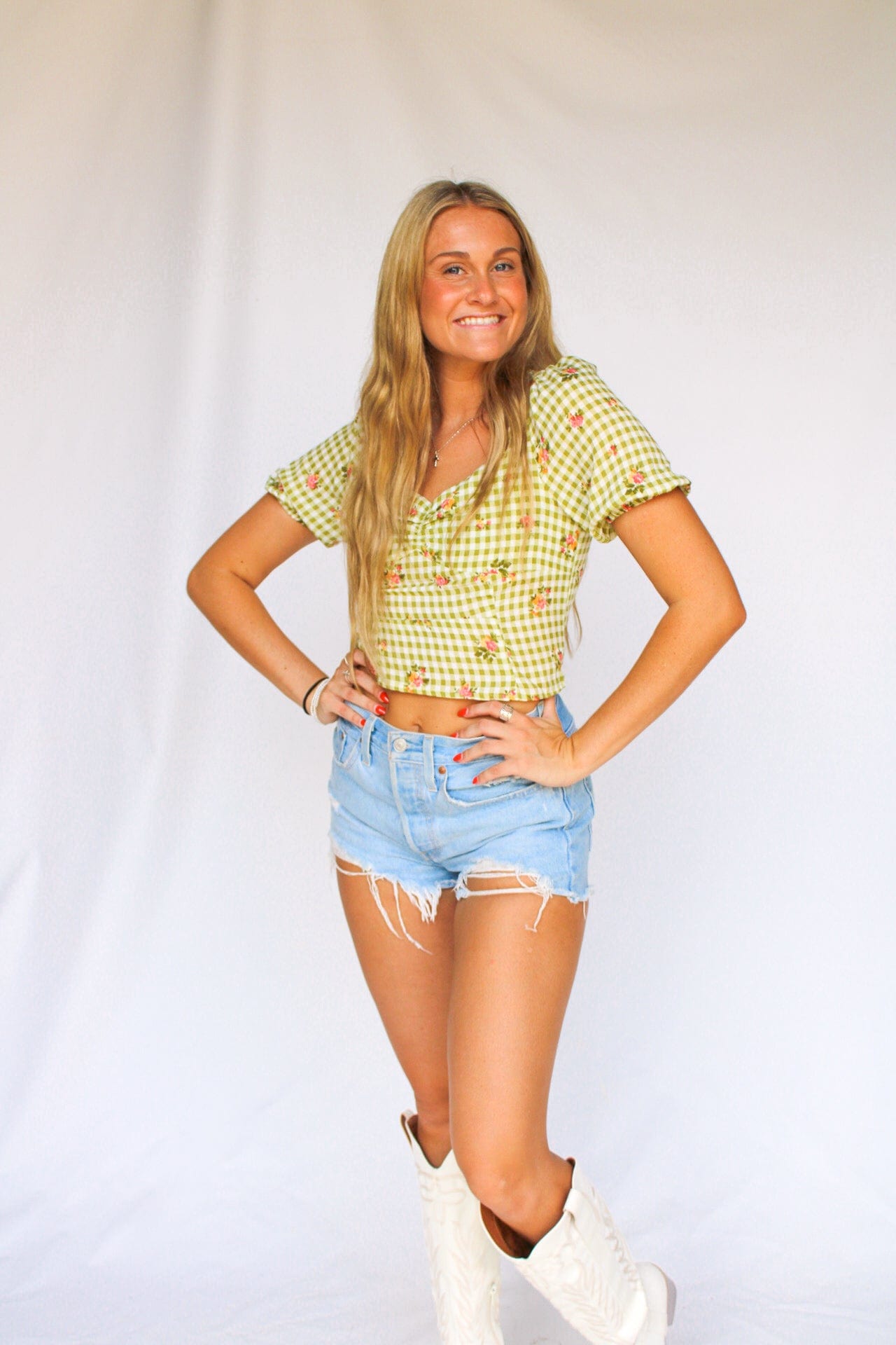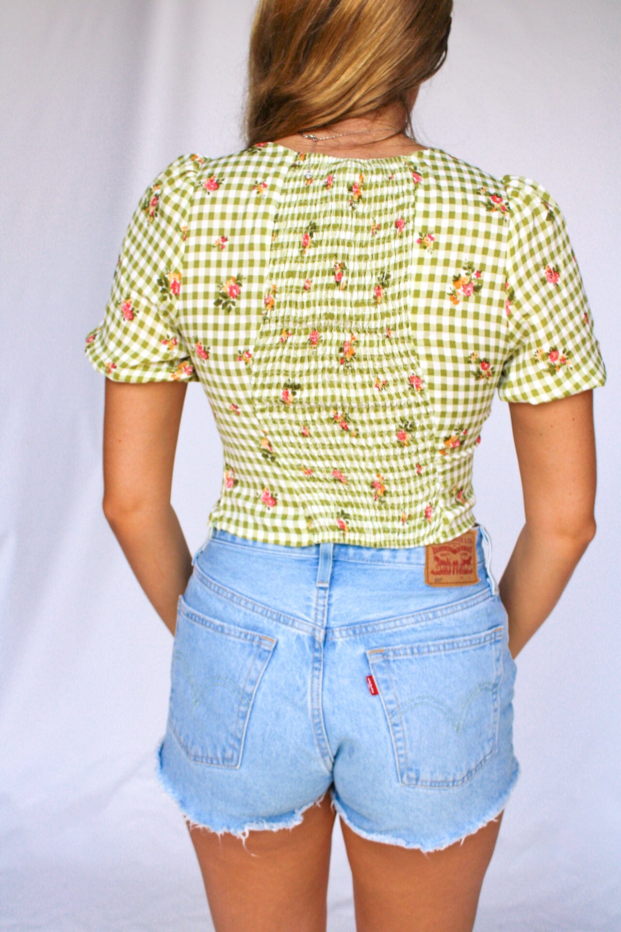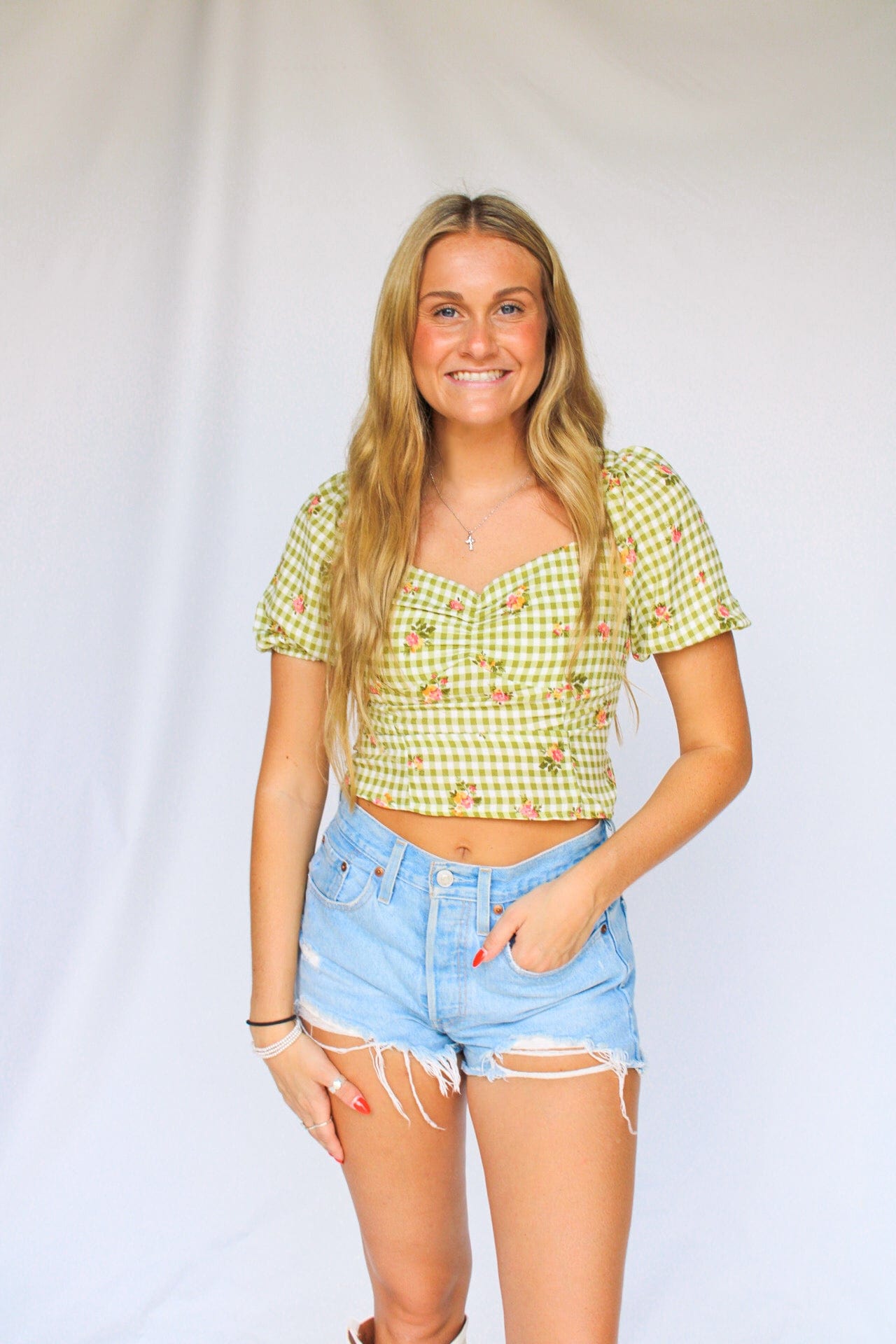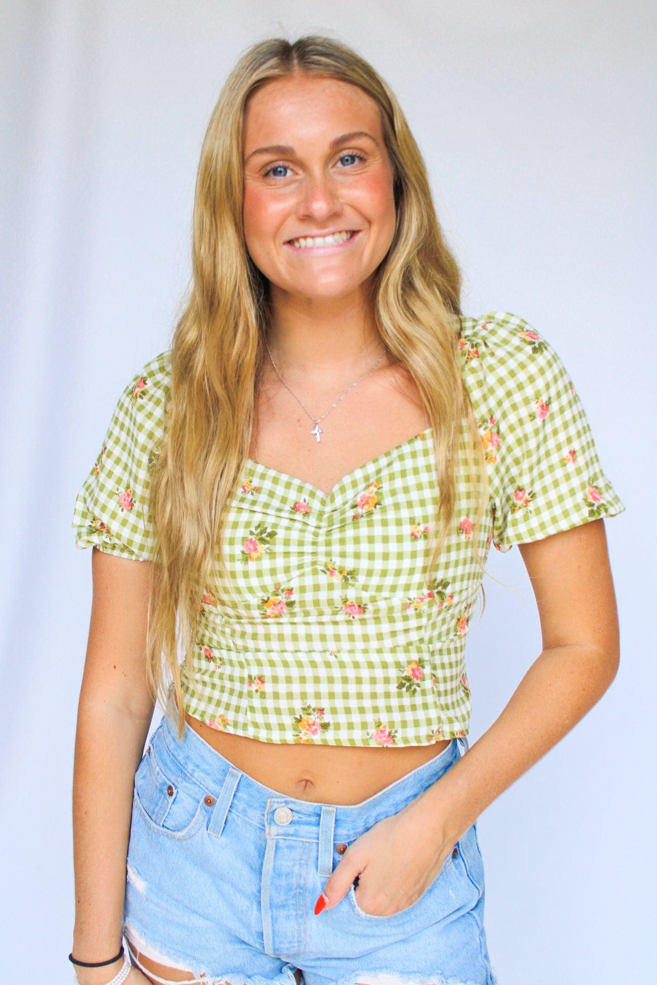 Add some flower power to your wardrobe with the Garden Party Top! This playful smock top features a green gingham pattern and charming flower accents. The cropped, puff style adds a touch of whimsy to any outfit, making it perfect for a garden party or any casual occasion.