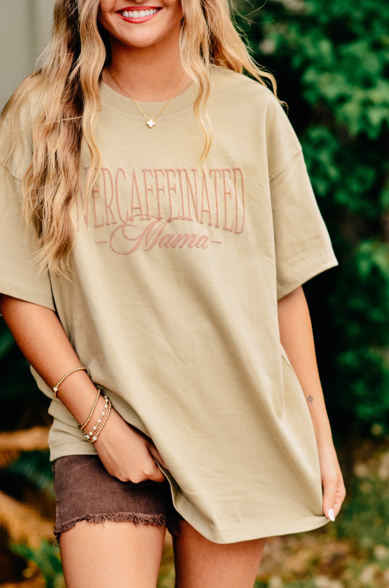 For the mamas who run on caffeine and a little bit of chaos — the Overcaffeinated Mama Mock Neck Tee is a must-have mood. Made from soft, breathable fabric in a versatile khaki green, this tee features bold puff ink lettering that says it all. Whether you're juggling errands, kids, or just your fifth cup of coffee, this comfy classic has your back (and your energy level).
