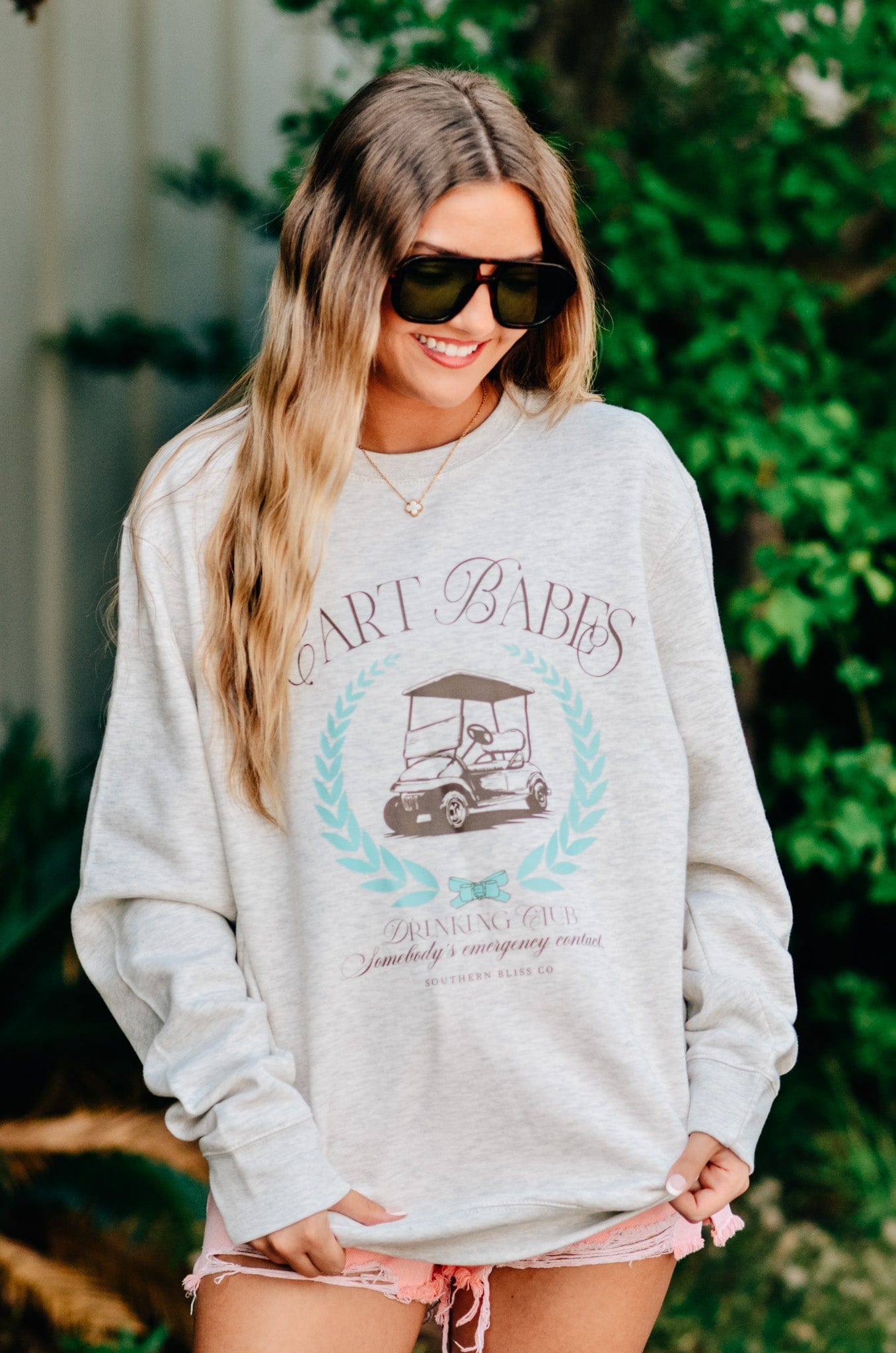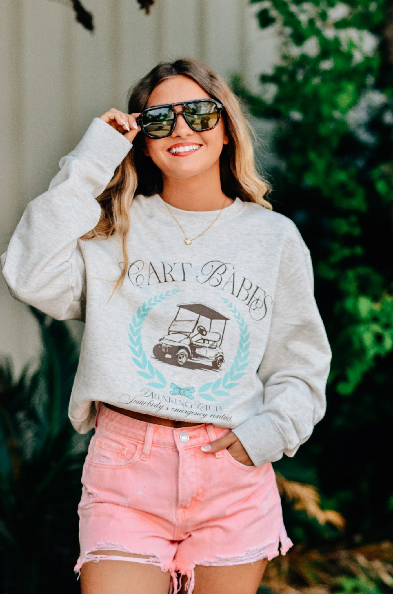 Where the drinks are cold, the golf cart is gassed up, and the crew is unmatched — the Cart Babes Oatmeal Sweatshirt is for the girls who know how to turn a casual cruise into a full-on event. This premium oatmeal-colored sweatshirt features the playful Cart Babes Drinking Club graphic, complete with a golf cart and a nod to someone’s emergency contact (because, safety first… kind of). Super soft with a relaxed, slightly oversized fit, it's made for laid-back days, course chaos, and post-ride cocktails.