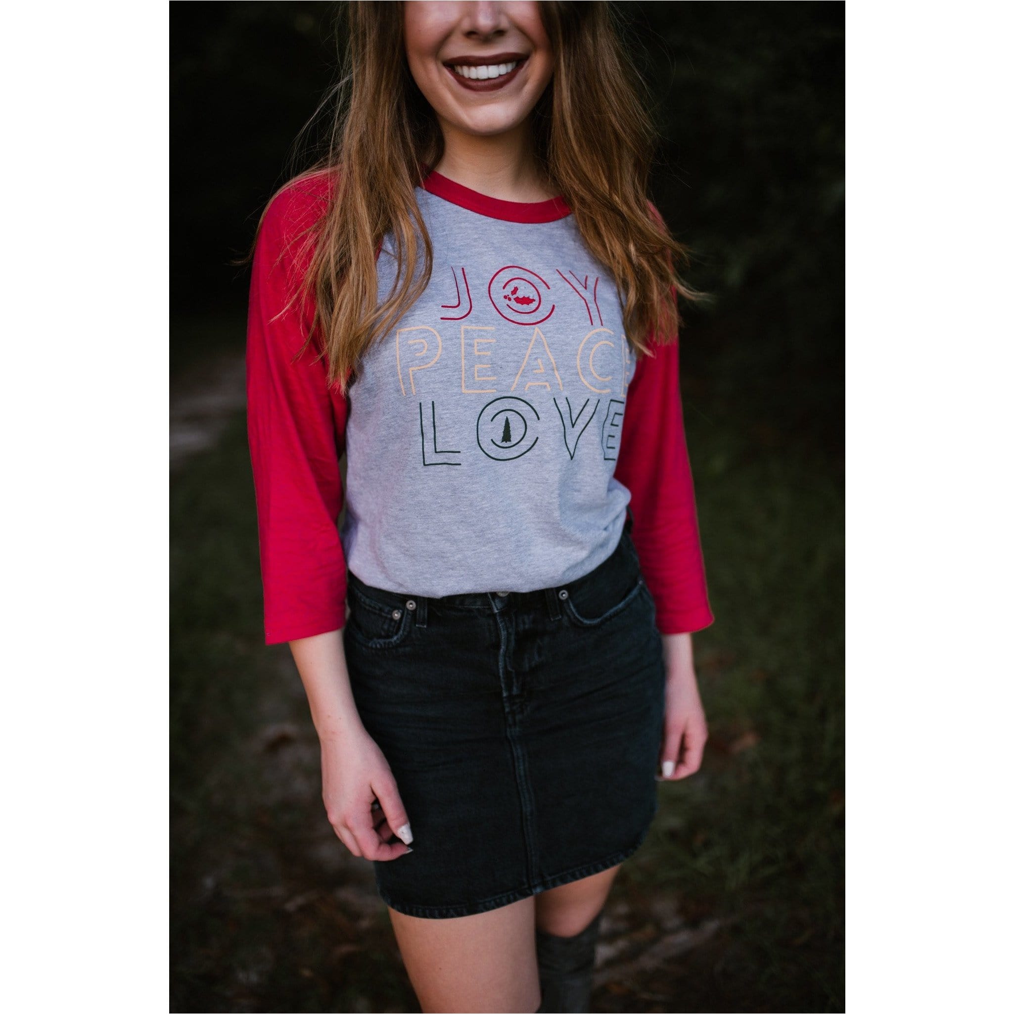 Joy Peace Love Red/gray raglan tee