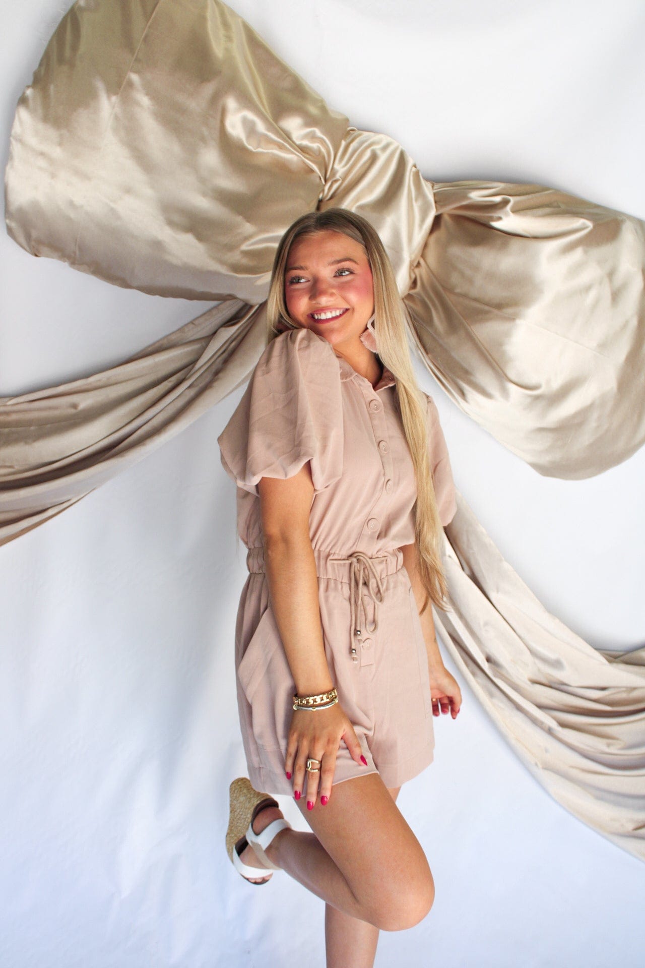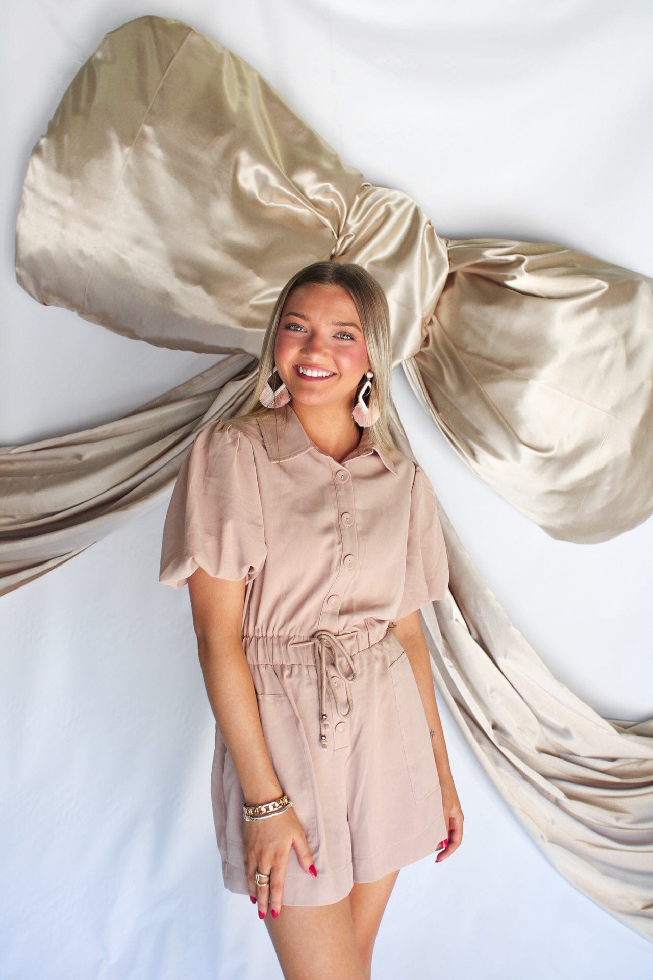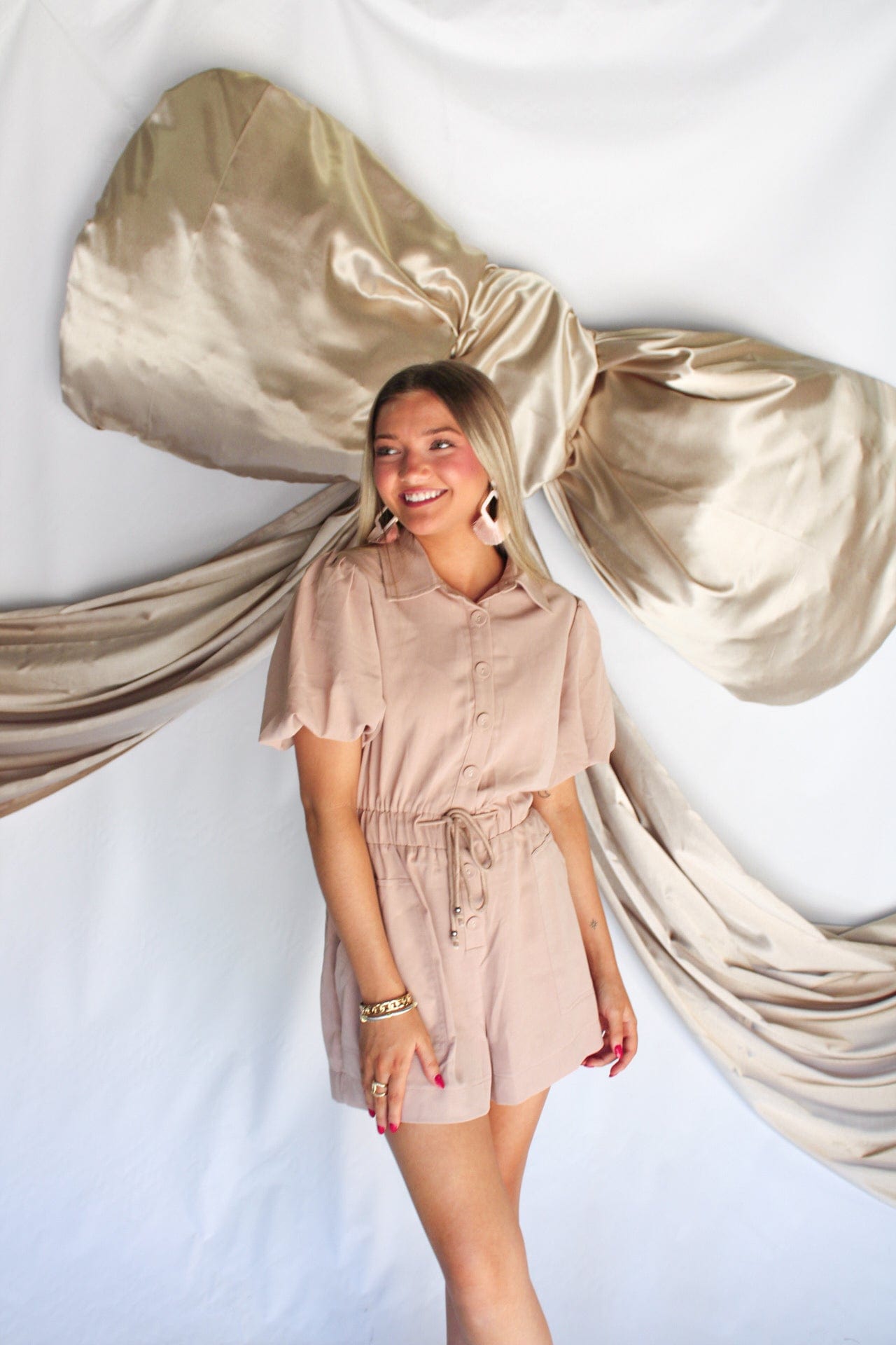 Make a statement in this playful Vanilla Mocha Puff Romper! Featuring a collared neck, a drawstring waist for a secure fit, and voluminous puff sleeves for an extra-sweet touch. A perfect mix of comfy and chic for any occasion.