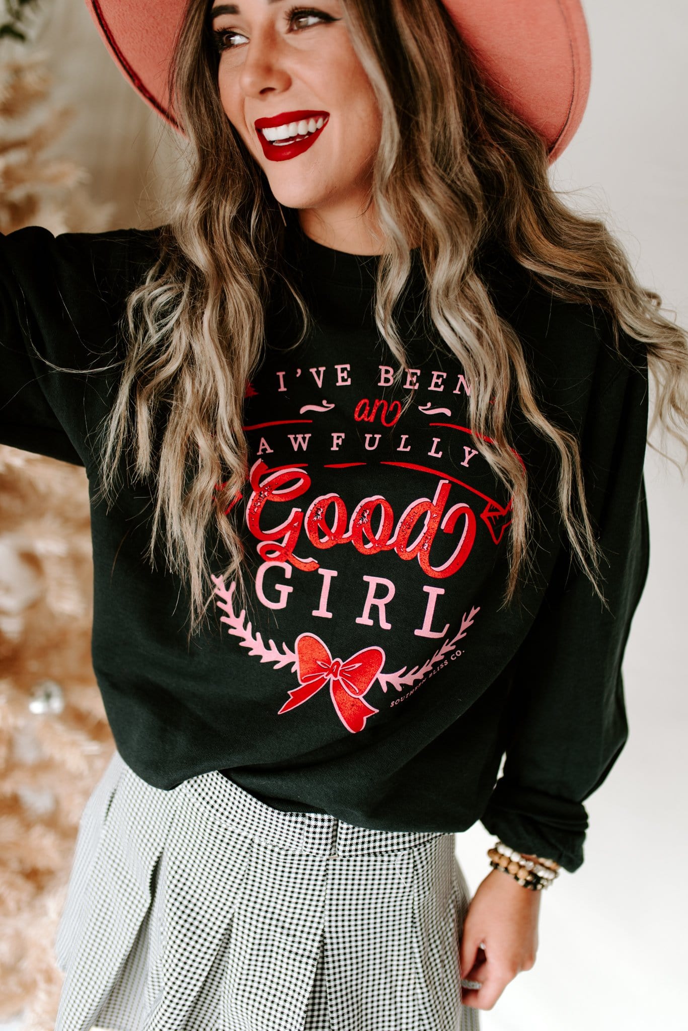 Embrace your perfectly imperfect side with this cheeky black sweatshirt that celebrates being delightfully naughty. Soft, cozy, and unapologetically fun, it's the perfect piece for anyone who knows that being "awfully good" is way more interesting. Whether you're lounging at home or making a bold statement out and about, this sweatshirt pairs effortlessly with your favorite jeans or leggings. Comfort meets attitude in one irresistible package.