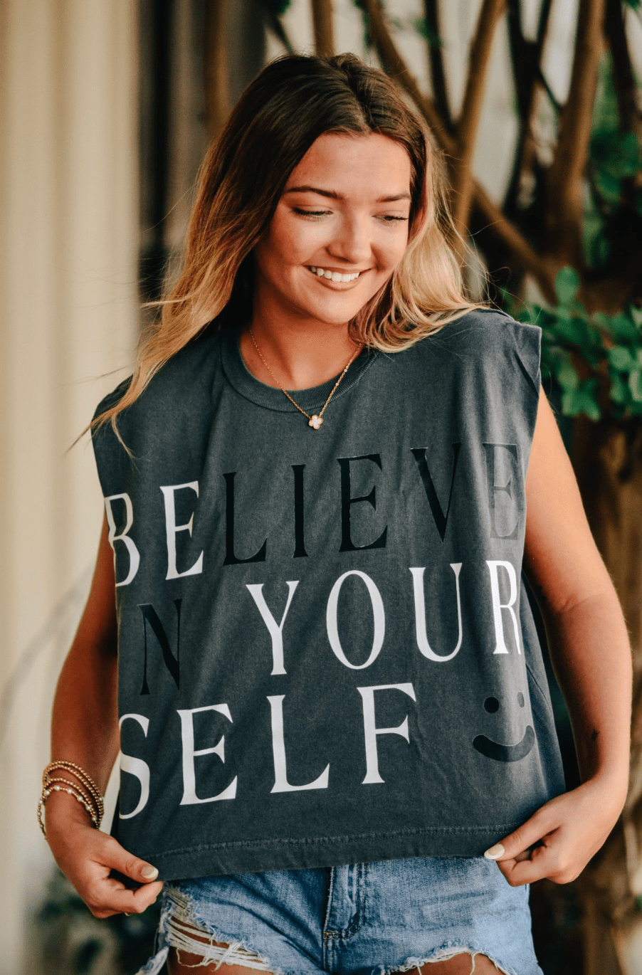 Make a bold statement in effortless style. This faded black muscle tee features "BELIEVE IN YOURSELF" in large, bold lettering across the front—a powerful reminder to own your confidence. With its relaxed fit, raw-edge armholes, and vintage-washed fabric, this tee delivers both comfort and edge. Perfect for layering or rocking solo, it’s your new go-to for workouts, weekends, or whenever you need a boost of badass energy.