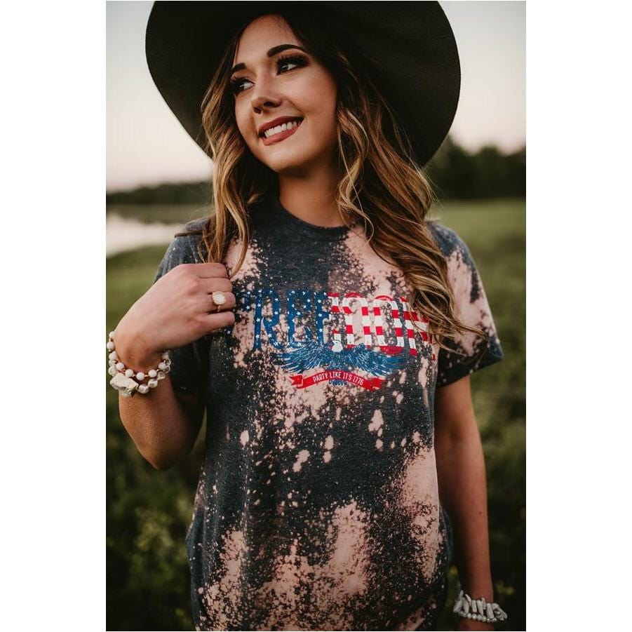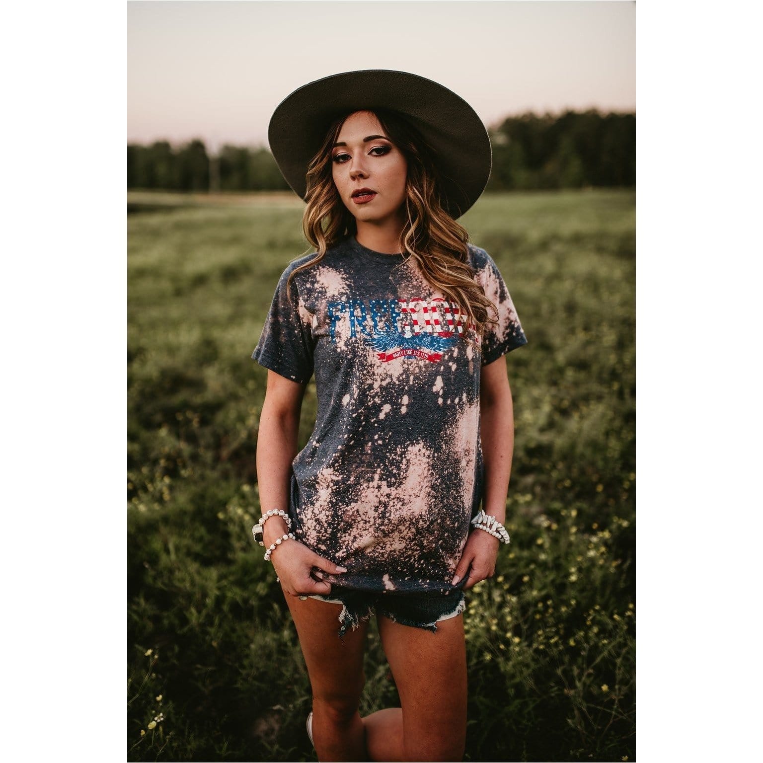 Party like it's 1776! Your favorite patriotic item is available in 3 styles: tee, distressed tee, and high neck tank. Choose one or all 3! With the flag eagle print you can show your true colors in style.