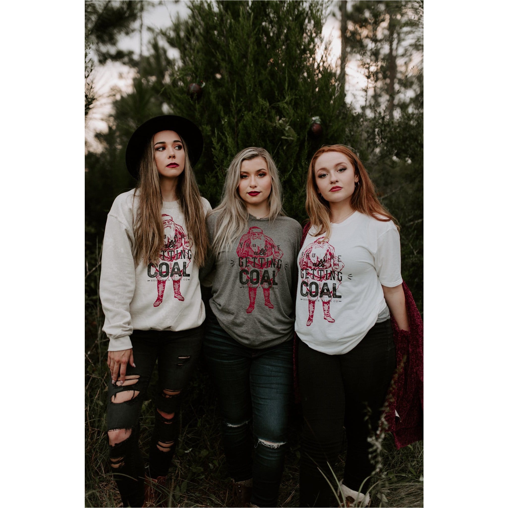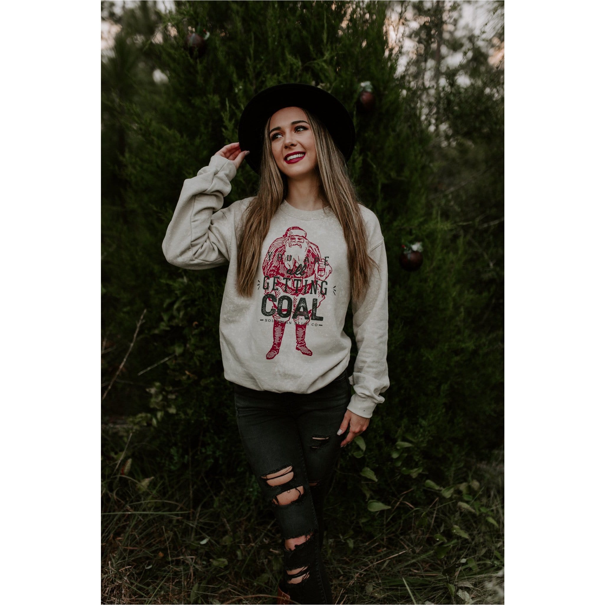 Own your naughty side with this Getting Coal Santa Sand Bleached Sweatshirt. Bleached graphics celebrate the rebels and rule-breakers on sand-colored fabric, delivering irreverent holiday humor with serious style. Perfect for those who laugh in the face of tradition, this sweatshirt pairs witty attitude with cozy comfort. Wear it loud—Christmas just got a lot more interesting.