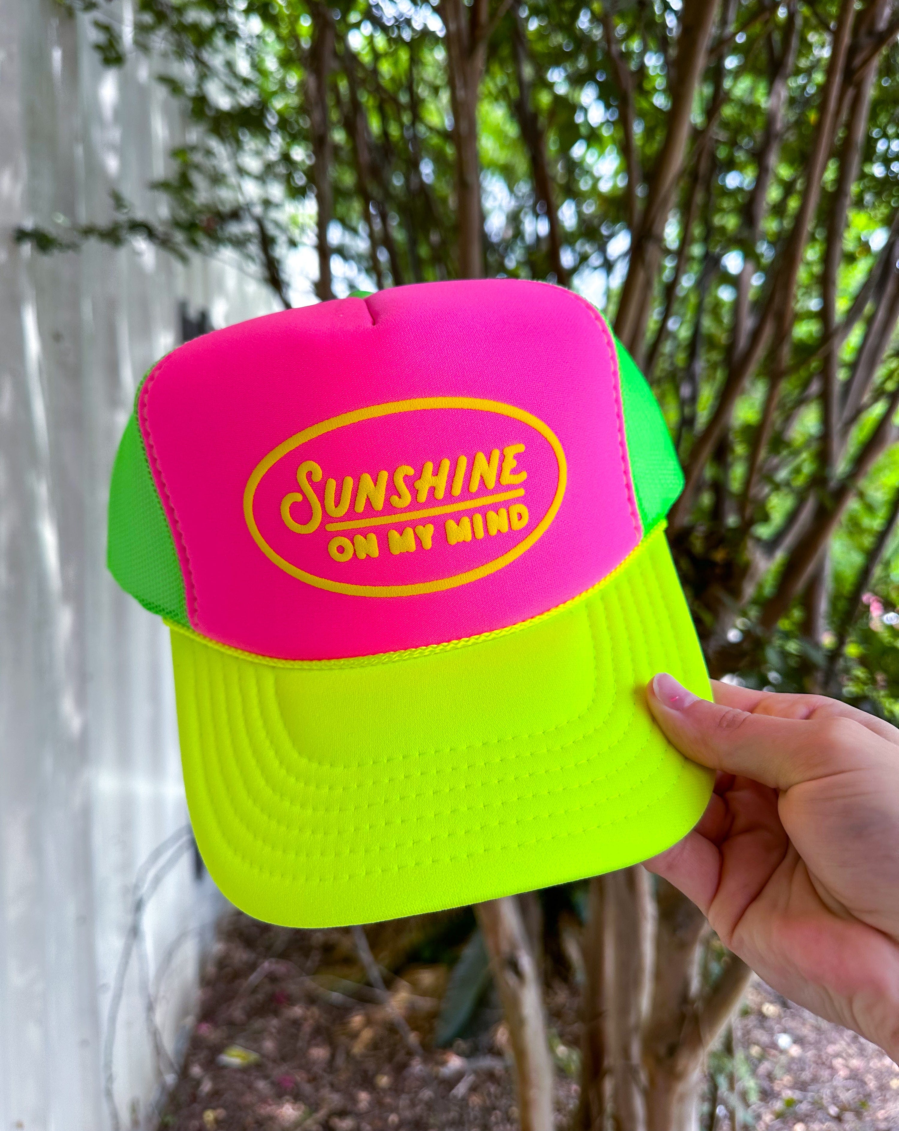 Bright, bold, and made for sunny days—our Sunshine on My Mind multi-color foam trucker hat is your ultimate warm-weather accessory. Featuring a vibrant hot pink front panel with neon yellow lettering, a playful lime green mesh back for breathability, and a matching neon yellow bill that pops, this hat radiates good vibes. Finished with a neon orange snapback for an adjustable, all-day comfortable fit, it’s perfect for beach trips, poolside lounging, or simply chasing the sun wherever you go.