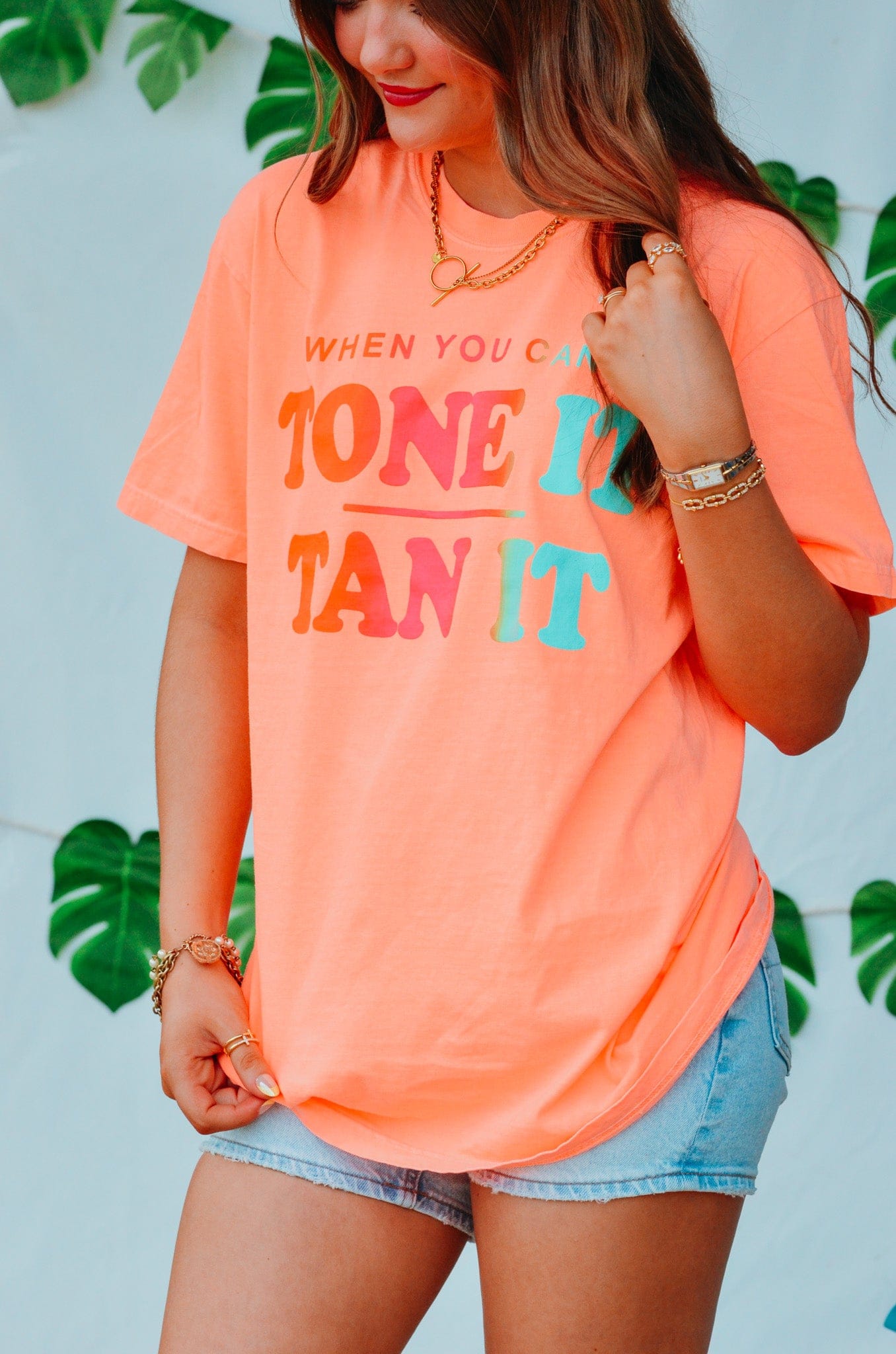 Rock your summer style with this hilarious neon orange tee that screams confidence and fun. When you can't tone it, tan it—this playful design captures that carefree summer spirit perfectly. Crafted from soft, breathable fabric, it keeps you comfortable whether you're hitting the beach, catching rays, or just living your best life. The vibrant neon hue turns heads and spreads laughs wherever you go. Your new favorite casual essential for sun-soaked days and good times.