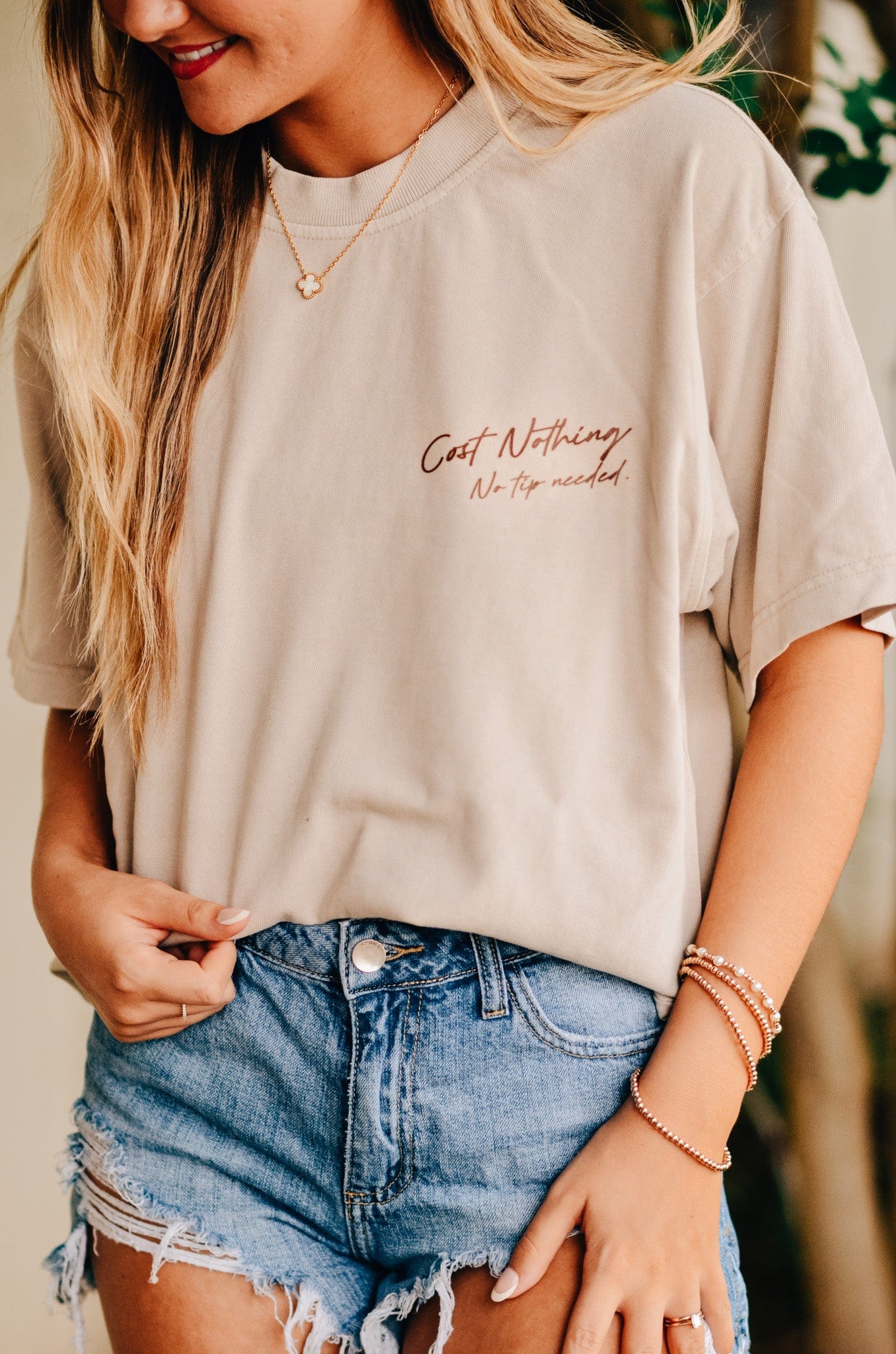 Kindness is always in style. The Guest Check Mock Neck Tee brings a dose of positivity with a fun twist. In soft tan, this tee features a guest check graphic that reads "Kindness Matters & It's Free" — because spreading good vibes costs nothing. The front chest print, "Cost Nothing. No Tip Needed," serves as a reminder that small acts of kindness can make a big impact. With a sleek mock neck and comfy fit, it’s the perfect way to wear your heart on your sleeve — literally.