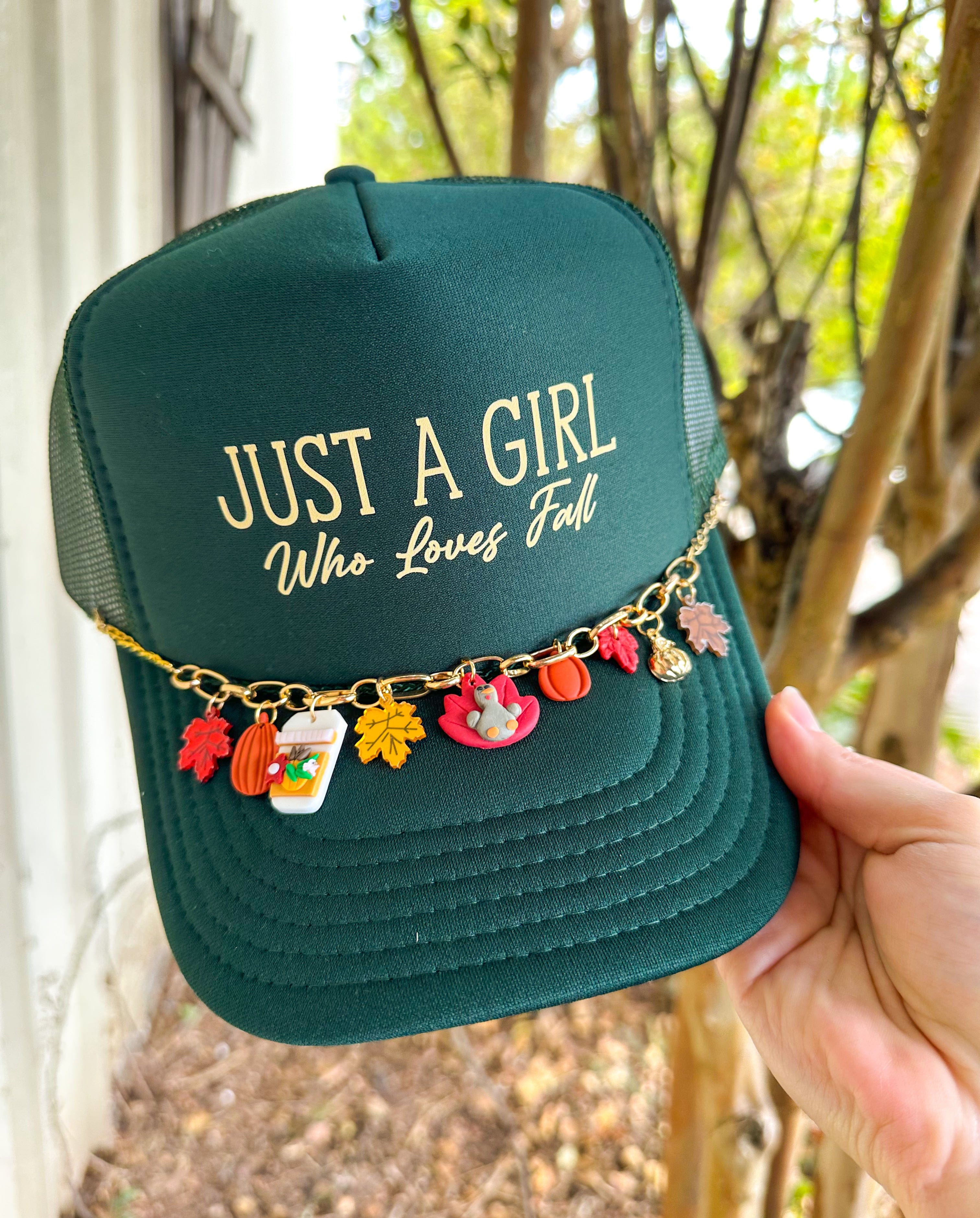 Just A Girl Who Loves Fall With Charm Chain Dark Green Trucker