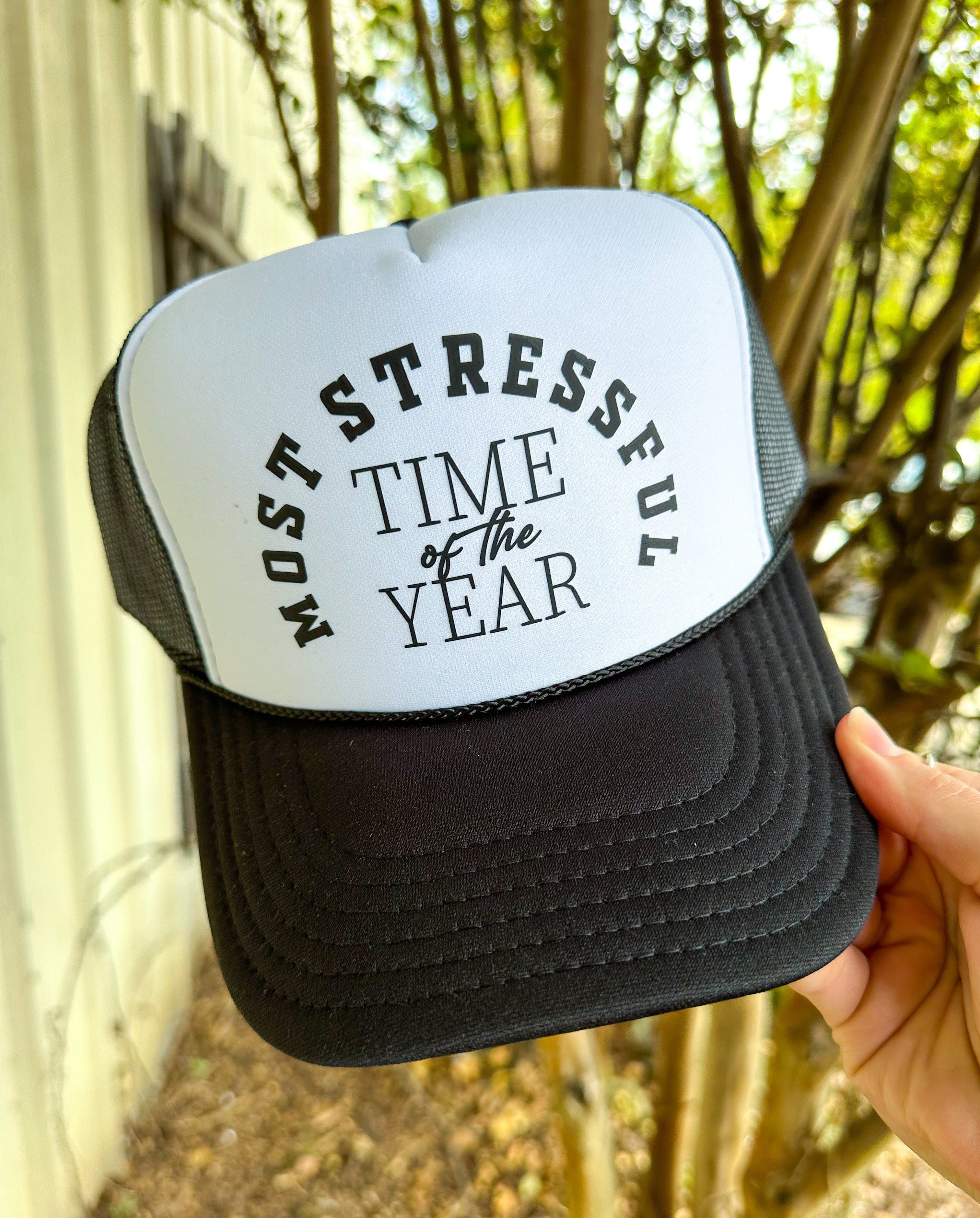 Most Stressful Time Of The Year Black & White Trucker Hat