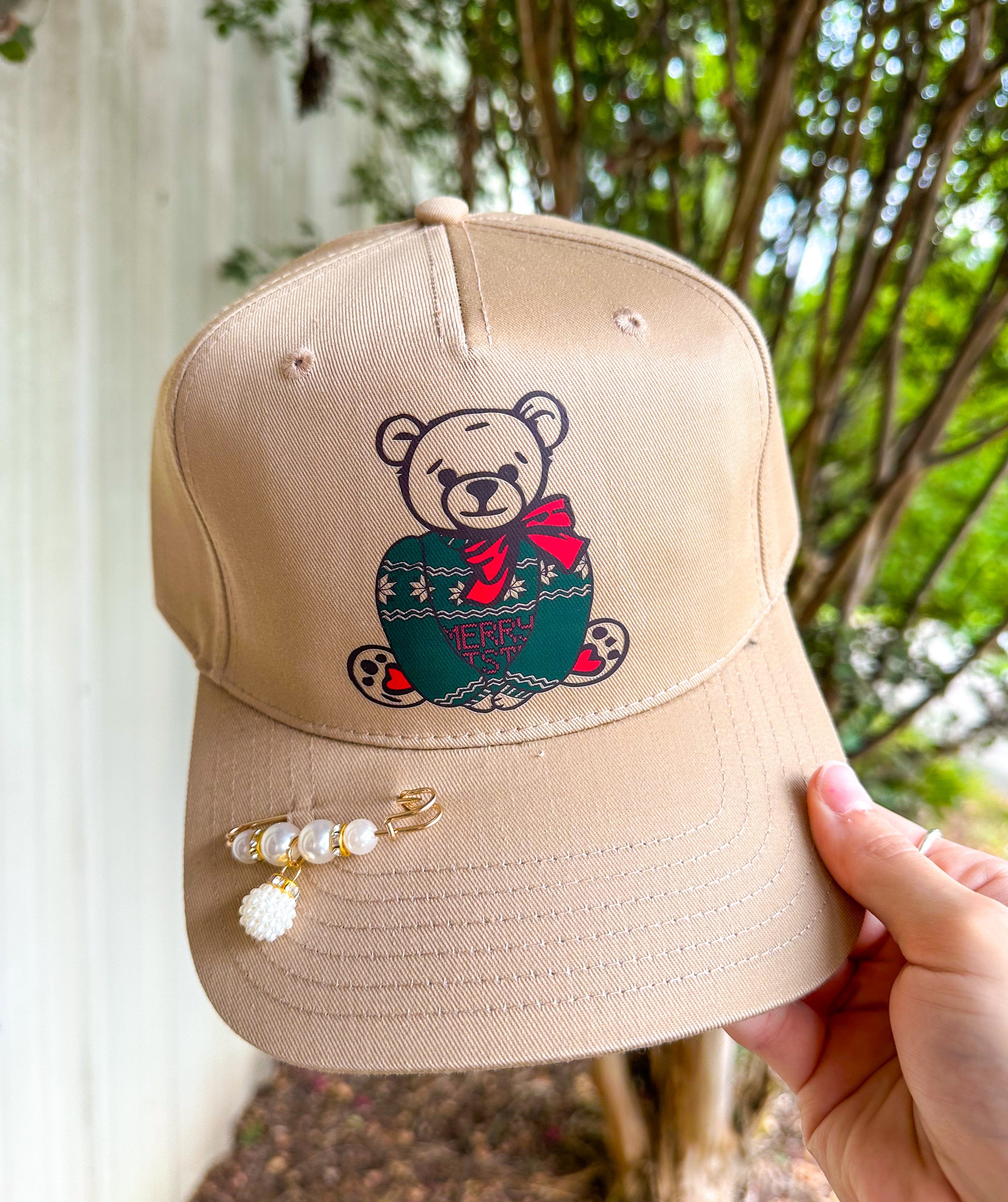 This Christmas teddy bear trucker hat is the perfect accessory for the holiday season. With a solid tan canvas design and a cute teddy bear pin, it adds a festive touch to any outfit. Stay stylish and celebrate the holidays with this unique hat.