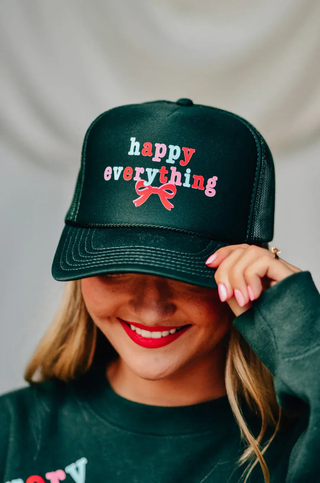 Happy Everything Bow Dark Green Trucker
