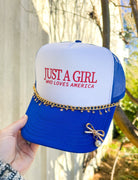 Just A Girl America With Chain & Bow Pin White & Blue Trucker