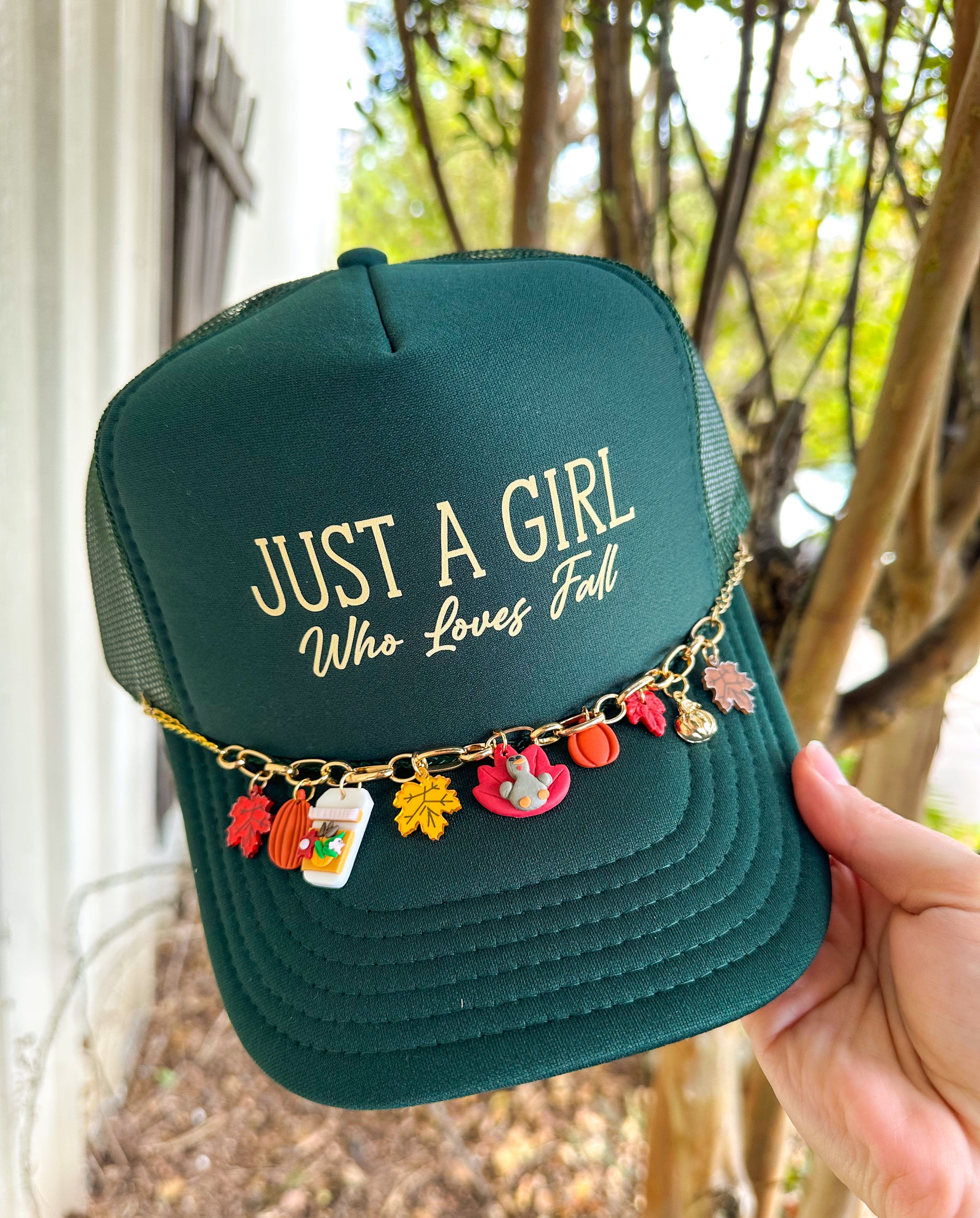 Just A Girl Who Loves Fall With Charm Chain Dark Green Trucker